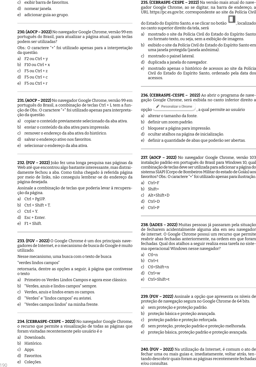 <p>190</p><p>c) exibir barra de favoritos.</p><p>d) nomear janela.</p><p>e) adicionar guia ao grupo.</p><p>230. (AOCP – 2022) No navegador Google Chrome, versão 99 em</p><p>português do Brasil, para atualizar a página atual, quais teclas</p><p>podem ser utilizadas?</p><p>Obs.: O caractere “+” foi utilizado apenas para a interpretação</p><p>da questão.</p><p>a) F2 ou Ctrl + y</p><p>b) F10 ou Ctrl + x</p><p>c) F5 ou Ctrl + z</p><p>d) F5 ou Ctrl + c</p><p>e) F5 ou Ctrl + r</p><p>231. (AOCP – 2022) No navegador Google Chrome, versão 99 em</p><p>português do Brasil, a combinação de teclas Ctrl + L tem a fun-</p><p>ção de Obs.: O caractere “+” foi utilizado apenas para interpreta-</p><p>ção da questão.</p><p>a) copiar o conteúdo previamente selecionado da aba ativa.</p><p>b) enviar o conteúdo da aba ativa para impressão.</p><p>c) remover o endereço da aba ativa do histórico.</p><p>d) salvar o endereço ativo nos favoritos.</p><p>e) selecionar o endereço da aba ativa.</p><p>232. (FGV – 2022) João fez uma longa pesquisa nas páginas da</p><p>Web até que encontrou algo bastante interessante, mas distrai-</p><p>damente fechou a aba. Como tinha chegado à referida página</p><p>por meio de links, não conseguiu lembrar-se do endereço da</p><p>página desejada.</p><p>Assinale a combinação de teclas que poderia levar à recupera-</p><p>ção da página.</p><p>a) Ctrl + PgUP.</p><p>b) Ctrl + Shift + T.</p><p>c) Ctrl + Y.</p><p>d) Esc + Enter.</p><p>e) F1 + Shift.</p><p>233. (FGV – 2022) O Google Chrome é um dos principais nave-</p><p>gadores de Internet, e o mecanismo de busca do Google é muito</p><p>utilizado.</p><p>Nesse mecanismo, uma busca com o texto de busca</p><p>“verdes lindos campos”</p><p>retornaria, dentre as opções a seguir, à página que contivesse</p><p>o texto</p><p>a) Primeiro os Verdes Lindos Campos e agora esse clássico.</p><p>b) “Verdes, azuis e lindos campos” sempre.</p><p>c) Verdes, azuis e lindos eram os campos.</p><p>d) “Verdes” e “lindos campos” eu avistei.</p><p>e) “Verdes campos lindos” na minha frente.</p><p>234. (CEBRASPE-CESPE – 2022) No navegador Google Chrome,</p><p>o recurso que permite a visualização de todas as páginas que</p><p>foram visitadas recentemente pelo usuário é o</p><p>a) Downloads.</p><p>b) Histórico.</p><p>c) Apps.</p><p>d) Favoritos.</p><p>e) Coleções.</p><p>235. (CEBRASPE-CESPE – 2022) Na versão mais atual do nave-</p><p>gador Google Chrome, ao se digitar, na barra de endereço, a</p><p>URL https://pc.es.gov.br, correspondente ao site da Polícia Civil</p><p>do Estado do Espírito Santo, e se clicar no botão , localizado</p><p>no canto superior direito da tela, será</p><p>a) mostrado o site da Polícia Civil do Estado do Espírito Santo</p><p>no formato texto, ou seja, sem a exibição de imagens.</p><p>b) exibido o site da Polícia Civil do Estado do Espírito Santo em</p><p>uma janela protegida (janela anônima).</p><p>c) mostrado o painel lateral.</p><p>d) duplicada a janela do navegador.</p><p>e) mostrado apenas o histórico de acessos ao site da Polícia</p><p>Civil do Estado do Espírito Santo, ordenado pela data dos</p><p>acessos.</p><p>236. (CEBRASPE-CESPE – 2022) Ao abrir o programa de nave-</p><p>gação Google Chrome, será exibida no canto inferior direito a</p><p>opção , a qual permite ao usuário</p><p>a) alterar o tamanho da fonte.</p><p>b) definir um zoom padrão.</p><p>c) bloquear a página para impressão.</p><p>d) ocultar atalhos na página de inicialização.</p><p>e) definir a quantidade de abas que poderão ser abertas.</p><p>237. (AOCP – 2022) No navegador Google Chrome, versão 103</p><p>instalação padrão em português do Brasil para Windows 10, qual</p><p>combinação de teclas deve ser utilizada para adicionar a página do</p><p>sistema SIAPI (Corpo de Bombeiros Militar do estado de Goiás) aos</p><p>favoritos? Obs.: O caractere “+” foi utilizado apenas para ilustração.</p><p>a) Ctrl+F</p><p>b) Shift+</p><p>c) Alt+Shift+D</p><p>d) Ctrl+D</p><p>e) Ctrl+P</p><p>238. (IADES – 2022) Muitas pessoas já passaram pela situação</p><p>de fecharem acidentalmente alguma aba em seu navegador</p><p>de internet. O Google Chrome possui um recurso que permite</p><p>reabrir abas fechadas anteriormente, na ordem em que foram</p><p>fechadas. Qual dos atalhos a seguir realiza essa tarefa no siste-</p><p>ma operacional Windows nesse navegador?</p><p>a) Ctl+n</p><p>b) Ctrl+t</p><p>c) Ctl+Shift+n</p><p>d) Ctrl+w</p><p>e) Ctrl+Shift+t</p><p>239. (FGV – 2022) Assinale a opção que apresenta os níveis de</p><p>proteção de navegação segura no Google Chrome de 64 bits.</p><p>a) sem proteção e proteção padrão.</p><p>b) proteção básica e proteção avançada.</p><p>c) proteção padrão e proteção reforçada.</p><p>d) sem proteção, proteção padrão e proteção melhorada.</p><p>e) proteção básica, proteção padrão e proteção avançada.</p><p>240. (FGV – 2022) Na utilização da Internet, é comum o ato de</p><p>fechar uma ou mais guias e, imediatamente, voltar atrás, ten-</p><p>tando descobrir quais foram as páginas recentemente fechadas</p><p>e/ou consultas.</p><p>O conteúdo deste livro eletrônico é licenciado para Natalia Feijó Ribeiro - 096.457.457-80, vedada, por quaisquer meios e a qualquer título, a</p><p>sua reprodução, cópia, divulgação ou distribuição, sujeitando-se aos infratores à responsabilização civil e criminal.</p>