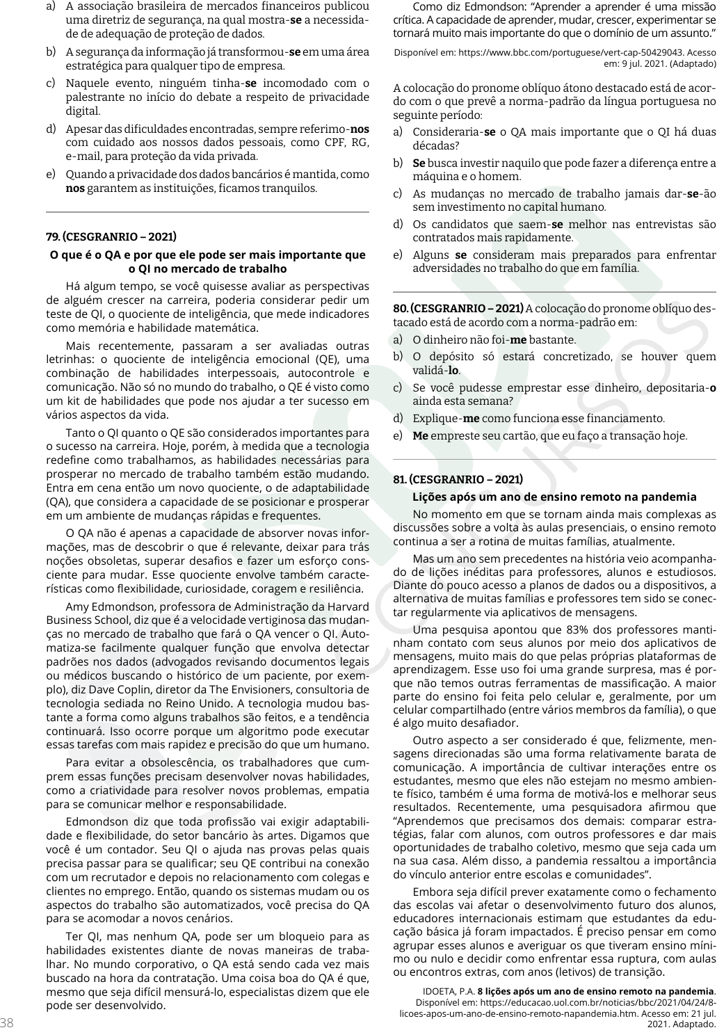 <p>Raq</p><p>uel</p><p>Mio</p><p>rin</p><p>-</p><p>02</p><p>5.8</p><p>04</p><p>.55</p><p>0-</p><p>78</p><p>38</p><p>a) A associação brasileira de mercados financeiros publicou</p><p>uma diretriz de segurança, na qual mostra-se a necessida-</p><p>de de adequação de proteção de dados.</p><p>b) A segurança da informação já transformou-se em uma área</p><p>estratégica para qualquer tipo de empresa.</p><p>c) Naquele evento, ninguém tinha-se incomodado com o</p><p>palestrante no início do debate a respeito de privacidade</p><p>digital.</p><p>d) Apesar das dificuldades encontradas, sempre referimo-nos</p><p>com cuidado aos nossos dados pessoais, como CPF, RG,</p><p>e-mail, para proteção da vida privada.</p><p>e) Quando a privacidade dos dados bancários é mantida, como</p><p>nos garantem as instituições, ficamos tranquilos.</p><p>79. (CESGRANRIO – 2021)</p><p>O que é o QA e por que ele pode ser mais importante que</p><p>o QI no mercado de trabalho</p><p>Há algum tempo, se você quisesse avaliar as perspectivas</p><p>de alguém crescer na carreira, poderia considerar pedir um</p><p>teste de QI, o quociente de inteligência, que mede indicadores</p><p>como memória e habilidade matemática.</p><p>Mais recentemente, passaram a ser avaliadas outras</p><p>letrinhas: o quociente de inteligência emocional (QE), uma</p><p>combinação de habilidades interpessoais, autocontrole e</p><p>comunicação. Não só no mundo do trabalho, o QE é visto como</p><p>um kit de habilidades que pode nos ajudar a ter sucesso em</p><p>vários aspectos da vida.</p><p>Tanto o QI quanto o QE são considerados importantes para</p><p>o sucesso na carreira. Hoje, porém, à medida que a tecnologia</p><p>redefine como trabalhamos, as habilidades necessárias para</p><p>prosperar no mercado de trabalho também estão mudando.</p><p>Entra em cena então um novo quociente, o de adaptabilidade</p><p>(QA), que considera a capacidade de se posicionar e prosperar</p><p>em um ambiente de mudanças rápidas e frequentes.</p><p>O QA não é apenas a capacidade de absorver novas infor-</p><p>mações, mas de descobrir o que é relevante, deixar para trás</p><p>noções obsoletas, superar desafios e fazer um esforço cons-</p><p>ciente para mudar. Esse quociente envolve também caracte-</p><p>rísticas como flexibilidade, curiosidade, coragem e resiliência.</p><p>Amy Edmondson, professora de Administração da Harvard</p><p>Business School, diz que é a velocidade vertiginosa das mudan-</p><p>ças no mercado de trabalho que fará o QA vencer o QI. Auto-</p><p>matiza-se facilmente qualquer função que envolva detectar</p><p>padrões nos dados (advogados revisando documentos legais</p><p>ou médicos buscando o histórico de um paciente, por exem-</p><p>plo), diz Dave Coplin, diretor da The Envisioners, consultoria de</p><p>tecnologia sediada no Reino Unido. A tecnologia mudou bas-</p><p>tante a forma como alguns trabalhos são feitos, e a tendência</p><p>continuará. Isso ocorre porque um algoritmo pode executar</p><p>essas tarefas com mais rapidez e precisão do que um humano.</p><p>Para evitar a obsolescência, os trabalhadores que cum-</p><p>prem essas funções precisam desenvolver novas habilidades,</p><p>como a criatividade para resolver novos problemas, empatia</p><p>para se comunicar melhor e responsabilidade.</p><p>Edmondson diz que toda profissão vai exigir adaptabili-</p><p>dade e flexibilidade, do setor bancário às artes. Digamos que</p><p>você é um contador. Seu QI o ajuda nas provas pelas quais</p><p>precisa passar para se qualificar; seu QE contribui na conexão</p><p>com um recrutador e depois no relacionamento com colegas e</p><p>clientes no emprego. Então, quando os sistemas mudam ou os</p><p>aspectos do trabalho são automatizados, você precisa do QA</p><p>para se acomodar a novos cenários.</p><p>Ter QI, mas nenhum QA, pode ser um bloqueio para as</p><p>habilidades existentes diante de novas maneiras de traba-</p><p>lhar. No mundo corporativo, o QA está sendo cada vez mais</p><p>buscado na hora da contratação. Uma coisa boa do QA é que,</p><p>mesmo que seja difícil mensurá-lo, especialistas dizem que ele</p><p>pode ser desenvolvido.</p><p>Como diz Edmondson: “Aprender a aprender é uma missão</p><p>crítica. A capacidade de aprender, mudar, crescer, experimentar se</p><p>tornará muito mais importante do que o domínio de um assunto.”</p><p>Disponível em: https://www.bbc.com/portuguese/vert-cap-50429043. Acesso</p><p>em: 9 jul. 2021. (Adaptado)</p><p>A colocação do pronome oblíquo átono destacado está de acor-</p><p>do com o que prevê a norma-padrão da língua portuguesa no</p><p>seguinte período:</p><p>a) Consideraria-se o QA mais importante que o QI há duas</p><p>décadas?</p><p>b) Se busca investir naquilo que pode fazer a diferença entre a</p><p>máquina e o homem.</p><p>c) As mudanças no mercado de trabalho jamais dar-se-ão</p><p>sem investimento no capital humano.</p><p>d) Os candidatos que saem-se melhor nas entrevistas são</p><p>contratados mais rapidamente.</p><p>e) Alguns se consideram mais preparados para enfrentar</p><p>adversidades no trabalho do que em família.</p><p>80. (CESGRANRIO – 2021) A colocação do pronome oblíquo des-</p><p>tacado está de acordo com a norma-padrão em:</p><p>a) O dinheiro não foi-me bastante.</p><p>b) O depósito só estará concretizado, se houver quem</p><p>validá-lo.</p><p>c) Se você pudesse emprestar esse dinheiro, depositaria-o</p><p>ainda esta semana?</p><p>d) Explique-me como funciona esse financiamento.</p><p>e) Me empreste seu cartão, que eu faço a transação hoje.</p><p>81. (CESGRANRIO – 2021)</p><p>Lições após um ano de ensino remoto na pandemia</p><p>No momento em que se tornam ainda mais complexas as</p><p>discussões sobre a volta às aulas presenciais, o ensino remoto</p><p>continua a ser a rotina de muitas famílias, atualmente.</p><p>Mas um ano sem precedentes na história veio acompanha