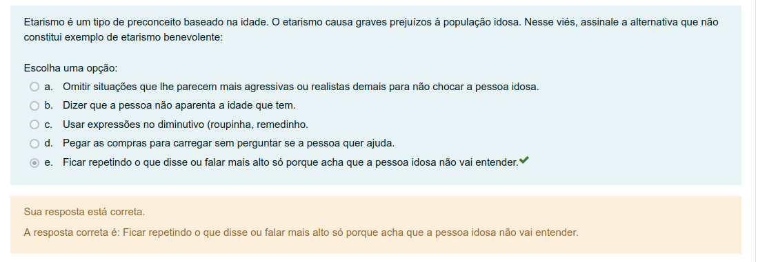Etarismo é um tipo de preconceito baseado na idade. etarismo causa graves prejuízos à população idosa. Nesse viés, assinale a alternativa que não constitui exemplo de etarismo benevolente: Escolha uma opção: a. Omitir situações que lhe parecem mais agressivas ou realistas demais para não chocar a pessoa idosa. b. Dizer que a pessoa não aparenta a idade que tem. Usar expressões no diminutivo (roupinha, remedinho. d. Pegar as compras para carregar sem perguntar se a pessoa quer ajuda. e. Ficar repetindo que disse ou falar mais alto só porque acha que a pessoa idosa não vai entender. Sua resposta está correta. A resposta correta é: Ficar repetindo que disse ou falar mais alto só porque acha que a pessoa idosa não vai entender.