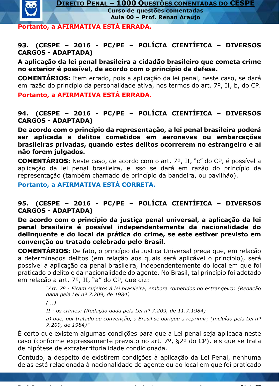 <p>Prof. Renan Araujo www.estrategiaconcursos.com.br 51 de 57</p><p>DIREITO PENAL – 1000 QUESTÕES COMENTADAS DO CESPE</p><p>Curso de questões comentadas</p><p>Aula 00 – Prof. Renan Araujo</p><p>Portanto, a AFIRMATIVA ESTÁ ERRADA.</p><p>93.! (CESPE – 2016 - PC/PE – POLÍCIA CIENTÍFICA – DIVERSOS</p><p>CARGOS - ADAPTADA)</p><p>A aplicação da lei penal brasileira a cidadão brasileiro que cometa crime</p><p>no exterior é possível, de acordo com o princípio da defesa.</p><p>COMENTÁRIOS: Item errado, pois a aplicação da lei penal, neste caso, se dará</p><p>em razão do princípio da personalidade ativa, nos termos do art. 7º, II, b, do CP.</p><p>Portanto, a AFIRMATIVA ESTÁ ERRADA.</p><p>94.! (CESPE – 2016 - PC/PE – POLÍCIA CIENTÍFICA – DIVERSOS</p><p>CARGOS - ADAPTADA)</p><p>De acordo com o princípio da representação, a lei penal brasileira poderá</p><p>ser aplicada a delitos cometidos em aeronaves ou embarcações</p><p>brasileiras privadas, quando estes delitos ocorrerem no estrangeiro e aí</p><p>não forem julgados.</p><p>COMENTÁRIOS: Neste caso, de acordo com o art. 7º, II, “c” do CP, é possível a</p><p>aplicação da lei penal brasileira, e isso se dará em razão do princípio da</p><p>representação (também chamado de princípio da bandeira, ou pavilhão).</p><p>Portanto, a AFIRMATIVA ESTÁ CORRETA.</p><p>95.! (CESPE – 2016 - PC/PE – POLÍCIA CIENTÍFICA – DIVERSOS</p><p>CARGOS - ADAPTADA)</p><p>De acordo com o princípio da justiça penal universal, a aplicação da lei</p><p>penal brasileira é possível independentemente da nacionalidade do</p><p>delinquente e do local da prática do crime, se este estiver previsto em</p><p>convenção ou tratado celebrado pelo Brasil.</p><p>COMENTÁRIOS: De fato, o princípio da Justiça Universal prega que, em relação</p><p>a determinados delitos (em relação aos quais será aplicável o princípio), será</p><p>possível a aplicação da penal brasileira, independentemente do local em que foi</p><p>praticado o delito e da nacionalidade do agente. No Brasil, tal princípio foi adotado</p><p>em relação a art. 7º, II, “a” do CP, que diz:</p><p>“Art. 7º - Ficam sujeitos à lei brasileira, embora cometidos no estrangeiro: (Redação</p><p>dada pela Lei nº 7.209, de 1984)</p><p>(...)</p><p>II - os crimes: (Redação dada pela Lei nº 7.209, de 11.7.1984)</p><p>a) que, por tratado ou convenção, o Brasil se obrigou a reprimir; (Incluído pela Lei nº</p><p>7.209, de 1984)”</p><p>É certo que existem algumas condições para que a Lei penal seja aplicada neste</p><p>caso (conforme expressamente previsto no art. 7º, §2º do CP), eis que se trata</p><p>de hipótese de extraterritorialidade condicionada.</p><p>Contudo, a despeito de existirem condições à aplicação da Lei Penal, nenhuma</p><p>delas está relacionada à nacionalidade do agente ou ao local em que foi praticado</p><p>0</p><p>00000000000 - DEMO</p>