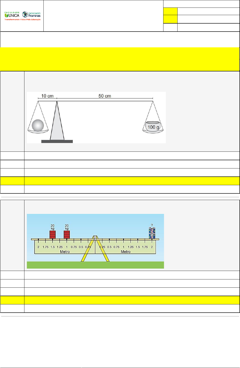 <p>Pincel Atômico - 27/12/2022 12:27:52 1/7</p><p>Avaliação Online (Curso Online - Automático)</p><p>Atividade finalizada em 26/12/2022 19:16:49 (425774 / 1)</p><p>LEGENDA</p><p>Resposta correta na questão</p><p># Resposta correta - Questão Anulada</p><p>X Resposta selecionada pelo Aluno</p><p>Disciplina:</p><p>PRÁTICA PEDAGÓGICA INTERDISCIPLINAR: FÍSICA EXPERIMENTAL [490467] - Avaliação com 10 questões, com o peso total de 30,00 pontos</p><p>[capítulos - Todos]</p><p>Turma:</p><p>Segunda Graduação: Segunda Graduação 6 meses - Licenciatura em Física - Grupo: FPD-FEV2022 - SGegu0A140722 [70420]</p><p>Aluno(a):</p><p>91338416 - BRUNARA LUANA LANDIM - Respondeu 8 questões corretas, obtendo um total de 24,00 pontos como nota</p><p>[357410_1465</p><p>08]</p><p>Questão</p><p>001</p><p>(Encceja 2017) A imagem representa uma balança utilizada para a medida da massa</p><p>de uma fruta. A massa colocada no prato direito da balança é de 100g e o sistema</p><p>encontra-se em equilíbrio.</p><p>A massa dessa fruta, em grama, é</p><p>100.</p><p>600.</p><p>50.</p><p>500.</p><p>120.</p><p>[357410_1465</p><p>13]</p><p>Questão</p><p>002</p><p>Com base na atividade computacional pratica da sessão 6.6 sobre “laborató-rio de</p><p>equilíbrio” da simulação PHET; calcule a massa do objeto misterioso.</p><p>20 kg</p><p>50 kg</p><p>40 kg</p><p>25 kg</p><p>30 kg</p><p>Pincel Atômico - 27/12/2022 12:27:52 2/7</p><p>[357410_1465</p><p>16]</p><p>Questão</p><p>003</p><p>(UFPE-PE - adaptada) Um motorista de caminhão tenta desatarraxar uma das porcas</p><p>que fixa uma roda com uma chave de boca. O ponto de aplicação da força dista 15 cm</p><p>do centro da porca e o módulo da força máxima aplicada é F=400 N. Nesta situação,</p><p>suponha que o motorista está próximo de conseguir desatarraxar a porca. Em seguida,</p><p>o motorista acopla uma extensão à chave de boca, de forma que o novo ponto de</p><p>aplicação da força dista 75 cm do centro da porca, como mostra a figura a seguir.</p><p>Calcule o novo valor do módulo da força em newtons, necessário para que o motorista</p><p>novamente esteja próximo de desatarraxar a porca.</p><p>200 N</p><p>80 N</p><p>75 N</p><p>2000 N</p><p>25 N</p><p>[357410_1465</p><p>07]</p><p>Questão</p><p>004</p><p>UFV-MG) Um menino e uma menina estão brincando sobre uma prancha ho-mogênea,</p><p>conforme ilustra a figura. A posição das crianças estabelece uma condição de</p><p>equilíbrio. Qual a massa do menino?</p><p>35 kg</p><p>25 kg</p><p>30 kg</p><p>45 kg</p><p>20 kg</p><p>[357410_8473</p><p>0]</p><p>Questão</p><p>005</p><p>Calcule o torque resultante sobre uma chave inglesa, sabendo que, a 5cm do eixo de</p><p>rotação, é aplicada uma força de 5N que faz a chave girar no sentido horário e, a 15cm</p><p>do eixo, é aplicada outra força, de 2N, no sentido oposto.</p><p>0,1 Nm</p><p>-0,05 Nm</p><p>-0,5 Nm</p><p>0,05 Nm</p><p>0,5 Nm</p><p>Pincel Atômico - 27/12/2022 12:27:52 3/7</p><p>[357410_1465</p><p>10]</p><p>Questão</p><p>006</p><p>Enem 2015) Em um experimento, um professor levou para a sala de aula um sa-co de</p><p>arroz, um pedaço de madeira triangular e uma barra de ferro cilíndrica e homogênea.</p><p>Ele propôs que fizessem a medição da massa da barra utilizando esses objetos. Para</p><p>isso, os alunos fizeram marcações na barra, dividindo-a em oito partes iguais, e em</p><p>seguida apoiaram-na sobre a base triangular, com o saco de arroz pendurado em uma</p><p>de suas extremidades, até atingir a situação de equilíbrio.</p><p>Nessa situação, qual foi a massa da barra obtida pelos alunos?</p><p>3,00 kg</p><p>5,00 kg</p><p>15,00 kg</p><p>10,00 kg</p><p>3,75 kg</p><p>[357410_8473</p><p>1]</p><p>Questão</p><p>007</p><p>Calcule o torque resultante sobre uma chave de boca, sabendo que a força aplicada é</p><p>de 20N e o braço de alavanca entre o eixo de rotação e o ponto de aplicação da força</p><p>é de 20cm.</p><p>2Nm</p><p>4Nm</p><p>20Nm</p><p>400Nm</p><p>10Nm</p><p>[357412_8473</p><p>6]</p><p>Questão</p><p>008</p><p>Em uma haste rígida e homogênea é montado uma espécie de balança de equilíbrio</p><p>com intuito de se calcular a massa desconhecida de uma caixa. A configuração</p><p>encontrada e ilustrada na figura abaixo:</p><p>Sabendo que a haste encontra-se em equilíbrio, qual a massa dessa caixa</p><p>desconhecida?</p><p>100 kg</p><p>60 kg</p><p>50 kg</p><p>40 kg</p><p>80 kg</p><p>Pincel Atômico - 27/12/2022 12:27:52 4/7</p><p>[360035_1503</p><p>22]</p><p>Questão</p><p>009</p><p>(PUC) O gráfico a seguir mostra a posição, em função do tempo, de dois trens A e B</p><p>que viajam no mesmo sentido em trilhos retilíneos paralelos. O gráfico referente ao</p><p>trem B é um arco de parábola com vértice no instante t1.</p><p>Marque a alternativa correta.</p><p>Ambos os trens têm a mesma aceleração escalar em algum instante anterior a t1.</p><p>X Ambos os trens têm a mesma velocidade escalar em algum instante anterior a t1.</p><p>No instante t1, ambos os trens têm a mesma velocidade escalar.</p><p>Na origem dos tempos, ambos os trens estavam parados.</p><p>Os trens aceleram o tempo todo.</p><p>[360035_1503</p><p>71]</p><p>Questão</p><p>010</p><p>Considere um sistema formado por uma partícula e por uma mola idela, conforme a</p><p>figura. A partícula pode mover-se sobre uma mesa horizontal lisa sob ação da força da</p><p>mola, cuja outra extremidade está presa à mesa. É correto afirmar que:</p><p>X</p><p>O momento angular se conserva porque a reta da ação da força elástica sobre a</p><p>partícula passa pela origem O.</p><p>O sentido da rotação em torno do centro de forças pode mudar a ação da força</p><p>elástica.</p><p>O momento angular não se conserva em consequência da ação da força elástica.</p><p>O trabalho da força elástica é nulo, pois trata-se de uma força conservativa.</p><p>A energia mecânica sempre aumenta porque sempre há energ