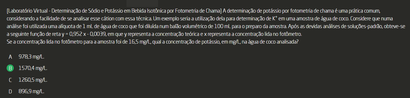 [Laboratório Virtual - Determinação de Sódio e Potássio em Bebida Isotônica por Fotometria de Chama] A determinação de potássio por fotometria de chama é uma prática comum, considerando a facilidade de se analisar esse cátion com essa técnica. Um exemplo seria a utilização dela para determinação de K+ em uma amostra de água de Considere que numa análise foi utilizada uma alíquota de 1 ml de água de que foi diluída num balão volumétrico de 100 mL para 0 preparo da amostra. Após as devidas análises de obteve-se a seguinte função de reta y = 0,952 - 0,0039, em que y representa a concentração teórica e representa a concentração lida no Se a concentração lida no fotômetro para a amostra foi de 16,5 mg/L, qual a concentração de potássio, em mg/L, na água de COCO analisada? A 978,3 mg/L. B 1570,4 mg/L. C 1260,5 D 896,9 mg/L.