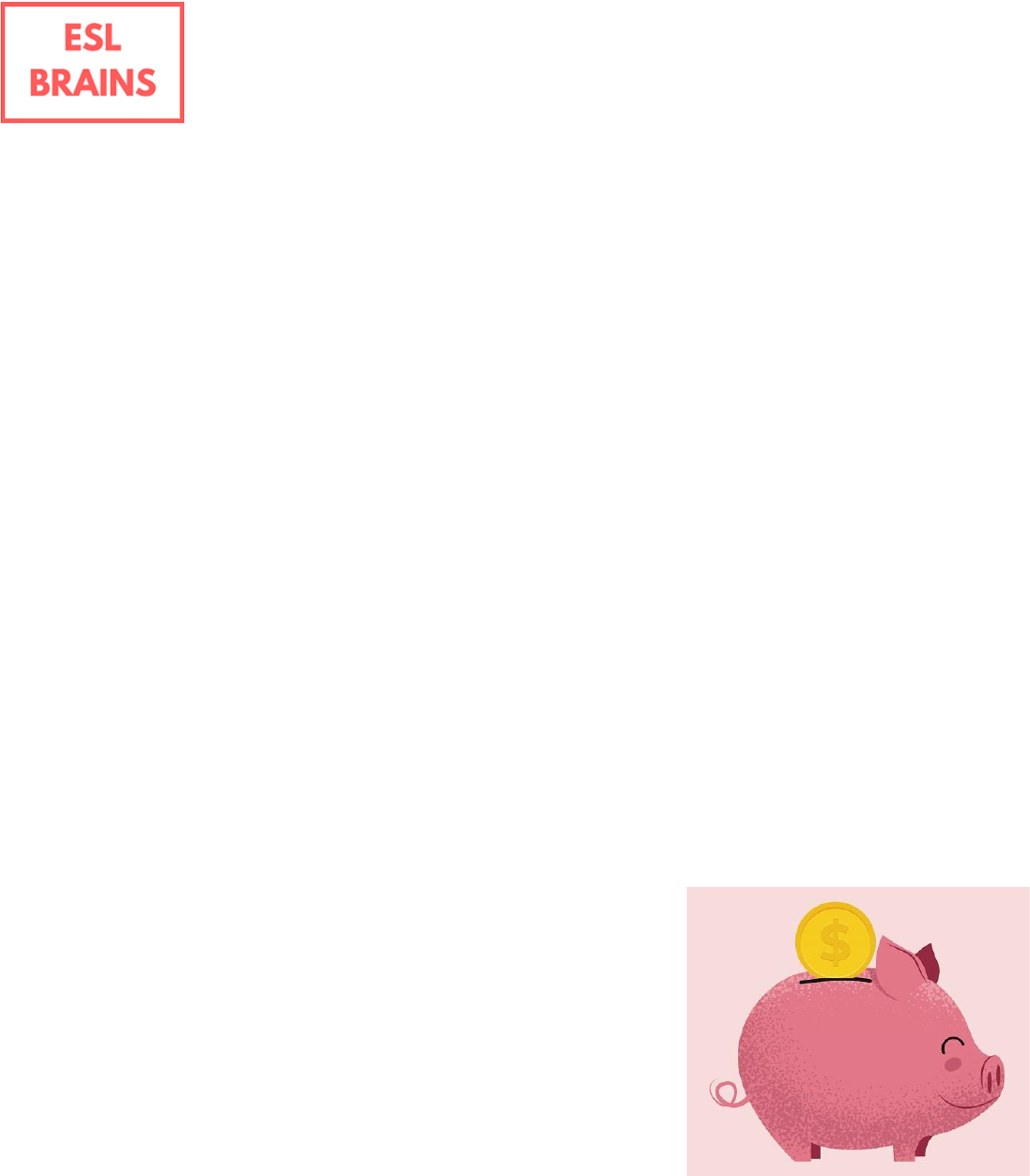 <p>Are you a saver or a spender?</p><p>Copyrights by ESL Brains</p><p>1. Complete the sentences with the correct prepositions.</p><p>a) We’re spending a lot more ………… food than we used to.</p><p>b) We can always borrow some money ………… the bank.</p><p>c) Don't waste your money ………… such purchases.</p><p>d) Banks are willing to lend large amounts of money ………… people starting up</p><p>businesses.</p><p>e) I’m going to invest my savings ………… this project.</p><p>f) How can I cut down ………… clothing costs?</p><p>2. Where does your money normally go? Discuss which of these things you</p><p>spend the most money on.</p><p>• ordering takeaways (BrE) /</p><p>takeout (AmE)</p><p>• paying utility bills</p><p>• going out with friends</p><p>• grocery shopping</p><p>• transportation</p><p>• clothes</p><p>• holidays</p><p>• renting a room or a flat</p><p>3. Match the words and phrases in bold to the correct meanings below.</p><p>a) I feel that I sometimes overspend on</p><p>1) coffee.</p><p>2) eating out.</p><p>3) entertainment.</p><p>b) When I do the shopping,</p><p>1) I have a list of items I need.</p><p>2) I remember what I should buy.</p><p>3) I think, while I’m in the shop, about what I want</p><p>to buy.</p><p>c) When I buy online,</p><p>1) I spend time looking for the best deals.</p><p>2) I only buy from one shop because I know and trust it.</p><p>3) I buy much more than I need.</p><p>Are you a saver or a spender?</p><p>Copyrights by ESL Brains</p><p>d) To keep myself on budget,</p><p>1) I write down all of my purchases.</p><p>2) I cut down on some expenses at the end of the month.</p><p>3) I use cash instead of a credit card.</p><p>e) You want to save some money. You know that you waste too much money on</p><p>petrol driving to work. The most cost-effective means of transport would be a</p><p>bike. What do you do?</p><p>1) I bike to work.</p><p>2) I save on other things because I love driving.</p><p>3) I find a colleague to drive with and share petrol costs.</p><p>f) You are going to buy some groceries, but you enter a clothes shop and see an</p><p>amazing pair of jeans for $100. What do you do?</p><p>1) I buy them on impulse.</p><p>2) I already have so many pairs of jeans, so I don’t buy them.</p><p>3) I take a photo and wait until the sales.</p><p>g) You want to go to your friend’s house by Uber. If you take an Uber now, you’ll</p><p>be charged more, but if you wait, the price might be cheaper. What do you</p><p>do?</p><p>1) I go now because I don’t want to wait.</p><p>2) I wait a couple of minutes to spend less money.</p><p>3) I decide to use public transport and arrive a bit later.</p><p>h) What trade-off would you accept if you wanted to save money for a holiday?</p><p>1) Not ordering takeout for one year.</p><p>2) Cycling instead of driving to work for half a year.</p><p>3) Partying at home instead of going out for half a year.</p><p>Are you a saver or a spender?</p><p>Copyrights by ESL Brains</p><p>MEANINGS:</p><p>1) it means that something is good value for the amount of money paid</p><p>2) a compromise</p><p>3) ask an amount of money for something</p><p>4) an individual thing</p><p>5) spend more money than you should or more than you wanted to</p><p>6) because you suddenly want to, although you haven't planned to</p><p>7) spend only as much money as you have</p><p>8) a good, or lower than usual, price</p><p>9) a cost</p><p>4. Now, do the quiz and explain your answers.</p><p>What might the results of the quiz say about your spending habits?</p><p>5. Look at four images below. How can you save some money in these areas?</p><p>SHOPPING HOME TRANSPORTATION ENTERTAINMENT</p><p>6. Watch an interactive video [https://eslbrains.com/interactive-saver-spender]</p><p>and answer the questions that will appear on the screen.</p><p>https://eslbrains.com/interactive-saver-spender</p><p>Are you a saver or a spender?</p><p>Copyrights by ESL Brains</p><p>7. Complete the gaps with the words in the box. Then, discuss the sentences</p><p>in pairs.</p><p>a) Buying things on ………………… is something spenders often do.</p><p>b) It’s important to save money on everyday ………………… .</p><p>c) Look for ways to save on the things that are less important to you, to keep</p><p>yourself on ………………… .</p><p>d) When you go shopping always look for ………………… , but don’t buy things</p><p>which are not on your shopping list.</p><p>e) The best way to save money is to write down how you spend your money in a</p><p>month and ………………… down on some big expenses.</p><p>f) Public transport isn’t a very method of transport if you have a family.</p><p>budget cost-effective cut discounts expenses impulse</p>