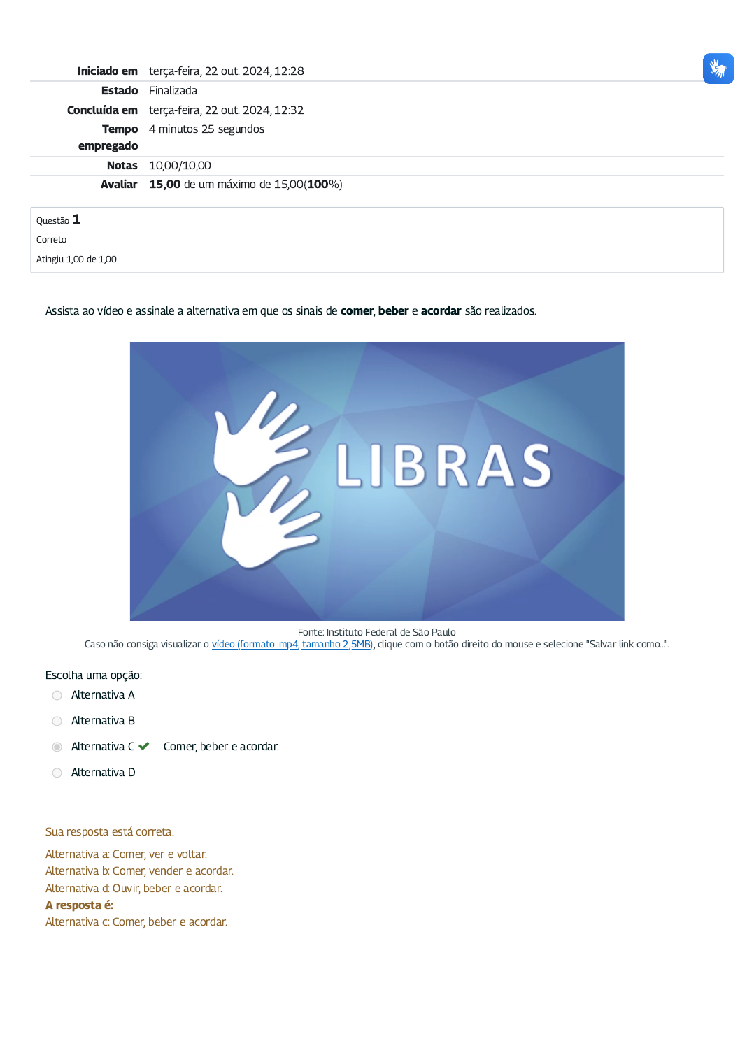 <p>Iniciado em terça-feira, 22 out. 2024, 12:28</p><p>Estado Finalizada</p><p>Concluída em terça-feira, 22 out. 2024, 12:32</p><p>Tempo</p><p>empregado</p><p>4 minutos 25 segundos</p><p>Notas 10,00/10,00</p><p>Avaliar 15,00 de um máximo de 15,00(100%)</p><p>Questão 1</p><p>Correto</p><p>Atingiu 1,00 de 1,00</p><p>Assista ao vídeo e assinale a alternativa em que os sinais de comer, beber e acordar são realizados.</p><p>Fonte: Instituto Federal de São Paulo</p><p>Caso não consiga visualizar o vídeo (formato .mp4, tamanho 2,5MB), clique com o botão direito do mouse e selecione "Salvar link como...".</p><p>Escolha uma opção:</p><p>Alternativa A</p><p>Alternativa B</p><p>Alternativa C Comer, beber e acordar.</p><p>Alternativa D</p><p>Sua resposta está correta.</p><p>Alternativa a: Comer, ver e voltar.</p><p>Alternativa b: Comer, vender e acordar.</p><p>Alternativa d: Ouvir, beber e acordar.</p><p>A resposta é:</p><p>Alternativa c: Comer, beber e acordar.</p><p>https://cdn.escolavirtual.gov.br/libras/v1/licoes/modulo06licao01.mp4</p><p>Questão 2</p><p>Correto</p><p>Atingiu 1,00 de 1,00</p><p>Assista ao vídeo e assinale a alternativa em que os sinais de chorar, rezar e casar são realizados.</p><p>Fonte: Instituto Federal de São Paulo</p><p>Caso não consiga visualizar o vídeo (formato .mp4, tamanho 3,9MB), clique com o botão direito do mouse e selecione "Salvar link como...".</p><p>Escolha uma opção:</p><p>Alternativa A</p><p>Alternativa B Chorar, rezar e casar.</p><p>Alternativa C</p><p>Alternativa D</p><p>Sua resposta está correta.</p><p>Alternativa a: Chorar, rezar e explicar.</p><p>Alternativa c: Chorar, rezar e ler.</p><p>Alternativa d: Chorar, ter e casar.</p><p>A resposta é:</p><p>Alternativa b: Chorar, rezar e casar.</p><p>https://cdn.escolavirtual.gov.br/libras/v1/licoes/modulo06licao02.mp4</p><p>Questão 3</p><p>Correto</p><p>Atingiu 1,00 de 1,00</p><p>Assista ao vídeo e assinale a alternativa em que o sinal de correr é realizado.</p><p>Fonte: Instituto Federal de São Paulo</p><p>Caso não consiga visualizar o vídeo (formato .mp4, tamanho 2,7MB), clique com o botão direito do mouse e selecione "Salvar link como...".</p><p>Escolha uma opção:</p><p>Alternativa A</p><p>Alternativa B Correr</p><p>Alternativa C</p><p>Alternativa D</p><p>Sua resposta está correta.</p><p>Alternativa a: Andar.</p><p>Alternativa c: Andar de bicicleta.</p><p>Alternativa d: Acordar.</p><p>A resposta é:</p><p>Alternativa b: Correr.</p><p>https://cdn.escolavirtual.gov.br/libras/v1/licoes/modulo06licao03.mp4</p><p>Questão 4</p><p>Correto</p><p>Atingiu 1,00 de 1,00</p><p>Assista ao vídeo e assinale a alternativa em que os sinais de ter/não ter são realizados.</p><p>Fonte: Instituto Federal de São Paulo</p><p>Caso não consiga visualizar o vídeo (formato .mp4, tamanho 3,7MB), clique com o botão direito do mouse e selecione "Salvar link como...".</p><p>Escolha uma opção:</p><p>Alternativa A Ter/não ter.</p><p>Alternativa B</p><p>Alternativa C</p><p>Alternativa D</p><p>Sua resposta está correta.</p><p>Alternativa b: Ver/não ver.</p><p>Alternativa c: Poder/não poder.</p><p>Alternativa d: Querer/não querer.</p><p>A resposta é:</p><p>Alternativa a: Ter/não ter.</p><p>https://cdn.escolavirtual.gov.br/libras/v1/licoes/modulo06licao04.mp4</p><p>Questão 5</p><p>Correto</p><p>Atingiu 1,00 de 1,00</p><p>Assista ao vídeo e assinale a alternativa em que os sinais de querer/não querer são realizados.</p><p>Fonte: Instituto Federal de São Paulo</p><p>Caso não consiga visualizar o vídeo (formato .mp4, tamanho 3,7MB), clique com o botão direito do mouse e selecione "Salvar link como...".</p><p>Escolha uma opção:</p><p>Alternativa A</p><p>Alternativa B</p><p>Alternativa C</p><p>Alternativa D Querer/não querer.</p><p>Sua resposta está correta.</p><p>Alternativa a: Ter/não ter.</p><p>Alternativa b: Poder/não poder.</p><p>Alternativa c: Ver/não ver.</p><p>A resposta é:</p><p>Alternativa d: Querer/não querer.</p><p>https://cdn.escolavirtual.gov.br/libras/v1/licoes/modulo06licao05.mp4</p><p>Questão 6</p><p>Correto</p><p>Atingiu 1,00 de 1,00</p><p>Assista ao vídeo e assinale a alternativa em que o sinal de professor é realizado.</p><p>Fonte: Instituto Federal de São Paulo</p><p>Caso não consiga visualizar o vídeo (formato .mp4, tamanho 3,7MB), clique com o botão direito do mouse e selecione "Salvar link como...".</p><p>Escolha uma opção:</p><p>Alternativa A</p><p>Alternativa B</p><p>Alternativa C Professor</p><p>Alternativa D</p><p>Sua resposta está correta.</p><p>Alternativa a: Pedreiro.</p><p>Alternativa b: Vendedor.</p><p>Alternativa d: Policial.</p><p>A resposta é:</p><p>Alternativa c: Professor.</p><p>https://cdn.escolavirtual.gov.br/libras/v1/licoes/modulo06licao06.mp4</p><p>Questão 7</p><p>Correto</p><p>Atingiu 1,00 de 1,00</p><p>Assista ao vídeo e assinale a alternativa em que o sinal de advogado é realizado.</p><p>Fonte: Instituto Federal de São Paulo</p><p>Caso não consiga visualizar o vídeo (formato .mp4, tamanho 2,7MB), clique com o botão direito do mouse e selecione "Salvar link como...".</p><p>Escolha uma opção:</p><p>Alternativa A</p><p>Alternativa B</p><p>Alternativa C</p><p>Alternativa D Advogado</p><p>Sua resposta está correta.</p><p>Alternativa a: Intérprete.</p><p>Alternativa b: Enfermeiro.</p><p>Alternativa c: Bombeiro.</p><p>A resposta é:</p><p>Alternativa d: Advogado.</p><p>https://cdn.escolavirtual.gov.br/libras/v1/licoes/modulo06licao07.mp4</p><p>Questão 8</p><p>Correto</p><p>Atingiu 1,00 de 1,00</p><p>Assista ao vídeo e assinale a alternativa em que o sinal de engenheiro é realizado.</p><p>Fonte: Instituto Federal de São Paulo</p><p>Caso não consiga visualizar o vídeo (formato .mp4, tamanho 2,7MB), clique com o botão direito do mouse e selecione "Salvar link como...".</p><p>Escolha uma opção:</p><p>Alternativa A</p><p>Alternativa B</p><p>Alternativa C Engenheiro</p><p>Alternativa D</p><p>Sua resposta está correta.</p