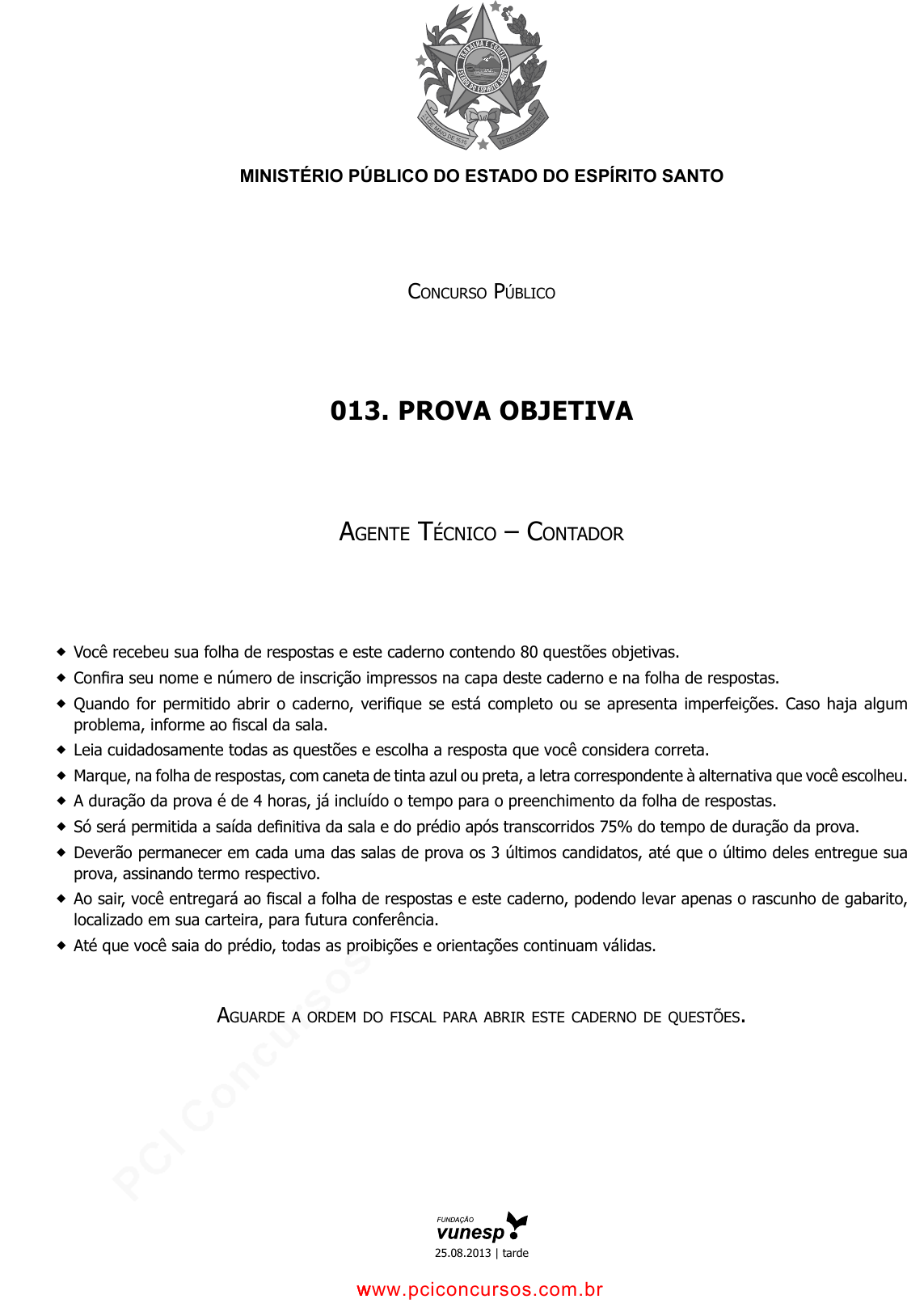 <p>pcimarkpci MDAwMDowMDAwOjAwMDA6MDAwMDowMDAwOmZmZmY6YjM2Yzo3MmQx:VHVlLCAyMiBPY3QgMjAyNCAxMjozODo0MiAtMDMwMA==</p><p>www.pciconcursos.com.br</p><p>MINISTÉRIO PÚBLICO DO ESTADO DO ESPÍRITO SANTO</p><p>ConCurso PúbliCo</p><p>013. Prova objetiva</p><p>Agente téCniCo – ContAdor</p><p>� Você recebeu sua folha de respostas e este caderno contendo 80 questões objetivas.</p><p>� Confira seu nome e número de inscrição impressos na capa deste caderno e na folha de respostas.</p><p>� Quando for permitido abrir o caderno, verifique se está completo ou se apresenta imperfeições. Caso haja algum</p><p>problema, informe ao fiscal da sala.</p><p>� Leia cuidadosamente todas as questões e escolha a resposta que você considera correta.</p><p>� Marque, na folha de respostas, com caneta de tinta azul ou preta, a letra correspondente à alternativa que você escolheu.</p><p>� A duração da prova é de 4 horas, já incluído o tempo para o preenchimento da folha de respostas.</p><p>� Só será permitida a saída definitiva da sala e do prédio após transcorridos 75% do tempo de duração da prova.</p><p>� Deverão permanecer em cada uma das salas de prova os 3 últimos candidatos, até que o último deles entregue sua</p><p>prova, assinando termo respectivo.</p><p>� Ao sair, você entregará ao fiscal a folha de respostas e este caderno, podendo levar apenas o rascunho de gabarito,</p><p>localizado em sua carteira, para futura conferência.</p><p>� Até que você saia do prédio, todas as proibições e orientações continuam válidas.</p><p>AguArde A ordem do fisCAl PArA Abrir este CAderno de questões.</p><p>25.08.2013 | tarde</p><p>www.pciconcursos.com.br</p><p>www.pciconcursos.com.br</p><p>www.pciconcursos.com.br</p><p>pcimarkpci MDAwMDowMDAwOjAwMDA6MDAwMDowMDAwOmZmZmY6YjM2Yzo3MmQx:VHVlLCAyMiBPY3QgMjAyNCAxMjozODo0MiAtMDMwMA==</p><p>www.pciconcursos.com.br</p><p>2MPES1301/013-AgTéc-Contador-Tarde</p><p>ConheCimentos gerais</p><p>Língua Portuguesa</p><p>Leia a charge para responder às questões de números 01 e 02.</p><p>(www.chargeonline.com.br. Adaptado)</p><p>01. Tendo como referência a norma-padrão da língua portuguesa,</p><p>a lacuna na fala da personagem deve ser preenchida com</p><p>(A) inexistia</p><p>(B) não se viu</p><p>(C) não haviam</p><p>(D) faltaram</p><p>(E) estava ausentes</p><p>Leia o texto para responder às questões de números 02 a 08.</p><p>Na Flip, como na Copa</p><p>RIO DE JANEIRO – Durante entrevista na Festa Literária</p><p>Internacional de Paraty deste ano, o cantor Gilberto Gil criticou</p><p>as arquibancadas dos estádios brasileiros em jogos da Copa das</p><p>Confederações.</p><p>Poderia ter dito o mesmo sobre a plateia da Tenda dos Au-</p><p>tores, para a qual ele e mais de 40 outros se apresentaram. A</p><p>audiência do evento literário lembra muito a dos eventos Fifa:</p><p>classe média alta.</p><p>Na Flip, como nas Copas por aqui, pobre só aparece “como</p><p>prestador de serviço”, para citar uma participante de um protesto</p><p>em Paraty, anteontem.</p><p>Como lembrou outro dos convidados da festa literária, o me-</p><p>xicano Juan Pablo Villalobos, esse cenário é “um espelho do que</p><p>é o Brasil”.</p><p>(Marco Aurélio Canônico, Na Flip, como na Copa. Folha de S.Paulo,</p><p>08.07.2013. Adaptado)</p><p>02. No texto e na charge, está inscrita uma crítica</p><p>(A) à qualidade dos serviços prestados pelos funcionários</p><p>das obras, seja na Flip seja para a Copa.</p><p>(B) à publicidade exagerada para que as pessoas menos fa-</p><p>vorecidas usufruam os bens culturais sociais.</p><p>(C) à ausência de pessoas menos favorecidas como cida-</p><p>dãos participantes dos eventos esportivos no Brasil.</p><p>(D) à organização dos eventos literários e esportivos que</p><p>gastam além da conta com as obras.</p><p>(E) ao pouco empenho que as pessoas no Brasil fazem para</p><p>vivenciar a agenda cultural nacional.</p><p>03. Nas palavras do mexicano Juan Pablo Villalobos, fica evi-</p><p>dente que o Brasil é um país em que</p><p>(A) as diferenças sociais ainda são bastante acentuadas.</p><p>(B) o repúdio às diferenças não ecoa na voz dos artistas.</p><p>(C) as desigualdades sociais são pouco percebidas.</p><p>(D) o esporte funciona como minimizador das diferenças.</p><p>(E) a cultura esportiva é mal vista pela classe média alta.</p><p>Para responder às questões de números 04 e 05, considere a frase</p><p>final do texto:</p><p>… esse cenário é “um espelho do que é o Brasil”.</p><p>04. O termo espelho está empregado em sentido</p><p>(A) figurado, significando qualidade.</p><p>(B) próprio, significando modelo.</p><p>(C) figurado, significando advertência.</p><p>(D) próprio, significando símbolo.</p><p>(E) figurado, significando reflexo.</p><p>05. No trecho, usam-se as aspas para</p><p>(A) marcar o discurso indireto.</p><p>(B) indicar a fala irônica do autor.</p><p>(C) introduzir o discurso direto.</p><p>(D) suavizar o sentido do enunciado.</p><p>(E) marcar pejorativamente o enunciado.</p><p>06. Observe as passagens textuais:</p><p>Na Flip, como nas Copas por aqui… (3.º parágrafo)</p><p>Como lembrou outro dos convidados da festa literária… (4.º</p><p>parágrafo)</p><p>Conforme o contexto em que estão empregados, os termos em</p><p>destaque remetem, correta e respectivamente, ao sentido de</p><p>(A) causa e comparação.</p><p>(B) comparação e conformidade.</p><p>(C) conformidade e causa.</p><p>(D) consequência e comparação.</p><p>(E) condição e causa.</p><p>www.pciconcursos.com.br</p><p>www.pciconcursos.com.br</p><p>www.pciconcursos.com.br</p><p>pcimarkpci MDAwMDowMDAwOjAwMDA6MDAwMDowMDAwOmZmZmY6YjM2Yzo3MmQx:VHVlLCAyMiBPY3QgMjAyNCAxMjozODo0MiAtMDMwMA==</p><p>www.pciconcursos.com.br</p><p>3 MPES1301/013-AgTéc-Contador-Tarde</p><p>Para responder às questões de números 09 e 10, leia o texto.</p><p>A Justiça determinou, no início da noite de ontem, a sus