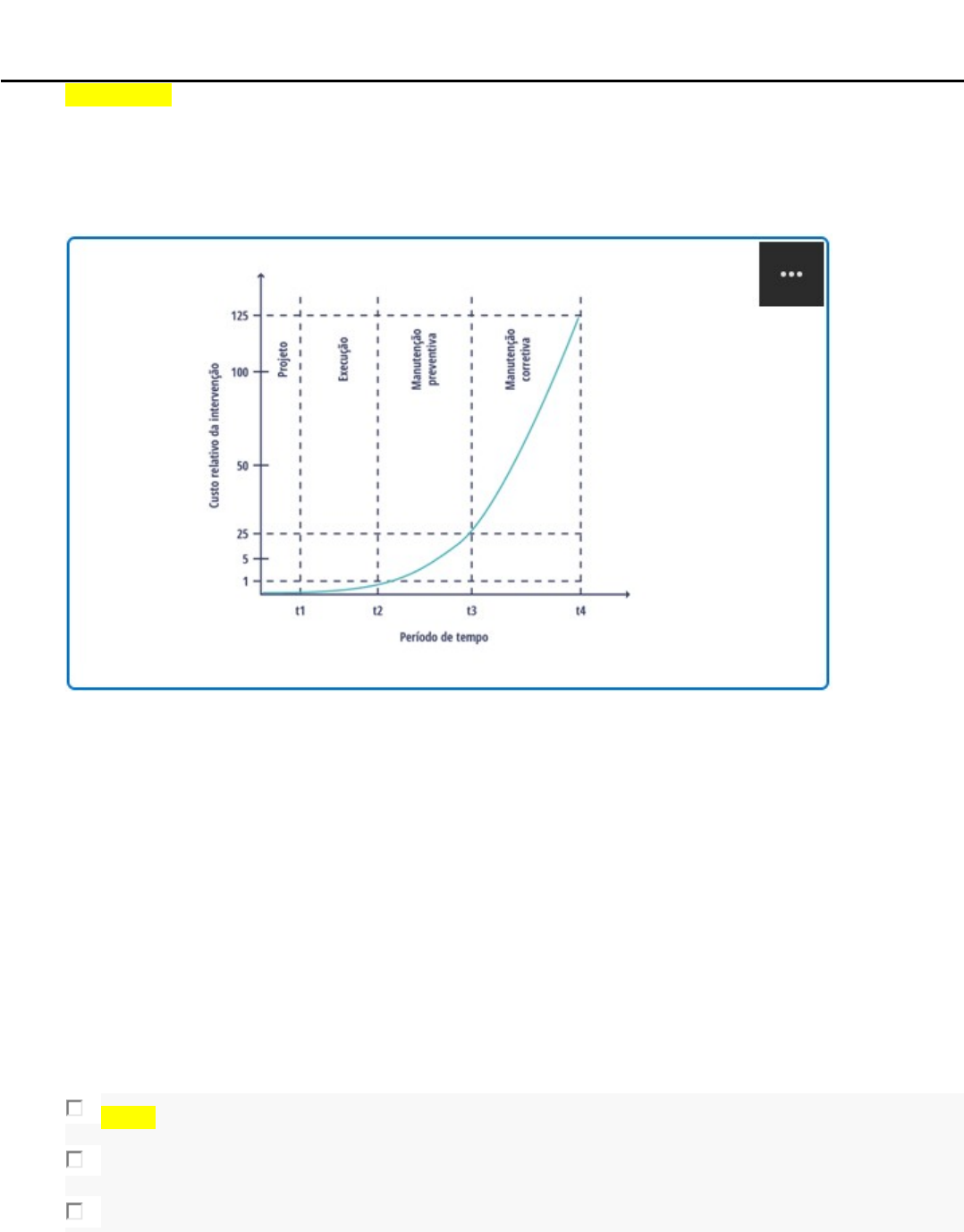<p>Módulo D - 258043 . 7 - Planejamento e Gestão de Obras - D.20242.D</p><p>Atividade de Autoaprendizagem 2</p><p>Parte superior do formulário</p><p>Parte inferior do formulário</p><p>Parte superior do formulário</p><p>Pergunta 1</p><p>Em geral, quanto mais cedo forem aplicados os conceitos de construtibilidade na construção de um empreendimento, melhores serão os resultados. Esta afirmação pode ser visualizada na Lei de Sitter, que diz que os custos de intervenção crescem em uma progressão geométrica de razão cinco entre etapas ao longo do tempo, como vemos na figura a seguir.</p><p>Assim, verifica-se que alterações na etapa de projeto tem custo inicial 1, e na etapa de execução tem custo 5, para um mesmo resultado.</p><p>Fonte: BOLINA, F. L.; TUTIKIAN, B. F.; HELENE, P. R. D. L. Patologia de estruturas. São Paulo: Oficina de Textos, v. 1, 2019.</p><p>Considerando essas informações e o conteúdo estudado sobre construtibilidade no gerenciamento de obras, analise as afirmativas a seguir:</p><p>I. Alterações em projeto feitas durante a obra são exemplos de custos 5 vezes superiores às modificações feitas durante o planejamento de obra.</p><p>II. Considerando o custo inicial 1, o planejamento efetuado na etapa de projeto proporciona resultado nulo no período de execução.</p><p>III. O alinhamento entre processos construtivos e desenvolvimento de projeto podem resultar em economias de até 125 vezes no período de uso da edificação.</p><p>IV. O projeto deve ser desenvolvido em conjunto com a etapa de execução, visando limitar os custos relativos.</p><p>Está correto apenas o que se afirma em:</p><p>I e III.</p><p>II e IV.</p><p>I e II.</p><p>III e IV.</p><p>II e III.</p><p>Parte inferior do formulário</p><p>Parte superior do formulário</p><p>Pergunta 2</p><p>O princípio da construtibilidade é formado por diversos conceitos, como a capacidade de redução de componentes ou etapas no processo de execução de um produto, que podem ser aplicados durante o processo construtivo, tornando as obras mais eficientes.</p><p>Considerando essas informações e o conteúdo estudado sobre análise técnica construtiva e construtibilidade, analise as afirmativas a seguir:</p><p>I. Projetos com maior quantidade de áreas angulosas ou superfícies curvas favorecem a produtividade da mão de obra.</p><p>II. A execução de estruturas em concreto aparente é uma forma de supressão da etapa de revestimento argamassado.</p><p>III. A utilização de contrapisos acabados para assentamento de acabamentos proporciona eficiência nula no processo construtivo.</p><p>IV. A utilização de escoras e formas metálicas reduz etapas de armazenamento e beneficiamento de madeiras para a mesma finalidade.</p><p>Está correto apenas o que se afirma em:</p><p>I e III.</p><p>III e IV.</p><p>I e IV.</p><p>I e II.</p><p>II e IV.</p><p>Parte inferior do formulário</p><p>Parte superior do formulário</p><p>Pergunta 3</p><p>Os canteiros de obras e os serviços que nele se desenvolvem evoluem constantemente, seja pelo acréscimo de novas necessidades ou pelo surgimento de técnicas e produtos inovadores na construção civil. Assim, o gestor de obra deve compatibilizar estes fatos com as questões de orçamento e prazos reduzidos normalmente solicitados.</p><p>Com base nestes conceitos e no conteúdo estudado sobre canteiro de obras, analise as afirmativas a seguir e assinale V para a(s) verdadeira(s) e F para a(s) falsa(s).</p><p>I. ( ) A disposição de equipamentos e áreas de produção dentro de um canteiro de obras deve ser alterada frequentemente ao longo da construção, visando adequar-se às necessidades dos envolvidos.</p><p>II. ( ) Para o aumento da produtividade da mão de obra, deve-se projetar o canteiro de forma a minimizar as distâncias entre centrais de produção e centrais de apoio.</p><p>III. ( ) Para que os prazos propostos no cronograma da obra sejam cumpridos, é importante proporcionar condições de segurança aos trabalhadores.</p><p>IV. ( ) O planejamento do funcionamento do canteiro de obras deve considerar o cruzamento do fluxos de produção, visando a comunicação entre as diferentes frentes de trabalho.</p><p>Agora, assinale a alternativa que apresenta a sequência correta:</p><p>F, F, V, V.</p><p>F, V, V, F.</p><p>V, F, V, F.</p><p>V, V, F, F.</p><p>F, V, F, V.</p><p>Parte inferior do formulário</p><p>Parte superior do formulário</p><p>Pergunta 4</p><p>Leia o trecho a seguir:</p><p>“As perdas de determinado material são mensuradas em função da diferença entre as quantidades utilizadas e as previstas no projeto. Emprega-se como indicador referencial a relação entre essa diferença e a quantidade de material prevista, em forma de número percentual, denominando-se de Índice de Perda.”</p><p>Fonte: VIEIRA, H. F. Logística aplicada à construção civil: como melhorar o fluxo de produção nas obras. São Paulo: Pini, 2006, p. 42.</p><p>Com base nestes conceitos e no conteúdo estudado sobre racionalização da construção, analise as afirmativas a seguir e assinale V para a(s) verdadeira(s) e F para a(s) falsa(s).</p><p>I. ( ) A utilização de concreto com resistência maior do que a especificação de projeto caracteriza, em qualquer situação, ganhos para a construção.</p><p>II. ( ) A falta de treinamento de mão de obra pode ser compensada pelo efeito de aprendizado durante a construção, sem prejuízos financeiros.</p><p>III. ( ) A integração entre projeto e execução pode ser realizada durante a etapa de construção.</p><p>IV. ( ) A ausência de detalhamentos de projeto pode resultar em perdas durante a execução da obra.</p><p>V. ( ) A substituição de elementos moldados no canteiro de obras por elementos pré-fabricados pode ser mais eficiente.</p><p>Agora, assinale a alternativa que apresenta a sequência correta:</p><p>V, V, V, F, V.</p><p>F, V, V, F, V.</p><p>V, F, V, F, F.</p><p>F, V, F, V, F.</p><p>F, F, F, V, V.</p><p>Parte