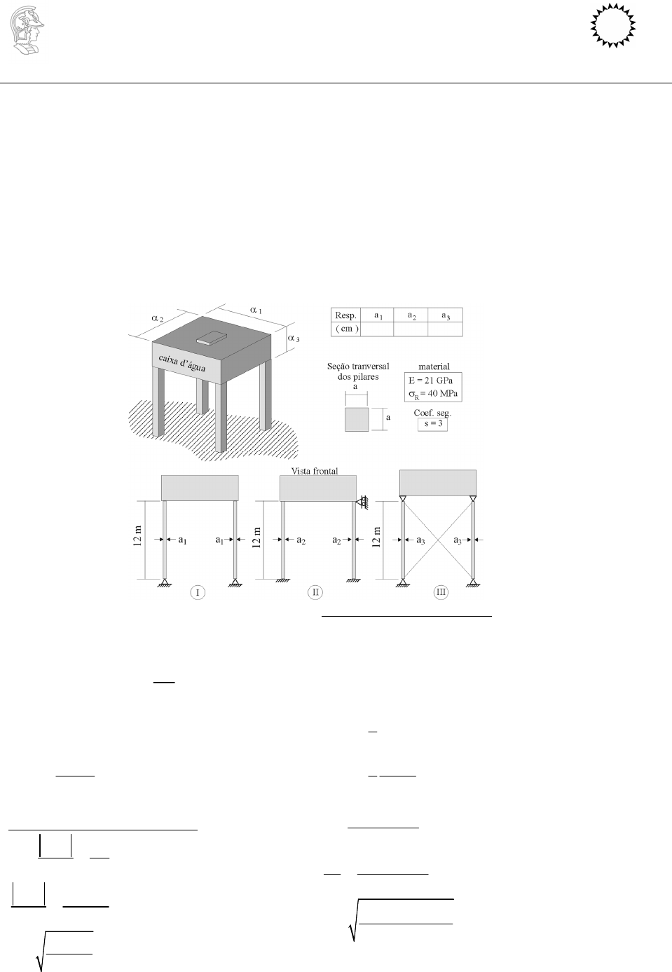 <p>FACULDADE DE ARQUITETURA E URBANISMO DA UNIVERSIDADE DE SÃO PAULO</p><p>PEF2602 - ESTRUTURAS NA ARQUITETURA II</p><p>EXERCÍCIO INDIVIDUAL 3</p><p>Nome Nº USP</p><p>Ex. 3.1: A estrutura da figura abaixo consiste de uma caixa d’água sustentada por</p><p>quatro pilares de 12m, cujo material possui módulo de elasticidade E = 21 GPa e</p><p>tensão de ruptura R = 40 MPa. Para obter o valor da carga sobre os pilares,</p><p>considere que o peso próprio da caixa d’água corresponde a 30% do peso do líquido</p><p>(peso específico: líquido = 10 kN/m3) contido na mesma, ou seja, Pprojeto = 1,3xPlíquido.</p><p>Três tipos distintos de condições das extremidades dos pilares devem ser analisadas</p><p>(esquemas I, II e III na figura). Determinar a dimensão a da seção transversal dos</p><p>pilares para cada uma das três situações (a1, a2 e a3), adotando um coeficiente de</p><p>segurança s = 3.</p><p>Para obter as dimensões(m) da caixa d’água considere:</p><p>α1 = último algarismo não-nulo de seu número USP;</p><p>α2 = penúltimo algarismo não-nulo de seu número USP;</p><p>α3 = antepenúltimo algarismo não-nulo de seu número USP.</p><p>Resolução:</p><p>a) Levantamento das cargas atuantes</p><p>1 2 3 310</p><p>1,3</p><p>A carga em cada um dos pilares é dada por:</p><p>4</p><p>líquido caixa líquido</p><p>líquido</p><p>projeto líquido</p><p>projeto</p><p>pilar</p><p>P V</p><p>kNP</p><p>m</p><p>P P</p><p>P</p><p>P</p><p></p><p> </p><p> </p><p> </p><p> </p><p></p><p>b) Dimensionamento do pilar</p><p>b.1) 1º critério: tensão normal</p><p>6</p><p>2</p><p>6</p><p>40 10</p><p>3</p><p>3</p><p>40 10</p><p>pilar R</p><p>pilar</p><p>pilar</p><p>P</p><p>A s</p><p>P</p><p>a</p><p>P</p><p>a</p><p> </p><p></p><p></p><p></p><p></p><p></p><p>b.2) 2º critério: flambagem</p><p>Situação 1: 2 2 12fl l </p><p>Situação 2: 0,5 0,5 12fl l </p><p>Situação 3: 12fl l </p><p>2</p><p>2</p><p>2</p><p>2</p><p>24</p><p>2</p><p>2</p><p>4</p><p>2</p><p>1</p><p>1 I</p><p>12</p><p>12</p><p>pilar crit</p><p>pilar</p><p>f</p><p>pilar f</p><p>pilar f</p><p>pilar f</p><p>P P</p><p>s</p><p>EP</p><p>s l</p><p>s P l</p><p>I</p><p>E</p><p>s P la</p><p>E</p><p>s P l</p><p>a</p><p>E</p><p></p><p></p><p></p><p></p><p></p><p></p><p> </p><p></p><p> </p><p></p><p> </p><p></p><p>FACULDADE DE ARQUITETURA E URBANISMO DA UNIVERSIDADE DE SÃO PAULO</p><p>PEF2602 - ESTRUTURAS NA ARQUITETURA II</p><p>EXERCÍCIO INDIVIDUAL 3</p><p>Nome Nº USP</p><p>Ex. 3.2: A Figura 1 mostra a cobertura do Aeroporto Dulles, em Washington (Arq. Eero</p><p>Saarinen, 1958), a qual consiste de uma casca de concreto protendido, obtida por meio</p><p>de um engenhoso sistema construtivo, ilustrado na Figura 2. A cobertura tem geometria</p><p>cilíndrica, com uma geratriz catenária, razoavelmente aproximada por uma parábola,</p><p>funicular, portanto, a um carregamento vertical uniformemente distribuído. O peso</p><p>próprio da estrutura é da ordem de</p><p>26 /ppw kN m . As cargas adicionais (neve e</p><p>outros carregamentos) atingem</p><p>224 /</p><p>10ad</p><p>nw kN m </p><p> </p><p>, sendo n o penúltimo algarismo</p><p>não nulo do seu número USP. Os cabos de protensão estão espaçados de 3m, e ancoram-se</p><p>a vigas de borda que transferem as cargas para os topos de colunas inclinadas,</p><p>engastadas nas bases, afastadas entre si de 12m. A cobertura tem um vão transversal</p><p>de 50m, medindo 192m na direção transversal.</p><p>Considerando o esquema estrutural da Figura 3, determine a altura yC que define a</p><p>menor cota da cobertura (ponto C). Determine as reações de ancoragem dos cabos de</p><p>protensão nas vigas de borda (pontos A e B). Determine as cargas resultantes nos</p><p>topos das colunas, e o momento fletor nas ancoragens das colunas maiores (ponto D),</p><p>quando atuar a carga wpp+wad. Desconsidere o peso da coluna. Compare o momento fletor</p><p>na base das colunas inclinadas com o momento que resultaria do uso de colunas</p><p>verticais (ou seja, dispostas segundo o eixo BE, e engastadas em E).</p><p>Figura 1</p><p>Figura 2</p><p>Figura 3</p><p>FACULDADE DE ARQUITETURA E URBANISMO DA UNIVERSIDADE DE SÃO PAULO</p><p>PEF2602 - ESTRUTURAS NA ARQUITETURA II</p><p>EXERCÍCIO INDIVIDUAL 3</p><p>Nome Nº USP</p><p>Resolução para n=1</p><p>Carregamento vertical total</p><p>2</p><p>2 16 4 10,2</p><p>10total pp ad</p><p>kNw w w</p><p>m</p><p></p><p> </p><p>Carga distribuída no cabo:</p><p>10,2 3 30,6 /p kN m </p><p>Equilíbrio horizontal:</p><p>0 0 x A B A BF H H H H H </p><p>Equilíbrio vertical:</p><p>0 30,6 50 1530y A B A BF V V V V </p><p>Equilíbrio do trecho AC em torno do porto A:</p><p>218 4957,2</p><p>2c</p><p>c</p><p>H y p H</p><p>y</p><p> </p><p>Equilíbrio do trecho BC em torno do porto B:</p><p>232 15667,2( 6)</p><p>2 ( 6)c</p><p>c</p><p>H y p H</p><p>y</p><p> </p><p></p><p>Igualando as duas equações:</p><p>4957,2 15667,2 1,44</p><p>( 6) c</p><p>c c</p><p>y m</p><p>y y</p><p> </p><p></p><p>Logo</p><p>4957,2 3442,5</p><p>1,44</p><p>H kN </p><p>Equilíbrio de momento em torno do ponto A:</p><p>2500 30,6 3442,5 6 50 0</p><p>2A BM V </p><p>1178,1</p><p>351,9</p><p>B</p><p>A</p><p>V kN</p><p>V kN</p><p></p><p></p><p>Força resultante nos pontos de ancoragem:</p><p>Em A: 2 2 2 2</p><p>max,A 3442,5 351,9 3460AN H V kN </p><p>Em B: 2 2 2 2</p><p>max, 3442,5 1178,1 3638,5B BN H V kN </p><p>Momento da coluna inclinada: 4 3442,5 15 (1178,1 9) 164.138,4 .DM kN m </p><p>Momento no caso da coluna vertical: 4 3442,5 15 206.550 .EM kN m </p>