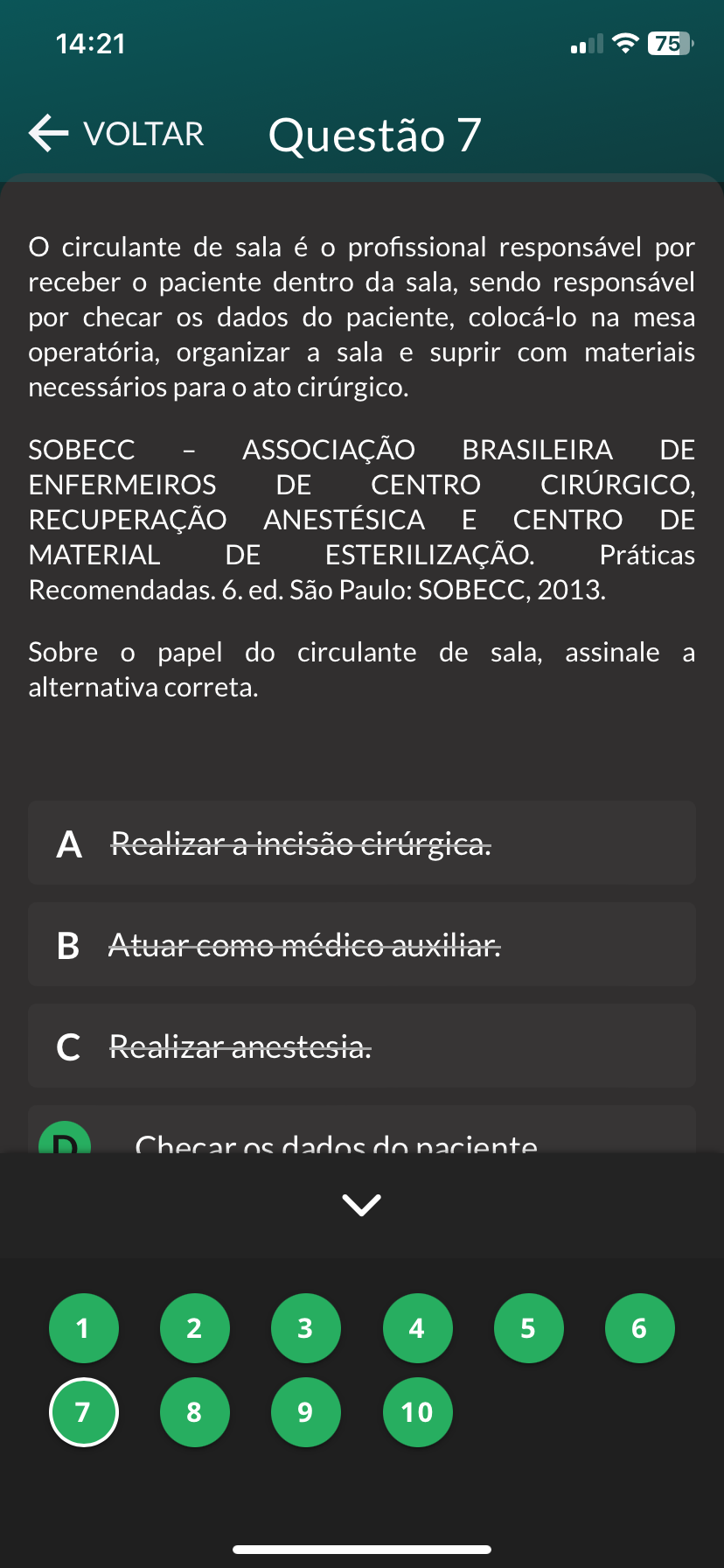 14:21 75 VOLTAR Questão 7 O circulante de sala é profissional responsável por receber paciente dentro da sala, sendo responsável por checar os dados do paciente, colocá-lo na mesa operatória, organizar a sala e suprir com materiais necessários para ato cirúrgico. SOBECC ASSOCIAÇÃO BRASILEIRA DE ENFERMEIROS DE CENTRO RECUPERAÇÃO ANESTÉSICA E CENTRO DE MATERIAL DE ESTERILIZAÇÃO. Práticas Recomendadas. 6. ed. São Paulo: SOBECC, 2013. Sobre papel do circulante de sala, assinale a alternativa correta. A Realizar a incisão cirúrgica. Atuar como médico auxiliar. Realizar anestesia. Checar dados do naciente 1 2 3 4 5 6 7 8 9 10