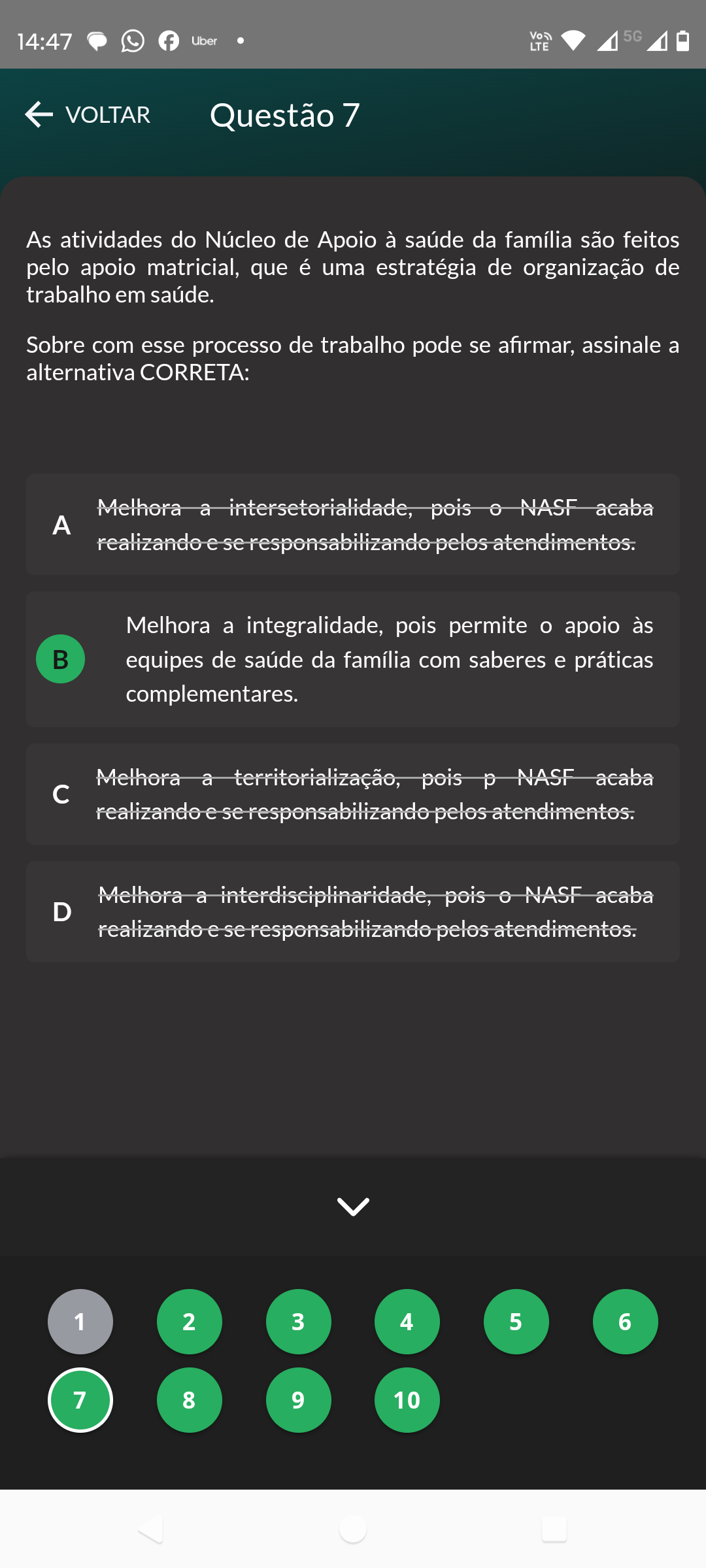 5G 14:47 Uber LTE VOLTAR Questão 7 As atividades do Núcleo de Apoio à saúde da família são feitos pelo apoio matricial, que é uma estratégia de organização de trabalho em saúde. Sobre com esse processo de trabalho pode se afirmar, assinale a alternativa CORRETA: Melhora a intersetorialidade, pois NASF acaba A realizando e se pelos atendimentos. Melhora a integralidade, pois permite apoio às B equipes de saúde da família com saberes e práticas complementares. Melhora a territorialização, pois NASF acaba C realizando e se pelos atendimentos. Melhora a interdisciplinaridade, pois NASF acaba D realizando e se responsabilizando pelos atendimentos. 1 2 3 4 5 6