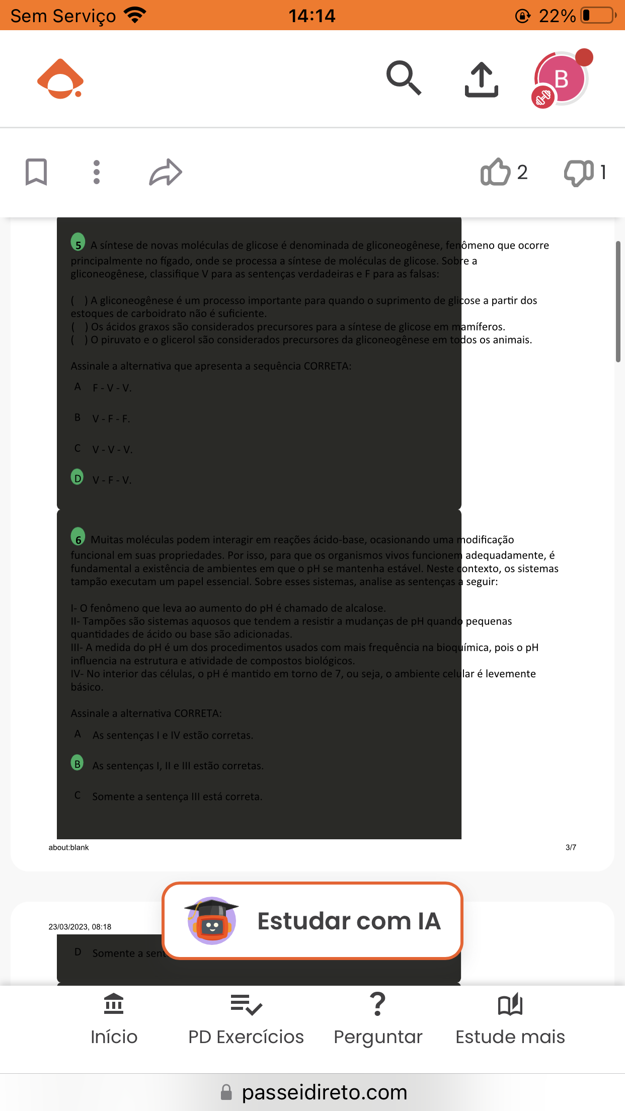Sem Serviço 14:14 22% B 2 1 5 A síntese de novas moléculas de glicose é denominada de gliconeogênese, fenômeno que ocorre principalmente no fígado, onde se processa a síntese de moléculas de glicose. Sobre a gliconeogênese, classifique V para as sentenças verdadeiras e F para as falsas: ( ) A gliconeogênese é um processo importante para quando o suprimento de glicose a partir dos estoques de carboidrato não é suficiente. ( ) Os ácidos graxos são considerados precursores para a síntese de glicose em ( ) piruvato e glicerol são considerados precursores da gliconeogênese em todos os animais. Assinale a alternativa que apresenta a CORRETA: A B D 6 Muitas moléculas podem interagir em reações ácido-base, ocasionando uma modificação funcional em suas propriedades. Por isso, para que os organismos vivos funcionem adequadamente, é fundamental a existência de ambientes em que pH se mantenha estável. Neste contexto, os sistemas tampão executam um papel essencial. Sobre esses sistemas, analise as sentenças a seguir: fenômeno que leva ao aumento do pH é chamado de alcalose. Tampões são sistemas aquosos que tendem a resistir a mudanças de pH quando pequenas quantidades de ácido ou base são adicionadas. III- A medida do pH é um dos procedimentos usados com mais frequência na bioquímica, pois o pH influencia na estrutura e atividade de compostos biológicos. IV- No interior das células, pH é mantido em torno de 7, ou seja, ambiente celular é levemente básico. Assinale a alternativa CORRETA: A As sentenças e IV estão corretas. B As sentenças e III estão corretas. Somente a sentença III está correta. about:blank 3/7 Estudar com IA 23/03/2023, 08:18 D Somente a ? Início PD Exercícios Perguntar Estude mais passeidireto.com