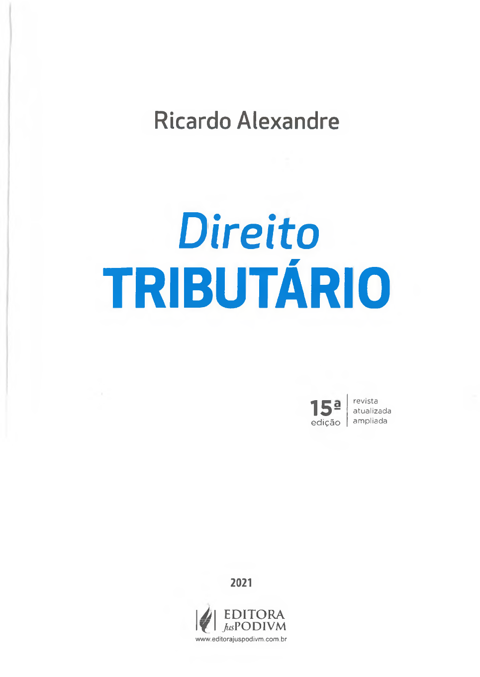 <p>Ricardo Alexandre</p><p>Direito</p><p>TRIBUTÁRIO</p><p>15-</p><p>edição</p><p>revista</p><p>atualizada</p><p>ampliada</p><p>2021</p><p>Zl EDITORA</p><p>^1 >PODIVM</p><p>www.editorajuspodivm.com.br</p><p>http://www.editorajuspodivm.com.br</p><p>Novidade - Atualização periódica em vídeos apresentados pelo autor</p><p>Fique por dentro das inovações legislativas e jurisprudenciais que tenham repercussão no</p><p>conteúdo do livro.</p><p>Para conferir o material: cadastre-se em https://www.editorajuspodivm.com.br/conectado</p><p>e insira o código de acesso constante na etiqueta da pág. 1.</p><p>Atenção: notificaremos você por e-mail a cada novo vídeo.</p><p>l/| EDITORA</p><p>IY I >PODIVM</p><p>www.editorajuspodivm.com.br</p><p>Rua Território Rio Branco, 87 - Pituba - CEP: 41830-530 - Salvador - Bahia</p><p>Tel: (71)3045.9051</p><p>• Contato: https://www.editorajuspodivm.com.br/sac</p><p>Copyright: Edições JusPODIVM</p><p>Conselho Editorial: Eduardo Viana Portela Neves, Dirley da Cunha Jr„ Leonardo de Medeiros Garcia, Fredie</p><p>Didier Jr., José Henrique Mouta, José Marcelo Vigliar, Marcos Ehrhardt Júnior, NestorTávora, Robério Nunes Filho,</p><p>Roberval Rocha Ferreira Filho, Rodolfo Pamplona Filho, Rodrigo Reis Mazzei e Rogério Sanches Cunha.</p><p>Capa: Maitê Coelho (maitescoelho@yahoo.com.br)</p><p>• A Editora JusPODIVM passou a publicar esta obra a partir da 11? edição.</p><p>A381d Alexandre, Ricardo.</p><p>Direito tributário / Ricardo Alexandre - 15. ed. rev., atual, e ampl. - Salvador -</p><p>Ed. JusPodivm, 2021.</p><p>928 p.</p><p>Bibliografia.</p><p>ISBN 978-65-5680-522-1</p><p>1. Direito tributário. I. Alexandre, Ricardo. II. Título.</p><p>CDD 341.39</p><p>Todos os direitos desta edição reservados a Edições JusPODIVM.</p><p>É terminantemente proibida a reprodução total ou parcial desta obra, por qualquer meio ou processo, sem a</p><p>expressa autorização do autor e das Edições JusPODIVM. A violação dos direitos autorais caracteriza crime descrito</p><p>na legislação em vigor, sem prejuízo das sanções civis cabíveis.</p><p>https://www.editorajuspodivm.com.br/conectado</p><p>http://www.editorajuspodivm.com.br</p><p>https://www.editorajuspodivm.com.br/sac</p><p>mailto:maitescoelho@yahoo.com.br</p><p>“Um professor sempre afeta a eternidade.</p><p>Ele nunca saberá onde sua influência termina.”</p><p>Henry Adams</p><p>À minha mãe, Sonia, pela história de vida,</p><p>pelo amor, pela dedicação;</p><p>Aos meus irmãos, Jaqueline e Júnior, que, mesmo a</p><p>distância, mantêm-se presentes;</p><p>À Evelyne Peixoto, por superar o sonhador na certeza</p><p>da concretização do sonho;</p><p>A Cristiano Pimentel, por disponibilizar o seu</p><p>brilhantismo para o enriquecimento da obra;</p><p>À Procuradoria da Fazenda Nacional, à Receita</p><p>Federal do Brasil e ao Ministério Público de Contas de</p><p>Pernambuco, pelos anos de experiência</p><p>que me habilitaram a chegar até aqui;</p><p>E principalmente a eles, meus alunos, presenciais em</p><p>Recife e virtuais em todo o Brasil, incentivadores</p><p>e destinatários de todo o trabalho.</p><p>Para acessar os vídeos:</p><p>Para quem usa Android, importante instalar um aplicativo com leitor de QRCodes,</p><p>que pode sero"QR Code Reader". Você encontrará no seguinte link:</p><p>► http://editoraj.us/baixar-qr-android</p><p>Para quem usa IOS (iPhone, iPad), basta instalar um aplicativo com leitor de QRCodes,</p><p>que pode ser o "QR Code Reader and Scanner". Você o encontrará no seguinte link:</p><p>► http://editoraj.us/baixar-qr-ios</p><p>Os vídeos estão indicados no sumário pelo símbolo:</p><p>http://editoraj.us/baixar-qr-android</p><p>http://editoraj.us/baixar-qr-ios</p><p>NOTA A 15.a EDIÇÃO</p><p>Olá, colega leitor,</p><p>Desde a primeira edição desta obra, confessei a pretensão de enfrentar a alucinante</p><p>evolução da legislação e da jurisprudência tributárias brasileiras. O objetivo principal era</p><p>a preparação em alto nível para as provas de Direito Tributário dos mais importantes</p><p>concursos públicos do País. Contudo, fui surpreendido pelos caminhos trilhados pela</p><p>obra. A par de atender seu objetivo, tornando-se o material de referência na prepara</p><p>ção para concursos, o nosso Direito Tributário ganhou o mundo acadêmico e hoje me</p><p>dá o orgulho de ser adotado como livro-texto em inúmeras universidades do Brasil.</p><p>Além disso, é utilizado por profissionais que precisam conhecer como o ordenamento</p><p>jurídico-tributário é entendido pelos órgãos constitucionalmente legitimados a dizer o</p><p>direito aplicável a cada caso, com poderes coercitivos e a força da coisa julgada.</p><p>Assim, se, conforme afirmam os norte-americanos, a Constituição e a lei são o</p><p>que a Suprema Corte diz que elas são, o objetivo desta obra é, tomando o Supremo</p><p>Tribunal Federal e o Superior Tribunal de Justiça como guias, dizer o que efetivamente</p><p>são as leis tributárias e a Constituição Tributária Brasileira, possibilitando ao estudante,</p><p>ao profissional e ao candidato a cargo ou emprego público maior segurança na busca</p><p>da consecução dos respectivos desígnios.</p><p>Tenho também o orgulho de haver introduzido uma nova metodologia, hoje co</p><p>piada por inúmeros manuais de Direito. Falo da citação, no próprio texto do livro - e</p><p>não apenas em exercícios de fixação daquilo que, em sala de aula, apelido como</p><p>“jurisprudência de banca”. Trata-se de algo que muito me ajudou na preparação para</p><p>os vários concursos públicos a que me submeti. Nos livros e Códigos que utilizei,</p><p>sempre escrevi anotações do tipo “para a VUNESP é assim, já para o CESPE, a FGV</p><p>e a FCC o entendimento correto é desta outra forma”. Tais anotações, que tanto con</p><p>tribuíram para minhas aprovações, passaram a constar do livro para cola
