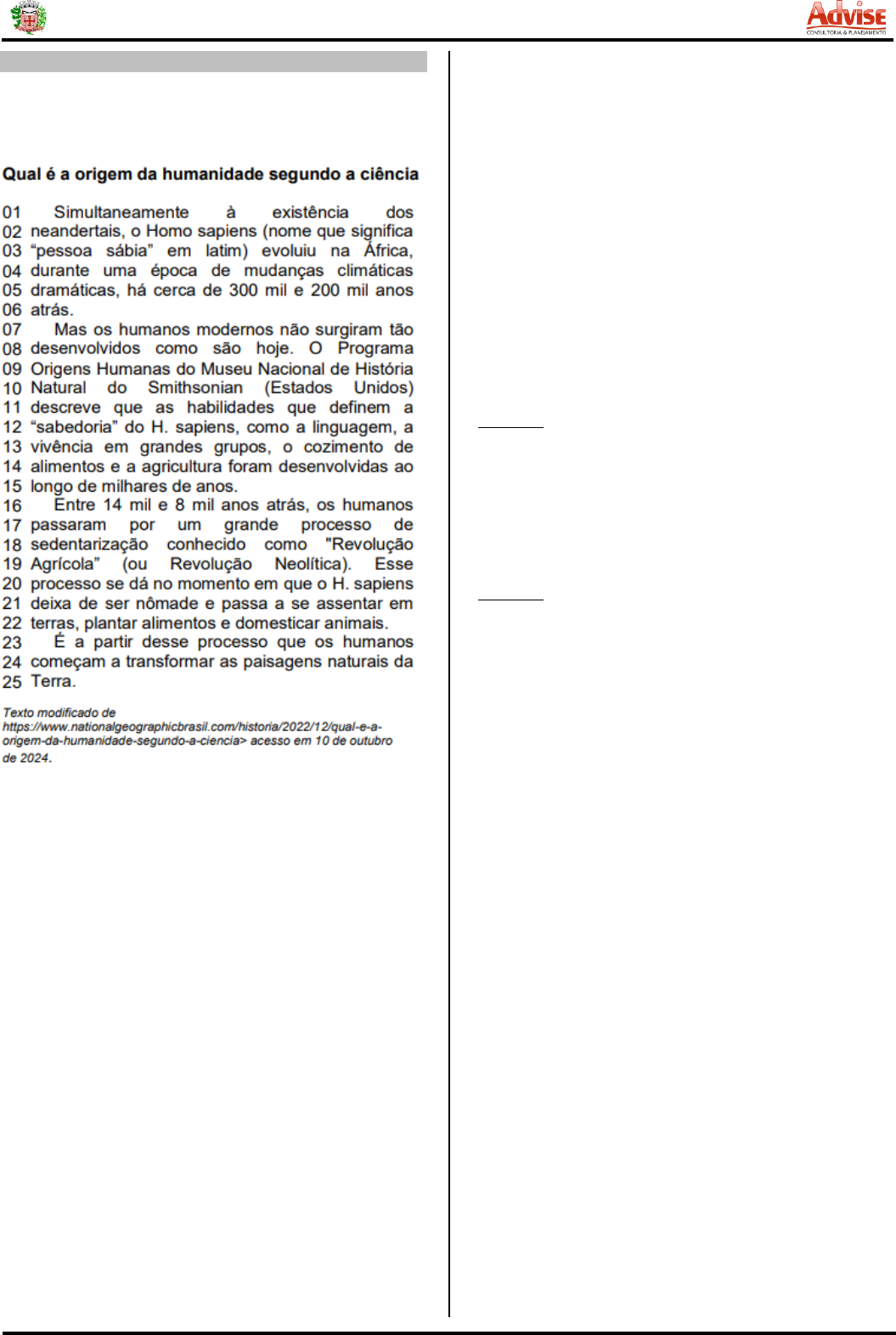<p>PREFEITURA DO MUNICÍPIO DE FREI MARTINHO (PB)</p><p>CARGO: ENFERMEIRO 1</p><p>PORTUGUÊS</p><p>As questões de 01 a 09 dizem respeito ao texto. Leia-o</p><p>atentamente antes de respondê-las.</p><p>01. Assinale a alternativa que contenha a informação</p><p>CORRETA sobre a estrutura composicional utilizada no</p><p>texto.</p><p>A) Todos os conectores responsáveis pela coesão</p><p>textual estão implícitos.</p><p>B) A coerência textual ocorre de forma isolada e</p><p>individual em cada parágrafo.</p><p>C) Há somente uma referência do ‘quando’ [tempo]</p><p>para localização.</p><p>D) O texto possui o final em aberto.</p><p>E) O gênero textual é a reportagem, tendo como</p><p>plataforma, um site.</p><p>02. Com base na composição vocabular, aponte a</p><p>alternativa com a informação CORRETA.</p><p>A) A tipologia é a narrativa.</p><p>B) A linguagem formal enaltece o gênero textual.</p><p>C) A linguagem denotativa abusa do sentido</p><p>figurado.</p><p>D) A propagação da raça humana pelo mundo é o</p><p>tema central.</p><p>E) Há predomínio de verbos no Presente.</p><p>03. Assinale a alternativa com a relação INCORRETA</p><p>entre a palavra e seu significado.</p><p>A) ‘Simultaneamente’ (linha 01) e</p><p>‘concomitantemente’ são antônimos.</p><p>B) ‘Nômade’ (linha 21) e ‘errante’ são sinônimos.</p><p>C) ‘Assentar’ (linha 21) e ‘fixar’ são sinônimos.</p><p>D) ‘Evoluiu’ (linha 03) é antônimo de ‘retrocedeu’.</p><p>E) ‘Dramáticas’ (linha 05) não está relacionado a</p><p>coisas boas.</p><p>04. Relacione classe gramatical (Coluna 1) com palavras do</p><p>texto (Coluna 2).</p><p>Coluna 1</p><p>(1) Advérbio.</p><p>(2) Preposição.</p><p>(3) Verbo.</p><p>(4) Substantivo.</p><p>Coluna 2</p><p>(__) ‘Entre’ (linha 16).</p><p>(__) ‘descreve’ (linha 11).</p><p>(__) ‘existência’ (linha 01).</p><p>(__) ‘Simultaneamente’ (linha 01).</p><p>(__) ‘domesticar’ (linha 22).</p><p>Qual alternativa a seguir preenche, CORRETAMENTE, de</p><p>cima para baixo, os parênteses?</p><p>A) 4-2-3-1-3.</p><p>B) 1-2-3-4-1.</p><p>C) 2-3-4-1-3.</p><p>D) 2-4-1-3-2.</p><p>E) 3-1-2-2-4.</p><p>05. Assinale a alternativa com a informação CORRETA a</p><p>respeito das regras e uso dos sinais de pontuação presentes</p><p>no texto.</p><p>A) Aspas duplas (linha 12) ressaltam um</p><p>neologismo.</p><p>B) Os parênteses nas linhas 02 e 03 impedem a</p><p>repetição de um termo já mencionado.</p><p>C) Os parênteses na linha 10 contêm a forma por</p><p>extenso de uma abreviação anterior.</p><p>D) As aspas duplas (linhas 18 e 19) realçam uma</p><p>palavra /expressão.</p><p>E) Os parênteses na linha 19 acrescentam um</p><p>comentário do autor do texto.</p><p>PREFEITURA DO MUNICÍPIO DE FREI MARTINHO (PB)</p><p>CARGO: ENFERMEIRO 2</p><p>06. A presença da palavra ‘atrás’ (linha 06), dentro do</p><p>sentido expresso pelo verbo ‘haver’ (linha 05) configura um</p><p>vício de linguagem, definido como:</p><p>A) ambiguidade.</p><p>B) redundância.</p><p>C) antítese.</p><p>D) metáfora.</p><p>E) metonímia</p><p>07. A palavra ‘Mas’ (linha 07) adiciona qual sentido ao</p><p>período que inicia?</p><p>A) Causa.</p><p>B) Comparação.</p><p>C) Dúvida.</p><p>D) Adição.</p><p>E) Adversidade.</p><p>08. A ocorrência de crase na linha 01 pode ser justificada:</p><p>A) pela regência nominal indireta.</p><p>B) por expressar existência.</p><p>C) por anteceder um substantivo feminino.</p><p>D) pela regência verbal transitiva direta.</p><p>E) por ser facultativa nesse caso.</p><p>09. Conforme o Novo Acordo Ortográfico e as regras de</p><p>acentuação gráfica, assinale a alternativa com a colocação</p><p>mais coerente sobre a classificação das palavras do texto.</p><p>A) ‘Atrás’ (linha 16) só é oxítona quando está no</p><p>plural.</p><p>B) ‘Nômade’ (linha 21) só é proparoxítona quando</p><p>está no plural.</p><p>C) ‘Dá’ (linha 20) é um monossílabo tônico.</p><p>D) ‘África’ (linha 03) é paroxítona.</p><p>E) ‘Sábia’ (linha 03) e ‘sabiá’ possuem a mesma</p><p>classificação.</p><p>10. Aponte a informação errônea sobre as novas regras de</p><p>acentuação de verbos dispostas no Acordo Ortográfico.</p><p>A) As formas no Presente e Passado no Indicativo</p><p>do verbo ‘poder’ na 3ª pessoa do singular sofrem</p><p>diferenciação pelo acento.</p><p>B) ‘Parar’ na 3ª pessoa do singular no Presente do</p><p>Indicativo não leva mais acento.</p><p>C) ‘Forma’ com pronúncia aberta, verbo ou</p><p>substantivo, é sempre sem acento.</p><p>D) A utilização do acento na 1ª pessoa do singular</p><p>do Presente do Indicativo dos verbos ‘voar’ e</p><p>‘enjoar’ é facultativa.</p><p>E) A preposição ‘por’ e o verbo homófono são</p><p>distinguidos pelo acento diferencial.</p><p>CONHECIMENTOS GERAIS E ATUALIDADES</p><p>11. As reuniões dos vereadores para deliberações</p><p>colegiadas sobre as matérias de interesse da Câmara de</p><p>Frei Martinho/PB ocorrem no Plenário:</p><p>A) Vereador Deusdete Dantas.</p><p>B) Capitão Benjamin Netanyahu.</p><p>C) Prefeito Cláudio Heinrich.</p><p>D) Deputado Aristeu Pires.</p><p>E) Frei Adalberto Nascimento.</p><p>12. Jerry Rosse de Medeiros da Cunha é responsável pelo</p><p>seguinte elemento simbólico de Frei Martinho/PB:</p><p>A) Brasão do Município.</p><p>B) Bandeira Municipal.</p><p>C) Projeto da Prefeitura.</p><p>D) Desenho do Selo do Município.</p><p>E) Letra do Hino Municipal.</p><p>13. O nome do município de Frei Martinho/PB tem sua</p><p>origem:</p><p>A) no nome de um dos personagens responsáveis</p><p>pela prisão de Lampião.</p><p>B) no nome do religioso que libertava escravos</p><p>clandestinamente.</p><p>C) na homenagem a um Frade alemão muito</p><p>conhecido na região.</p><p>D) na homenagem a um dos párocos que foram</p><p>assassinados na invasão holandesa.</p><p>E) no nome do principal herdeir