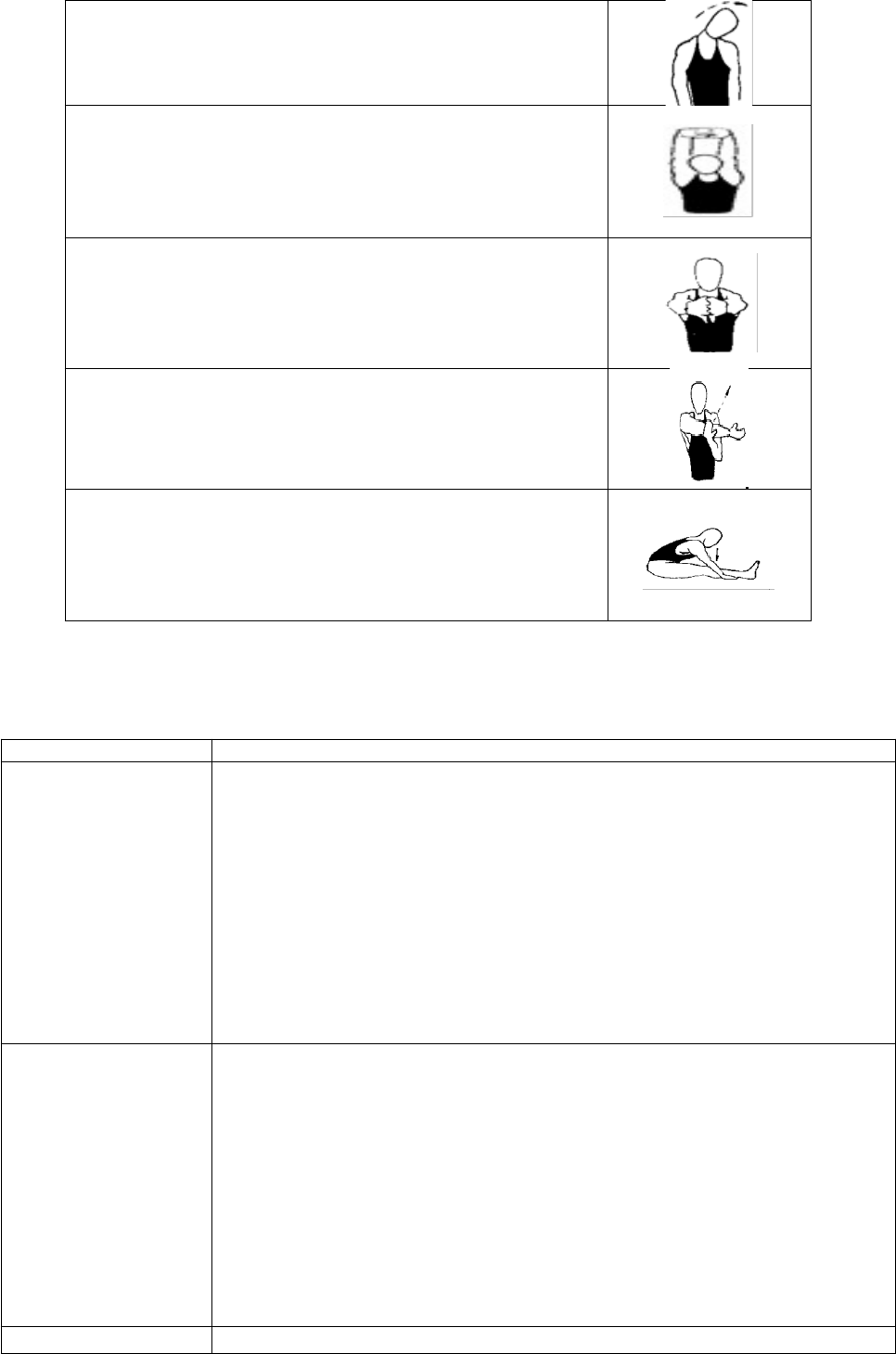 <p>Alongamentos</p><p>Formação: Em pé.</p><p>Desenvolvimento: Flexão lateral do pescoço. Forçando a orelha</p><p>na direção do ombro.</p><p>Formação: Em pé, entrelaçar os dedos.</p><p>Desenvolvimento: Estender as mãos à cima da cabeça, voltando</p><p>as palmas para cima.</p><p>Formação: Em pé, entrelaçar os dedos das mãos.</p><p>Desenvolvimento: Estender os braços voltando as mãos para</p><p>frente.</p><p>Formação: Em pé com o braço estendido para trás.</p><p>Desenvolvimento: Empurrar com a mão oposta o braço para</p><p>trás.</p><p>Formação: Sentado com as pernas estendidas e unidas. Mãos</p><p>no chão ao lado dos joelhos.</p><p>Desenvolvimento: Flexionar o tronco sobre as coxas.</p><p>Exercícios Ginásticos</p><p>Representação Descrição</p><p>Passa a bola com giro de tronco</p><p>Formação: Alunos em duplas, em pé e de costas, um aluno com uma</p><p>bola.</p><p>Desenvolvimento: Os alunos combinam o lado que irão começar.</p><p>Simultaneamente giram o corpo para o lado e passam a bola, em seguida</p><p>giram o corpo para o outro lado e passam novamente a bola de um lado</p><p>para o outro lado. Realizar 15 repetições.</p><p>Observação: A bola pode ser substituída por outro objeto, por exemplo:</p><p>laranja, maçã, etc..</p><p>Empurra</p><p>Formação: Alunos formam duplas, em pé, frente a frente, mãos nos</p><p>ombros do colega.</p><p>Desenvolvimento: Ao sinal, empurram-se simultaneamente, cuidando</p><p>para o colega não cair no chão.</p><p>Alongamento das costas</p><p>Formação: Alunos formam duplas, em pé, um de frente para o outro,</p><p>com as mãos nos ombros do colega.</p><p>Desenvolvimento: Realizam uma flexão de tronco a frente, mantendo as</p><p>pernas estendidas e afastadas lateralmente.</p><p>OBS: Movimentos leves, sem forçar.</p><p>Agachamento em dupla de costas</p><p>Formação: Alunos formam duplas, um de costas para o outro, com os</p><p>braços entrelaçados e pernas afastadas.</p><p>Desenvolvimento: Simultaneamente, os alunos realizam o movimento de</p><p>agachamento, flexionando os quadris e joelhos. Realizar 10 repetições.</p><p>Puxa-puxa</p><p>Formação: Alunos formam duplas, sentados frente a frente com as pernas</p><p>afastadas lateralmente, dão as mãos.</p><p>Desenvolvimento: Um aluno puxa o outro, deixando os pés unidos e as</p><p>pernas estendidas. Permanece na posição por 30 segundos e após invertem</p><p>os papéis.</p><p>OBS: Movimentos leves, sem forçar.</p><p>Responda:</p><p>Dentre os exercícios, qual você considerou mais difícil de realizar? Por quê?</p><p>E qual exercício foi mais fácil de realizar? Por quê?</p>