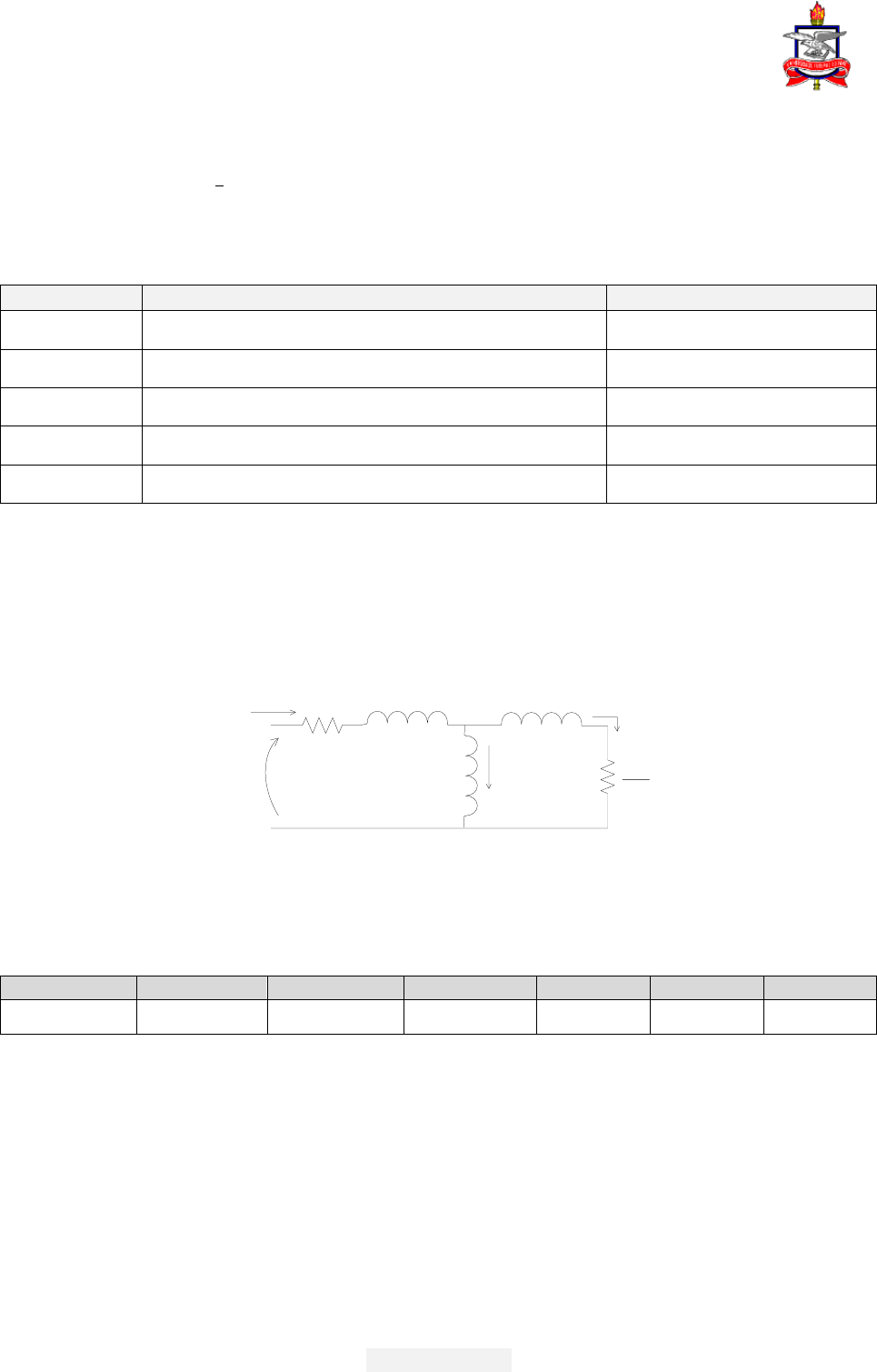 <p>Aula Prática No 3 - Data: ___/___/___ Turma:____</p><p>ENSAIOS DO MIT – VAZIO E DE ROTOR BLOQUEADO</p><p>RA Nome Assinatura</p><p>O circuito elétrico equivalente do motor de indução é a forma de representar o comportamento das</p><p>grandezas elétricas e magnéticas tais como as perdas joules nos enrolamentos, as perdas por histerese e</p><p>Foucault, os fluxos de dispersão do primário e secundário e a reatância de magnetização.</p><p>Os parâmetros do circuito equivalente podem ser obtidos mediante a execução dos ensaios a vazio,</p><p>rotor travado e medida da resistência ôhmica no estator.</p><p>j X’RB</p><p>s</p><p>R'R</p><p>IS</p><p>.</p><p>VS</p><p>.</p><p>j XM</p><p>j XSRS</p><p>IM</p><p>.</p><p>I’S</p><p>.</p><p>1) TESTE A VAZIO - (Motor WEG azul 1cv / 4 polos):</p><p>a) Registre os principais dados de placa do motor a ser ensaiado (incluir fotos do motor e da placa de</p><p>forma organizada) e escolha a conexão (Y ou Δ) para operação com tensão nominal (220V).</p><p>ILinha (Δ) ILinha (Y) VLinha (Δ) VLinha (Y) cv polos rpm</p><p>b) Alimente o motor com tensão nominal, a partir de um variac trifásico e deixe sem carga durante</p><p>algum tempo, para melhor lubrificação dos mancais.</p><p>c) Aplique um valor inicial de tensão de 240 Volts e diminua gradativamente. Meça e anote os valores</p><p>de linha de tensão e corrente e da potência ativa trifásica absorvida. Preencha a tabela a seguir, sendo</p><p>que Io é o valor médio das três correntes de linha medidas.</p><p>d) Pare as anotações quando houver grandes variações da velocidade do eixo.</p><p>e) Utilizando os valores da tabela, construa a curva de V x Io (com V na vertical e Io na horizontal) que</p><p>representa a curva de magnetização a vazio do motor.</p><p>f) Construa a curva V2 x Po (com V2 na vertical e Po na horizontal). A partir deste gráfico, determinar o</p><p>valor das perdas por atrito e ventilação (P(A+V)). É o ponto onde a curva corta o eixo Po.</p><p>P(A+V) = ______W</p><p>Máquinas Elétricas II</p><p>UNIVERSIDADE FEDERAL DO PARÁ</p><p>INSTITUTO DE TECNOLOGIA</p><p>V</p><p>(V)</p><p>V2</p><p>(V)</p><p>IoR</p><p>(A)</p><p>IoS</p><p>(A)</p><p>IoT</p><p>(A)</p><p>Io</p><p>(A)</p><p>W1</p><p>(W)</p><p>W2</p><p>(W)</p><p>Po=W1±W2</p><p>(W)</p><p>n (rpm)</p><p>240</p><p>220</p><p>200</p><p>180</p><p>160</p><p>140</p><p>120</p><p>100</p><p>80</p><p>60</p><p>40</p><p>20</p><p>0</p><p>g) Para o valor nominal de tensão (220V), destaque os valores obtidos na tabela. Lembre-se de que o</p><p>modelo do circuito é por fase e que os valores da potência e de tensão e corrente são relativos a uma</p><p>bobina do motor. (Para ligação Y, dividir Vo por 3 e, para ligação Δ, dividir Io por 3 ).</p><p>h) Quando o motor gira a vazio, o escorregamento é bem próximo de zero, sendo assim, a parcela (R´/s)</p><p>é muito maior que a reatância (Xm). Durante o ensaio a vazio, a rede “enxerga” o motor como uma</p><p>impedância Zo = Ro + jXo e, como o circuito equivalente é constituído por fase, têm-se:</p><p>I0</p><p>.</p><p>V0</p><p>.</p><p>j X0</p><p>R0</p><p>P0/3</p><p>Leituras a vazio:</p><p>Vo =</p><p>Io =</p><p>Po =</p><p>Cálculos:</p><p>Zo =</p><p>Ro =</p><p>Xo =</p><p>W1 =</p><p>W2 =</p><p>Ptrifasica = |W1 + W2| (Blondel)</p><p>2</p><p>0S0ROT IR3PP </p><p>PROT = ________ W</p><p>Xo = Xs + XM</p><p>2) TESTE DE ROTOR BLOQUEADO</p><p>a) Para motores de potência até 25 CV é recomendado (AIEE) o emprego de frequência nominal</p><p>(60Hz) e, para potência superior a 25 CV, utiliza-se frequência de 15 Hz.</p><p>b) Mantenha a mesma conexão do ensaio anterior e trave o eixo do motor (segure firme com a mão).</p><p>(Para ligação Y, dividir VB por 3 e, para ligação Δ, dividir IB por 3 ).</p><p>c) Aplique tensão reduzida, através do variac, até que o valor da corrente de linha seja o nominal (IB),</p><p>mantendo o rotor bloqueado.</p><p>d) Quando o rotor está bloqueado, o escorregamento é unitário (s=1), logo a reatância de magnetização</p><p>é muito maior que a impedância do rotor |jXM| >>> |R´r + jX´rb|. O ramo jXM pode ser desprezado</p><p>neste ensaio e assim, XB = Xs + X´rb.</p><p>e) A rede “enxerga” o motor como uma impedância ZB = RB + jXB.</p><p>f) Meça e anote os valores de linha de tensão e corrente e da potência ativa trifásica absorvida.</p><p>Preencha a tabela a seguir, sendo que IB é o valor médio das correntes de linha (nominal).</p><p>IB (média)</p><p>(A)</p><p>IB-faseR</p><p>(A)</p><p>IB-faseS</p><p>(A)</p><p>IB-faseT</p><p>(A)</p><p>VB</p><p>(V)</p><p>W1</p><p>(W)</p><p>W2</p><p>(W)</p><p>PB=W1±W2</p><p>(W)</p><p>.</p><p>.</p><p>IB</p><p>PB/3</p><p>VB j XB</p><p>RB</p><p>Leituras com rotor bloqueado:</p><p>VB =</p><p>IB =</p><p>PB =</p><p>Cálculos:</p><p>ZB =</p><p>RB =</p><p>XB =</p><p>W1 =</p><p>W2 =</p><p>Ptrifasica = |W1 + W2| (Blondel)</p><p>XB = Xs + X´rb</p><p>B</p><p>B</p><p>R</p><p>RB</p><p>S</p><p>S</p><p>R</p><p>X</p><p>R</p><p>X</p><p>R</p><p>X</p><p></p><p>'</p><p>'</p><p>relação válida para muitos motores</p><p>g) Construa a reta de VB x IB (com VB na vertical e IB na horizontal). A partir do prolongamento desta</p><p>reta, da origem até 220V, estimar o valor da corrente de partida do MIT.</p><p>IP = ______A</p><p>3) MEDIDA DA RESISTÊNCIA ELÉTRICA DO ESTATOR</p><p>a) Aplicar tensão contínua entre dois terminais da máquina e medir a corrente que circula entre estes mesmos</p><p>terminais. Para este ensaio, é conveniente que o MIT esteja ligado em Y e que o teste seja repetido para as três</p><p>ligações possíveis, determinando-se assim o valor médio de RS.</p><p>RS</p><p>RS</p><p>RS</p><p>Vcc</p><p>Icc R</p><p>T</p><p>S</p><p>Rs A-B = _____ Ω</p><p>CC</p><p>CC</p><p>S</p><p>I2</p><p>V</p><p>R</p><p></p><p> Rs B-C = _____ Ω</p><p>Rs C-A = _____ Ω</p><p>Rs = ________ Ω (valor médio)</p><p>4) CIRCUITO EQUIVALENTE</p><p>a) A partir dos ensaios a vazio e rotor bloqueado, calcular 