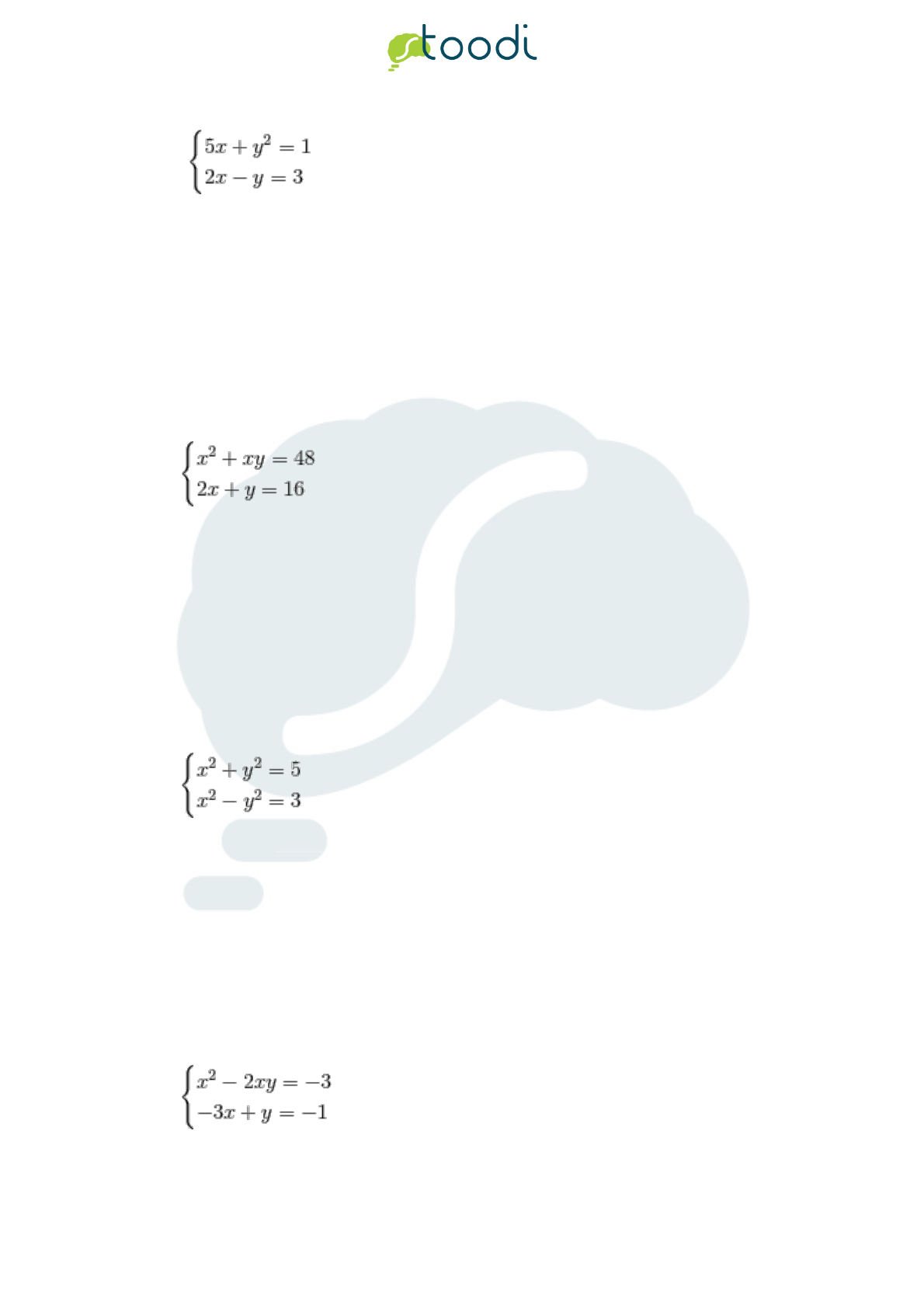 <p>Página 1</p><p>Copyright (c) 2013 - 2018 Stoodi Ensino e Treinamento a Distância LTDA - EPP - Todos os direitos reservados</p><p>1. Stoodi</p><p>A solução do sistema , é:</p><p>a. S = {(2, 1)}</p><p>b. S = {(2, 1); (0, 0)}</p><p>c. S = {(3, -2); (0, -1); (-5, -2)}</p><p>d. S = {(0, 3); (2, 14)}</p><p>e. S = { }</p><p>2. Stoodi</p><p>A solução do sistema , é:</p><p>a. S = {(–2, –6)}</p><p>b. S = {(0, 3); (–4, –1)}</p><p>c. S = {(4, 8); (12, –8)}</p><p>d. S = {(4, 12); (–1, 1); (0, 2)}</p><p>e. S = { }</p><p>3. Stoodi</p><p>A solução do sistema , é:</p><p>a. S = {(2, 1)}</p><p>b. S = {(-2, 1); (2, 1); (-2, -1); (2, -1)}</p><p>c. S = {(-5, 2); (3, -1); (-3, 0)}</p><p>d. S = {(0, –3); (1, 2)}</p><p>e. S = { }</p><p>4. Stoodi</p><p>A solução do sistema , é:</p><p>a. S = {(1, –2)}</p><p>b. S = {(-3/5, 1); (–4, –1)}</p><p>c. S = {(2, -14); (-2, 14); (3, 2)}</p><p>Página 2</p><p>Copyright (c) 2013 - 2018 Stoodi Ensino e Treinamento a Distância LTDA - EPP - Todos os direitos reservados</p><p>d. S = {(1, 2); (–3/5, -14/5)}</p><p>e. S = { }</p><p>5. Stoodi</p><p>A solução do sistema , é:</p><p>a. S={(3,-1)}</p><p>b. S={(0,3) ; (-4,-1)}</p><p>c. S={(0,-1)}</p><p>d. S={(2,4)}</p><p>e. S={ }</p><p>6. Stoodi</p><p>A solução do sistema , é:</p><p>a. S={(3,-1)}</p><p>b. S={(3,√2)}</p><p>c. S={(-3,3) ; (2,-1) ; (2,-2)}</p><p>d. S={(3,√2) ; (3, - √2)}</p><p>e. S={ }</p><p>7. Stoodi</p><p>A solução do sistema , é:</p><p>a. S = {(2, 1)}</p><p>b. S = {(2, 1); (0, 0)}</p><p>c. S = {(2, -2); (1, 4); (-3, 2)}</p><p>d. S = {(1, 2); (5, 14)}</p><p>e. S = { }</p><p>8. Stoodi</p><p>A solução do sistema , é:</p><p>Página 3</p><p>Copyright (c) 2013 - 2018 Stoodi Ensino e Treinamento a Distância LTDA - EPP - Todos os direitos reservados</p><p>a. S = {(5/3, –1)}</p><p>b. S = {(-1, 3); (0, 0)}</p><p>c. S = {(3/5, -2); (0, -1); (-3/5, -2)}</p><p>d. S = {(0, 3); (2, 14)}</p><p>e. S = { }</p><p>GABARITO: 1) e, 2) c, 3) b, 4) d, 5) b, 6) d, 7) a, 8) a,</p>