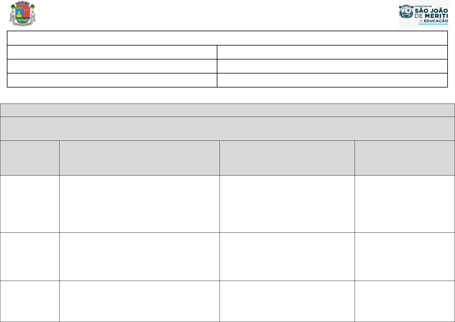 <p>ESTADO DO RIO DE JANEIRO</p><p>PREFEITURA DA CIDADE DE SÃO JOÃO DE MERITI</p><p>SECRETARIA MUNICIPAL DE EDUCAÇÃO, CULTURA E TURISMO</p><p>COORDENADORIA DE DESENVOLVIMENTO DA APRENDIZAGEM</p><p>Unidade Escolar: Creche Municipal Professor Antenor Lopes Martins</p><p>Professor(a): Ingrid Lima</p><p>Efetivo ( x ) Jornada Especial de Trabalho - JET ( ) Contrato ( )</p><p>Creche: Berçário I ( ) Berçário II ( ) Maternal I ( x ) Maternal II ( )</p><p>Turno: Integral ( ) 1º turno ( ) 2º turno( x )</p><p>Período de Planejamento: 07 / 10 /2024 à 11/ 10 / 2024</p><p>Etapa do ano letivo: ( ) 1ª ( ) 2ª ( X ) 3ª ( ) 4ª</p><p>PLANEJAMENTO SEMANAL EDUCAÇÃO INFANTIL - CRECHE</p><p>EIXO ESTRUTURANTE – INTERAÇÕES E BRINCADEIRAS</p><p>DIREITOS DE APRENDIZAGEM E DESENVOLVIMENTO</p><p>CONVIVER, BRINCAR, PARTICIPAR, EXPLORAR, EXPRESSAR E CONHECER-SE</p><p>DIAS DA SEMANA</p><p>OBJETIVOS DE APRENDIZAGEM E DESENVOLVIMENTO</p><p>VIVÊNCIAS</p><p>(Descrição da proposta)</p><p>CAMPOS DE EXPERIÊNCIA EM FOCO</p><p>2ª feira</p><p>(EI13EO05SJM) Desenvolver uma imagem positiva de si, atuando de forma cada vez mais autônoma, com confiança em sua capacidade para enfrentar dificuldades e desafios.</p><p>(EI13CG07SJM) Movimentar-se livremente nos diversos espaços observando o som, o ritmo, os movimentos da natureza e explorando os diferentes recursos naturais.</p><p>Dia do cabelo maluco</p><p>Desfile</p><p>Dança das cadeiras</p><p>O eu, o outro e o nós.</p><p>Corpo, gestos e movimentos</p><p>3ª feira</p><p>(EI13TS02SJM) Utilizar materiais variados com possibilidades de manipulação (argila, massa de modelar, areia), explorando cores, texturas, superfícies, planos, formas e volumes em suas produções.</p><p>Oficina de massinha</p><p>Traços, sons, cores e formas</p><p>4ª feira</p><p>(EI01CG01) Movimentar as partes do corpo expressando emoções, necessidades e desejos.</p><p>(EI13TS08SJM) Ampliar as possibilidades gestuais ao movimentar-se ritmicamente por meio do som de músicas de diferentes gêneros.</p><p>Bailinho de fantasia</p><p>Show de talentos</p><p>Corpo, gestos e movimentos</p><p>Traços, sons, cores e formas</p><p>5ª feira</p><p>(EI13EF13SJM) Manipular materiais impressos e audiovisuais em diferentes portadores (livro, revista, gibi, jornal, cartaz, CD, tablet,celulares, computadores, etc.), ampliando o conhecimento de seus usos sociais.</p><p>(EI13EF10SJM) Relatar experiências e fatos acontecidos, histórias ouvidas, filmes ou peças teatrais assistidas, identificando cenários, personagens e principais acontecimentos.</p><p>Cineminha</p><p>Traços, sons, cores e formas</p><p>Escuta, fala, pensamento e imaginação.</p><p>6ª feira</p><p>(EI13EO10SJM) Brincar e interagir com crianças da mesma faixa etária, de outras faixas etárias e com adultos, compartilhando espaços, materiais, objetos e brinquedos, demonstrando atitudes de cuidado e solidariedade com o outro.</p><p>(EI13CG04SJM) Explorar formas de deslocamento no espaço (pular, saltar, dançar), seguindo orientações, combinando e criando movimentos.</p><p>Festa Dia das Crianças</p><p>O eu, o outro e o nós.</p><p>Corpo, gestos e movimentos</p><p>Sábado letivo</p><p>Adaptação curricular</p><p>NÃO HOUVE NECESSIDADE DE ADAPTAÇÕES.</p><p>Preenchido por (Professor Regente): Ingrid dos R.N. de Lima em 06/ 10 / 2024</p><p>Revisado por (Equipe Técnico Pedagógica e/ou Diretor Geral e Supervisor Educacional): em _____/_____/ 20__</p><p>image1.jpeg</p><p>image2.png</p>