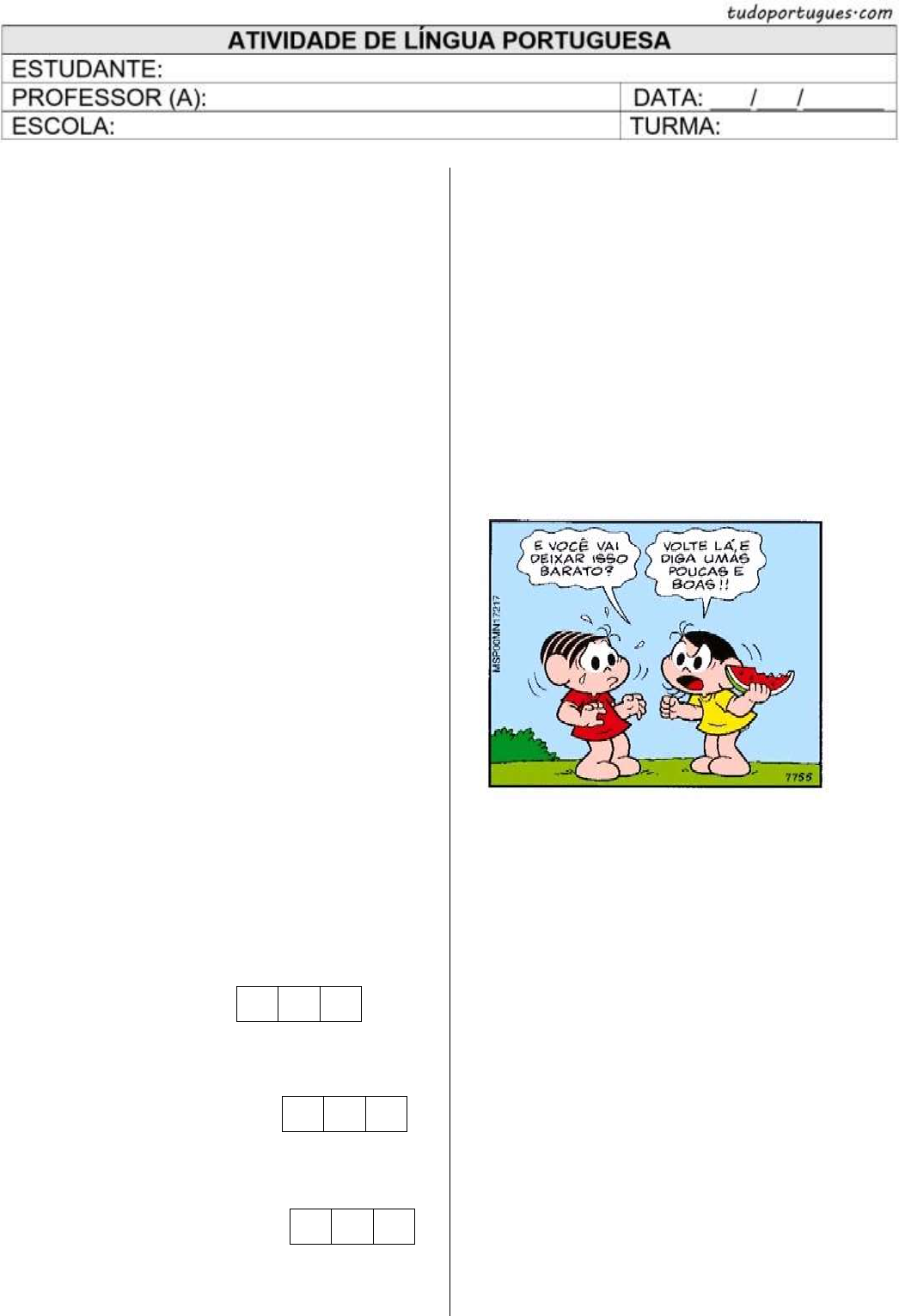 <p>Em uma frase onde há espanto, emoção,</p><p>surpresa, geralmente, usamos o sinal de</p><p>pontuação exclamação (!). Já em frase onde</p><p>há pergunta, utilizamos o sinal de pontuação</p><p>interrogação (?).</p><p>1. Coloque os sinais de pontuação no final: (?)</p><p>ou (!) nas frases abaixo.</p><p>a) O bolo está excelente</p><p>b) Por que você não vai</p><p>c) Meninas, estudem para a prova</p><p>d) Que horas são</p><p>e) Estou com raiva de você</p><p>2. O texto abaixo precisa de pontuação.</p><p>Pontue-o adequadamente.</p><p>SEU JOAQUIM</p><p>Seu joaquim quim quim</p><p>Olhou pra mim mim mim</p><p>Pediu uma sopa pa pa</p><p>E um pudim dim dim</p><p>Domínio público</p><p>3. Reescreva as frases colocando o sinal, ou</p><p>os sinais de pontuação corretamente.</p><p>a) Que dia lindo</p><p>____________________________________</p><p>____________________________________</p><p>b) Ana você viu meu relógio</p><p>____________________________________</p><p>____________________________________</p><p>c) Crianças não façam barulho</p><p>____________________________________</p><p>____________________________________</p><p>4. Relacione as colunas conforme à</p><p>pontuação adequada em cada frase.</p><p>( 1 ) Interrogação.</p><p>( 2 ) Exclamação.</p><p>( 3 ) Reticências.</p><p>( 4 ) Dois pontos.</p><p>( ) Sofia, pare com isso agora!</p><p>( ) Descobri onde estava o livro: na mochila.</p><p>( ) Ana comprou sapatos, bolsas, calças…</p><p>( ) Quer ir ao cinema comigo?</p><p>Leia a tirinha abaixo.</p><p>5. Retire da tirinha uma frase interrogativa.</p><p>____________________________________</p><p>____________________________________</p><p>____________________________________</p><p>6. Na frase: “Volte lá, e diga umas poucas e</p><p>boas!!”, os pontos de exclamação foram</p><p>usados para expressar</p><p>a) tristeza.</p><p>b) fúria.</p><p>c) alegria.</p><p>d) esperança.</p><p>7. Em qual das frases abaixo há um erro de</p><p>pontuação?</p><p>a) Gostaria de brincar comigo?</p><p>b) Isso é um absurdo!</p><p>c) Maria. Onde você foi ontem à noite!</p><p>d) E ela me disse: - Vá depressa!</p><p>, ? !</p><p>, ? !</p><p>, ? !</p><p>8. Escreva uma frase para cada imagem</p><p>utilizando os sinais de pontuação.</p><p>____________________________________</p><p>____________________________________</p><p>____________________________________</p><p>____________________________________</p><p>____________________________________</p><p>____________________________________</p><p>____________________________________</p><p>____________________________________</p><p>____________________________________</p><p>____________________________________</p><p>____________________________________</p><p>____________________________________</p><p>9. Coloque vírgulas nos lugares corretos.</p><p>a) Compre maçã laranja e beterraba.</p><p>b) Quero ir à praia não ao restaurante.</p><p>c) Maria Beatriz e Ana são melhores amigas.</p><p>d) Lucas é divertido amigável e inteligente.</p><p>10. Encontre, no diagrama, seis nomes de</p><p>sinais de pontuação e escreva-os.</p><p>P O N T O F I E R T</p><p>A E Ç R A G N D F R</p><p>R D Y A C B T T J A</p><p>E F H V V N E P K V</p><p>N G G I F M R O M E</p><p>T H T R G L R I N S</p><p>E J R G U Ç O J G S</p><p>S K A U Ç O G G R A</p><p>E X C L A M A Ç A O</p><p>H J K A O U Ç W T Z</p><p>E R L J P Y A D W C</p><p>D F T G Ç T O G S Q</p><p>1. __________________________________</p><p>2. __________________________________</p><p>3. __________________________________</p><p>4. __________________________________</p><p>5. __________________________________</p><p>6. __________________________________</p><p>?</p><p>!</p><p>:</p><p>tudoportugues.com</p>