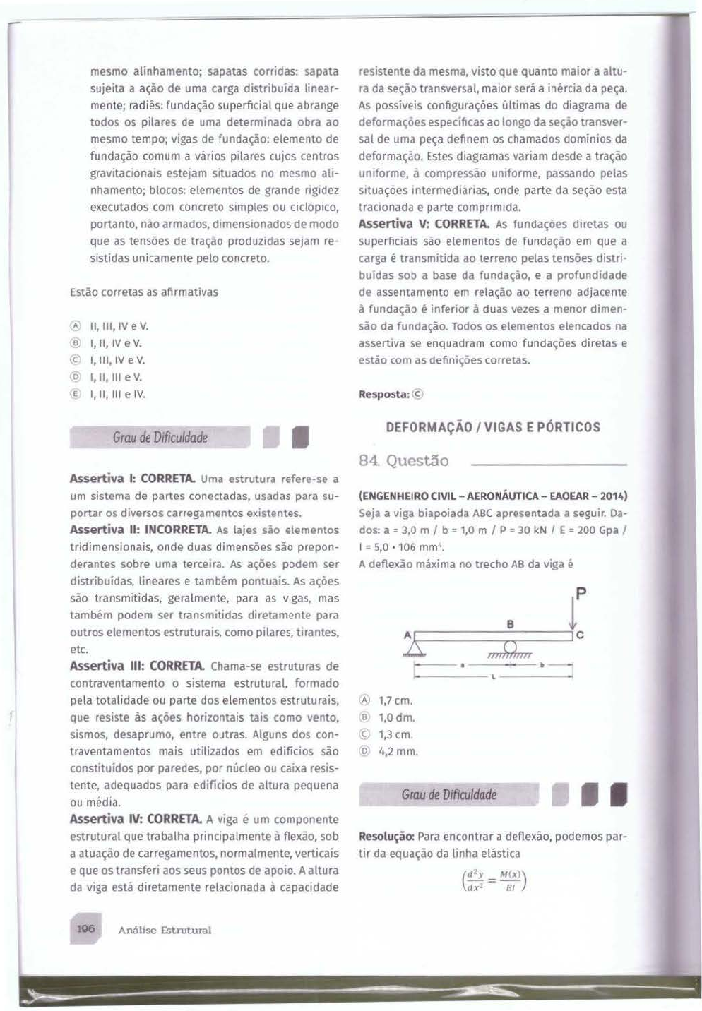 <p>mesmo alinhamento; sapatas corridas: sapata</p><p>sujeita a ação de uma carga distribuída linear</p><p>mente; radiês: fundação superficial que abrange</p><p>todos os pilares de uma determinada obra ao</p><p>mesmo tempo; vigas de fundação: elemento de</p><p>fundação comum a vários pilares cujos centros</p><p>gravitacionais estejam situados no mesmo ali</p><p>nhamento; blocos: elementos de grande rigidez</p><p>executados com concreto simples ou ciclópico,</p><p>portanto, não armados, dimensionados de modo</p><p>que as tensões de tração produzidas seJam re</p><p>sistidas unicamente pelo concreto.</p><p>Estão corretas as afirmativas</p><p>~ II,III,IVeV.</p><p>8 1,11, IV e V.</p><p>IC I, 111, IV e V.</p><p>o 1, 11,111 e v.</p><p>E) I, 11,111 e IV.</p><p>Grau de Dificuldade l i</p><p>Assertiva 1: CORRETA. Uma estrutura refere-se a</p><p>um sistema de partes conectadas, usadas para su</p><p>portar os diversos carregamentos existentes.</p><p>Assertiva 11: INCORRETA. As lajes são elementos</p><p>tridimensionais, onde duas dimensões são prepon</p><p>derantes sobre uma terceira. As ações podem ser</p><p>distribuídas, lineares e também pontuais. As ações</p><p>são transmit idas, geralmente, para as vigas, mas</p><p>também podem ser transmitidas diretamente para</p><p>outros elementos estruturais, como pilares, tirantes,</p><p>etc.</p><p>Assertiva 111: CORRETA. Chama-se estruturas de</p><p>contraventamento o sistema estrutural, formado</p><p>resistente da mesma, visto que quanto maior a altu</p><p>ra da seção transversal, maior será a inércia da peça.</p><p>As possíveis configurações últimas do diagrama de</p><p>deformações especificas ao longo da seção transver</p><p>sal de uma peça definem os chamados domínios da</p><p>deformação. Estes diagramas variam desde a tração</p><p>uniforme, a compressão uniforme, passando pelas</p><p>situações intermediárias, onde parte da seção esta</p><p>tracionada e parte comprimida.</p><p>Assertiva V: CORRETA. As fundações diretas ou</p><p>superficiais são elementos de fundação em que a</p><p>carga é transmitida ao terreno pelas tensões distri</p><p>buídas sob a base da fundação, e a profundidade</p><p>de assentamento em relação ao terreno adjacente</p><p>à fundação é inferior à duas vezes a menor dimen</p><p>são da fundação. Todos os elementos elencados na</p><p>assertiva se enquadram como fundações diretas e</p><p>estão com as definições corretas.</p><p>Resposta: c,</p><p>DEFORMAÇÃO I VIGAS E PÓRTICOS</p><p>84 Questão</p><p>(ENGENHEIRO CIVIL - AERONÁUTICA- EAOEAR- 2014)</p><p>Seja a viga biapoiada ABC apresentada a seguir. Da·</p><p>dos: a = 3,0 m I b = 1,0 m I P = 30 kN I E " 200 Gpa I</p><p>I = S,O • 106 mm4</p><p>•</p><p>A deflexão máxima no trecho AB da viga é</p><p>8 !p</p><p>AÁ-r----------~-----:J;C</p><p>.i.:. nnhJ~nn --- · I ·---</p><p>pela totalidade ou parte dos elementos estruturais, fA, 1,7 em.</p><p>que res1ste às ações horizontais ta1s como vento, 8 1,0 dm.</p><p>sismos, desaprumo, entre outras. Alguns dos con</p><p>traventamentos mais utilizados em edifícios são</p><p>constituídos por paredes, por núcleo ou caixa resis</p><p>tente, adequados para edifícios de altura pequena</p><p>ou média.</p><p>Assertiva IV: CORRETA. A viga é um componente</p><p>estrutural que trabalha principalmente à flexão, sob</p><p>a atuação de carregamentos, normalmente, verticais</p><p>e que os transferi aos seus pontos de apoio. A altura</p><p>da viga está diretamente relacionada à capacidade</p><p>196 Análise Estrutural</p><p>rc 1,3 em.</p><p>10 4,2 mm.</p><p>Grau de Dificuldade li</p><p>Resolução: Para encontrar a deflexão, podemos par</p><p>tir da equação da linha elástica</p><p>(</p><p>d'y = M(x))</p><p>dx2 ffl</p>