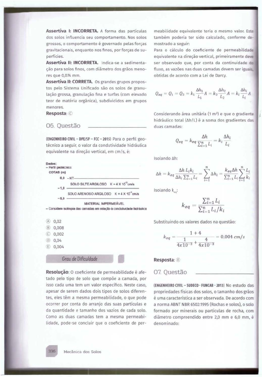 <p>Assertiva 1: INCORRETA. A forma das partículas</p><p>dos solos influencia seu comportamento. Nos solos</p><p>grossos. o comportamento é governado pelas forças</p><p>gravitacionais, enquanto nos finos, por forças de su</p><p>perfícies.</p><p>Assertiva 11: INCORRETA. Indica-se a sedimenta</p><p>ção para solos finos, com diâmetro dos grãos meno</p><p>res que 0,074 mm.</p><p>Assertiva 11: CORRETA. Os grandes grupos propos</p><p>tos pelo Sistema Umficado são os solos de granu</p><p>lação grossa, granulação fina e turfas (com elevado</p><p>teor de matéria orgânica), subdivididos em grupos</p><p>menores.</p><p>Resposta: ~</p><p>06 Questão</p><p>(ENGENHEIRO CIVIL- OPE/SP- FCC- 201S) Para o perfil geo</p><p>técnico a seguir, o valor da condutividade hidráulica</p><p>equivalente na direção vertical, em cm/s, é:</p><p>~</p><p>-Pd~</p><p>COTAll (ri)</p><p>0.0 -HT"-- ---- --- ---</p><p>SOlO SLTE MGa.OSO K • .. X 10</p><p>1</p><p>.......</p><p>-1.0 -------------</p><p>-~0---------------</p><p>'"TERIAl-..:>EIWEAVEl</p><p>-Ccndln ........ ~...,....,.~ .......</p><p>" 0,02</p><p>B 0,008</p><p>c 0,002</p><p>o 0,04</p><p>E 0,004</p><p>Grau de Dificuldade</p><p>Resolução: o coeficiente de permeabilidade é afe</p><p>tado pelo tipo de solo que compõe a camada, por</p><p>ISSO cada uma tem um valor específico. Neste caso,</p><p>apesar de serem dados dois tipos de solos diferen</p><p>tes, eles têm a mesma permeabilidade, o que pode</p><p>ocorrer por conta do arranjo das suas partículas e</p><p>da quantidade e tamanho dos vazios de cada solo.</p><p>Como as duas camadas tem a mesma permeabi</p><p>lidade, pode-se concluir que o coeficiente de per-</p><p>Mecâruca dos Solos</p><p>meabilidade equivalente teria o mesmo valor. EstE</p><p>também poderia ter sido calculado, conforme de</p><p>mostrado a seguir.</p><p>Para o cálculo do coeficiente de permeabilida</p><p>equivalente na direção vertical, primeiramente ck</p><p>ser observado que, por conta da continuidade</p><p>fluxo, as vazões nas duas camadas devem ser ig ...</p><p>obtidas de acordo com a Lei de Darcy.</p><p>Considerando área unitária (1 m1) e que o gradie~</p><p>hidráulico total (6h/L) é a soma dos gradientes das</p><p>duas camadas:</p><p>Isolando 6h:</p><p>Substituindo os valores dados na questão:</p><p>1+4</p><p>0,004cmfs</p><p>1 4</p><p>4xt o-3 + 4x10 3</p><p>Resposta: e;</p><p>0 7. Questão</p><p>(ENGENHEIRO CIVIL- SUOECO · FUNCAB · 2013) No estudo das</p><p>propriedades físicas dos solos, o tamanho dos grãos</p><p>e uma característica a ser observada. De acordo col""</p><p>a norma ABNT NBR 6502:1995 (Rochas e solos), o solo</p><p>formado por minerais ou partículas de rocha, corr</p><p>diâmetro compreendido entre 2,0 mm e 6,0 mm, e</p><p>denominado:</p>