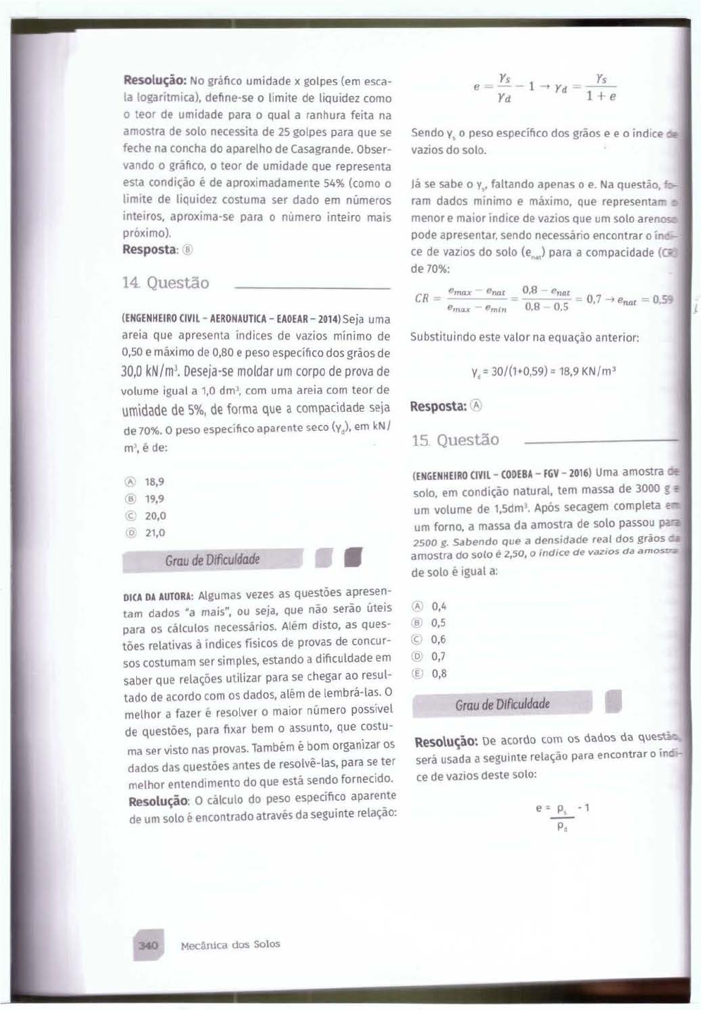 <p>Resolução: No gráfico umidade x golpes (em esca</p><p>.a aogarrtmica), define-se o limite de liquidez como</p><p>o teor de umidade para o qual a ranhura feita na</p><p>amostra de solo necessita de 25 golpes para que se</p><p>feche na concha do aparelho de Casagrande. Obser</p><p>vando o gráfico, o teor de umidade que representa</p><p>esta condição é de aproximadamente 54% (como o</p><p>limite de liquidez costuma ser dado em números</p><p>inteiros, aproxima-se para o número inteiro mais</p><p>proximo).</p><p>Resposta: a</p><p>14. Questão</p><p>(ENGENHEIRO CIVIL - AERONAUTICA - EAOEAR - 2014) Seja uma</p><p>areia que apresenta índices de vazios mínimo de</p><p>0,50 e máximo de 0,80 e peso específico dos grãos de</p><p>30,0 kN/m3• Deseja-se moldar um corpo de prova de</p><p>volume igual a 1,0 dm1, com uma areia com teor de</p><p>umidade de 5%, de forma que a compacidade seja</p><p>de 70%. o peso especafico aparente seco (vá), em kN/</p><p>ml,é de:</p><p>A 18,9</p><p>B 19,9</p><p>c 20,0</p><p>21,0</p><p>Grau de Dificu!dade ••</p><p>DICA DA AUTORA: Algumas vezes as questões apresen·</p><p>tam dados •a mais", ou seja, que não serão úteis</p><p>para os cálculos necessários. Além disto, as ques</p><p>tões relativas à andices físicos de provas de concur</p><p>sos costumam ser simples, estando a dificuldade em</p><p>saber que relações utilizar para se chegar ao resul</p><p>tado de acordo com os dados, além de lembrá-las. O</p><p>melhor a fazer é resolver o maior número possível</p><p>de questões, para fixar bem o assunto, que costu·</p><p>ma ser visto nas provas. Também é bom organizar os</p><p>dados das questões antes de resolvê-las, para se ter</p><p>melhor entendimento do que está sendo fornecido.</p><p>Resolução: o cálculo do peso específico apare~te</p><p>de um solo é encontrado através da seguinte relaçao:</p><p>340 MecAmca dos Solos</p><p>e</p><p>Ys</p><p>Yd</p><p>1</p><p>Ys</p><p>Yd- 1 +e</p><p>Sendo v o peso específico dos grãos e e o índice</p><p>vazios do solo.</p><p>Já se sabe o v,. faltando apenas o e. Na questão Õ'</p><p>ram dados mínimo e máximo, que representa"""'</p><p>menor e maior índice de vazios que um solo arenosc</p><p>pode apresentar, sendo necessário encontrar o í~</p><p>ce de vazios do solo (e. ,) para a compacidade (</p><p>de70%:</p><p>CR = emi2X ennt 0,8</p>