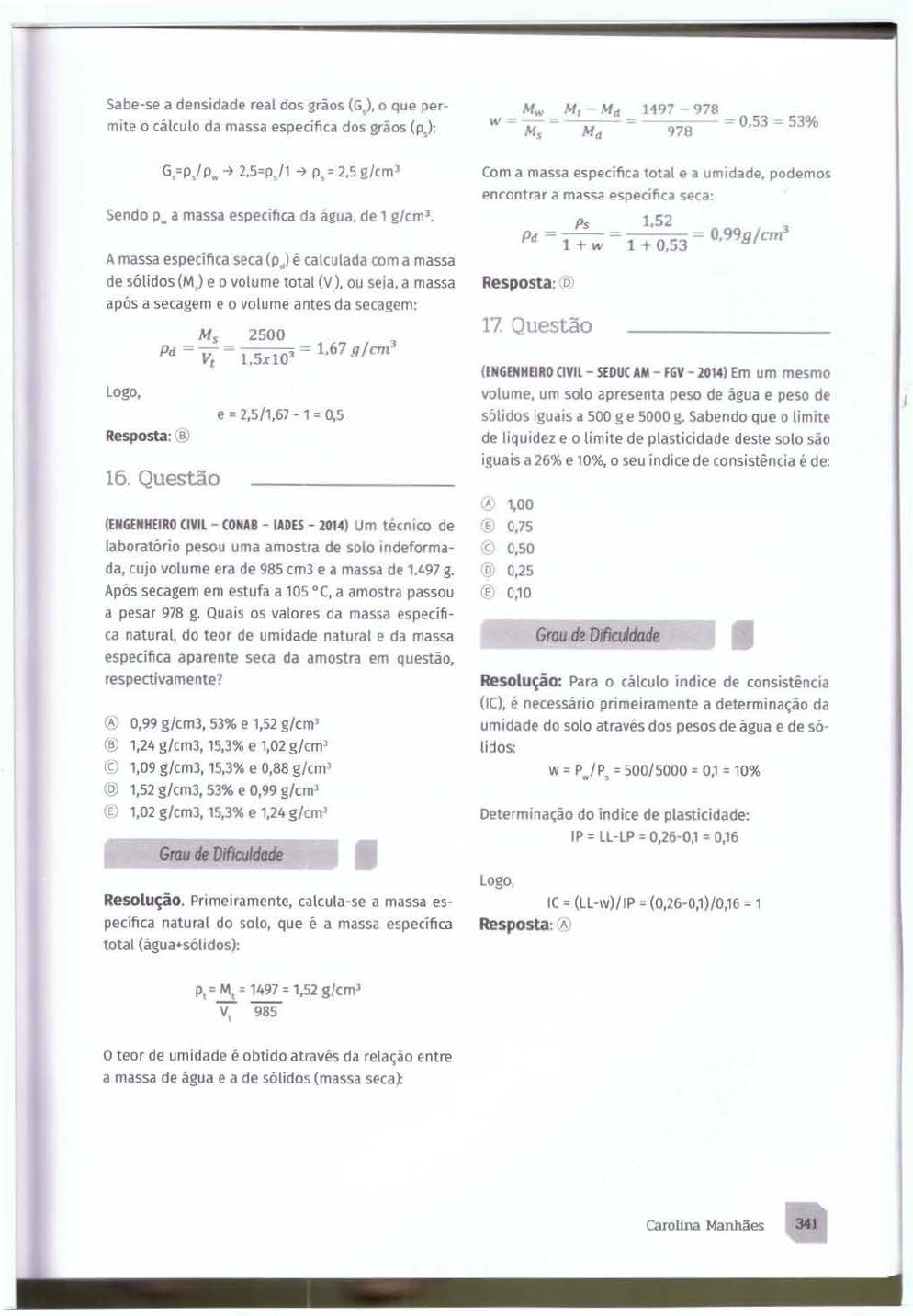<p>Sabe-se a densidade real dos grãos (GJ, o que per</p><p>mite o cálculo da massa específica dos grãos (p.):</p><p>Sendo P,. a massa específica da água, de 1 g/ cml.</p><p>A massa específica seca (pd) é calculada com a massa</p><p>de sólidos (M,) e o volume total (V,), ou se)a, a massa</p><p>após a secagem e o volume antes da secagem:</p><p>Logo,</p><p>Ms 2500</p><p>Pd -- = ---3 = 1.67 gfcm3</p><p>V, 1.5x10</p><p>e = 2,5/1,67 - 1 = o,s</p><p>Resposta: (!!</p><p>16 Questão</p><p>(ENGENHEIRO CIVIL - CONAB - IADES- 2014) Um técmco de</p><p>laboratório pesou uma amostra de solo indeforma</p><p>da, cujo volume era de 985 cm3 e a massa de 1.497 g.</p><p>Após secagem em estufa a 105 °C, a amostra passou</p><p>a pesar 978 g. Quais os valores da massa específi</p><p>ca natural, do teor de umidade natural e da massa</p><p>específica aparente seca da amostra em questão,</p><p>respectivamente?</p><p>,Al 0,99 g/cm3, 53% e 1,52 g/cm1</p><p>(~) 1,24 g/cm3, 15,3% e 1,02 g/cm1</p><p>(c) 1,09 g/cm3, 15,3% e 0,88 g/cm1</p><p>(g) 1,52 g/cm3, 53% e 0,99 g/cmJ</p><p>e 1,02 g/cm3, 15,3% e 1,24 g/cm1</p><p>Grau de Dificuldade I</p><p>1497 978</p><p>978 - 0,53 - 53%</p><p>Com a massa específica total e a umidade, podemos</p><p>encontrar a massa específica seca:</p><p>- Ps - 1.52 - 3 Pd - -</p><p>1</p><p>--</p><p>0 53</p><p>- 0,99gf cm</p><p>+w 1 + ,</p><p>Resposta: o</p><p>17. Questão</p><p>(ENGENHEI RO CIVIL- SEDUC AM - FGV - 2014) Em um mesmo</p><p>volume, um solo apresenta peso de água e peso de</p><p>sólidos igua1s a 500 g e 5000 g. Sabendo que o limite</p><p>de liqUidez e o limite de plasticidade deste solo são</p><p>iguais a 26% e 10%, o seu índice de consistência é de:</p><p>A 1,00</p><p>B 0,75</p><p>c 0,50</p><p>D 0,25</p><p>E 0,10</p><p>Grau de Díficuldade I</p><p>Resolução: Para o cálculo índice de consistênc1a</p><p>(IC), é necessário primeiramente a determinação da</p><p>umidade do solo através dos pesos de água e de só</p><p>lidos:</p><p>w = PjP. = 500/5000 = 0,1 = 10%</p><p>Determinação do índice de plasticidade:</p><p>IP = Ll-LP = 0,26-0,1 = 0,16</p><p>Logo,</p><p>Resolução. Primeiramente, calcula-se a massa es- IC = (LL-w)/IP = (0,26-0,1)/0,16 = 1</p><p>pecífica natural do solo, que é a massa específica Resposta: A</p><p>total (água•sólidos):</p><p>P,=~ = ~= 1,52 g/cml</p><p>v, 985</p><p>O teor de umidade é obtido através da relação entre</p><p>a massa de água e a de sólidos (massa seca):</p><p>Carolina Manhães 341</p>