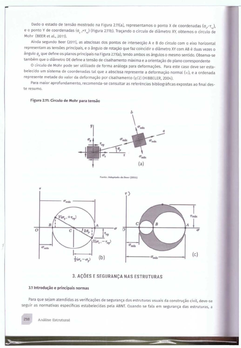 <p>Dado o estado de tensão mostrado na Figura 2.11(a), representamos o ponto X de coordenadas (o,,-r,),</p><p>e o ponto V de coordenadas (o. ,•r,) (Figura 2.11b). Traçando o círculo de diâmetro XV, obtemos o círculo de</p><p>Mohr (BEER et al., 2011).</p><p>Ainda segundo Beer (2011), as abscissas dos pontos de intersecção A e B do circulo com o eixo horizontal</p><p>representam as tensões principais, e o ângulo de rotação que faz coincidir o diâmetro XV com AB é duas vezes o</p><p>ângulo f0 que define os planos principais na Figura 2.11(a), tendo ambos os ângulos o mesmo sentido. Observa-se</p><p>também que o diâmetro DE define a tensão de cisalhamento máxima e a orientação do plano correspondente</p><p>O mculo de Mohr pode ser utilizado de forma análoga para deformações. Para este caso deve ser esta</p><p>belecido um sistema de coordenadas tal que a abscissa represente a deformação normal (c), e a ordenada</p><p>represente metade do valor da deformação por cisalhamento {y/2) {HIBBELER, 2004).</p><p>Para maior aprofundamento, recomenda-se consultar as referências bibliográficas expostas ao final des</p><p>te resumo.</p><p>Figura 2.11: Círculo de Mohr para tensão</p><p>• --</p><p>Font•: ~plodo""- (2011)</p><p>1---- cr,.. -----t</p><p>~----u~--------~</p><p>3. AÇÕES E SEGURANÇA NAS ESTRUTURAS</p><p>3.1 Introdução e principais normas</p><p>(c)</p><p>Para que seJam atendidas as verificações de segurança das estruturas usuais da construção civil, deve-se</p><p>segu1r as normativas específicas estabelecidas pela ABNT. Quando se fala em segurança das estruturas, a</p><p>218 Análise Estrutural</p>