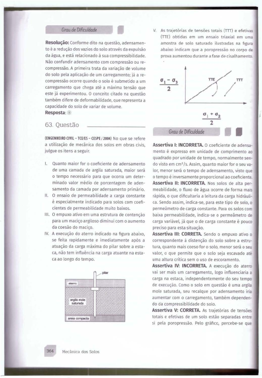 <p>Grau de D'ficutdade I</p><p>Resolução: Conforme dito na questão, adensamen</p><p>to e a redução dos vazios do solo através da expulsão</p><p>da água, e está relacionado à sua compressibilidade.</p><p>Não confundir adensamento com compressão ou re</p><p>compressão. A primeira trata da variação de volume</p><p>do solo pela aplicação de um carregamento; já a re·</p><p>compressão ocorre quando o solo é submetido a um</p><p>carregamento que chega até a máx1ma tensão que</p><p>este já experimentou. O conceito citado na questão</p><p>também difere de deformabílidade, que representa a</p><p>capacidade do solo de variar de volume.</p><p>Resposta: s</p><p>63. Questão</p><p>(ENGENHEIRO CIVIL - TCE/ES- CESPE/2004) No que se refere</p><p>V. As traJetórias de tensões totais (TTT) e efetivas</p><p>(TIE) obtidas em um ensaio triaxial em uma</p><p>amostra de solo saturado ilustradas na figur.;</p><p>abaixo indicam que a poropressão no corpo o.</p><p>prova aumentou durante a fase de cisalhamentc</p><p>Grau de Dificuldade I</p><p>a utilização de mecânica dos solos em obras civis, Assertiva 1: INCORRETA. O coeficiente de adensa-</p><p>julgue os itens a seguir. mento é expresso em unidade de comprimento ao</p><p>quadrado por unidade de tempo, normalmente sen-</p><p>1. Quanto maior for o coeficiente de adensamento do v1sto em cm1/s. Assim, quanto maior for o seu va·</p><p>de uma camada de argila saturada, maior será</p><p>o tempo necessário para que ocorra um deter</p><p>minado valor médio de porcentagem de aden</p><p>samento da camada por adensamento primário.</p><p>11. O ensaio de permeabilidade a carga constante</p><p>é especialmente indicado para solos com coefi</p><p>cientes de permeabilidade muito baixos.</p><p>111. O empuxo ativo em uma estrutura de contenção</p><p>para um maciço argiloso diminui com o aumento</p><p>da coesão do maciço.</p><p>IV. A execução do aterro mdicado na figura abaixo,</p><p>se feita rapidamente e imediatamente após a</p><p>atuação da carga máxima do pilar sobre a esta</p><p>ca, não tem influência na carga atuante na esta·</p><p>ca ao longo do tempo.</p><p>354 Mecãruca dos Solos</p><p>lor, menor será o tempo de adensamento, visto q.JE</p><p>o tempo é inversamente proporcional ao coeficiente..</p><p>Assertiva 11: INCORRETA. Nos solos de alta per</p><p>meabilidade, o fluxo de água ocorre de forma mars</p><p>rápida, o que dificultaria a leitura da carga hidrâul -</p><p>ca. Sendo assim, indica-se, para este tipo de solo, c</p><p>permeâmetro de carga constante. Para os solos cor</p><p>baixa permeabilidade, indica-se o permeãmetro ~</p><p>carga variável, já que o de carga constante é pouco</p><p>preCiso para esta situação.</p><p>Assertiva 111: CORRETA. Sendo o empuxo ativo o</p><p>correspondente á distenção do solo sobre a estn.</p><p>tura, quanto mais coeso for o solo, menor será o se</p><p>valor, o que permite que o solo seja escavado ate</p><p>uma altura crítica sem o uso de escoramento.</p><p>Assertiva IV: INCORRETA. A execução do ater</p><p>vai ser mais um carregamento, logo influenciaria ~</p><p>carga na estaca, independentemente do seu tempo</p><p>de execução. Como o solo em questão é uma argila</p><p>mole saturada, seu recalque por adensamento O.</p><p>aumentar com o carregamento, também dependen</p><p>do da compressibilidade do solo.</p><p>Assertiva V: CORRETA. As trajetórias de tensõe~</p><p>totais e efetivas de um solo estão separadas ent~</p><p>si pela poropressão. Pelo gráfico, percebe-se q""'</p>
