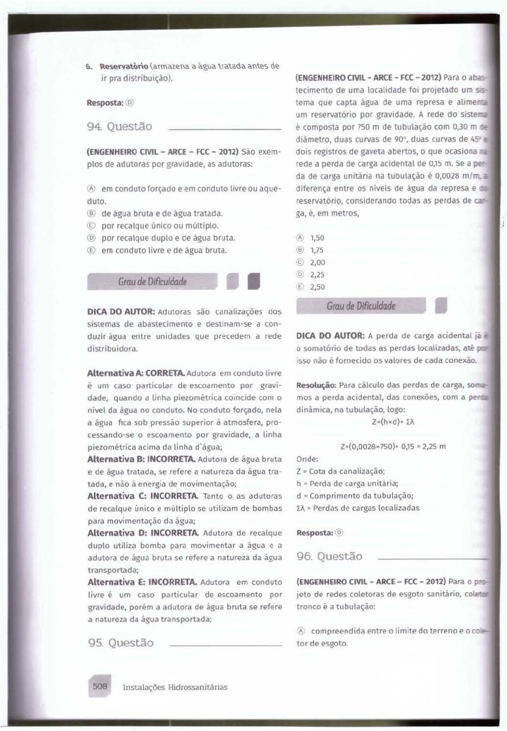 <p>6. 'P.HeNa.t.ór\o ~a.tmal.ef\a a â.%ua \ta\ada af\\es de</p><p>ir pra distribuição).</p><p>Resposta: o</p><p>94. Questão</p><p>(ENGENHEIRO CIVIL - ARCE - FCC - 2012) São exem</p><p>plos de adutoras por gravidade, as adutoras:</p><p>A) em conduto forçado e em conduto livre ou aque</p><p>duto.</p><p>(B• de água bruta e de água tratada.</p><p>© por recalque único ou múltiplo.</p><p>(o) por recalque duplo e de água bruta.</p><p>(E) em conduto livre e de água bruta.</p><p>Grau de Dificuldade l i</p><p>DICA DO AUTOR: Adutoras são canalizações dos</p><p>sistemas de abastecimento e destinam-se a con-</p><p>(ENGENHEIRO CIVIL- ARCE - FCC- 2012) Para o a~</p><p>tecimento de uma localidade fo1 projetado um s</p><p>tema que capta água de uma represa e alimer</p><p>um reservatorio por gravidade. A rede do siste</p><p>é composta por 750 m de tubulação com 0,30 rr</p><p>diâmetro, duas curvas de 90 ', duas curvas de 45</p><p>dois registros de gaveta abertos, o que ocasiona</p><p>rede a perda de carga acidental de 0,15 m. Se a -</p><p>da de carga unitária na tubulação é 0,0028 m/</p><p>diferença entre os n1veis de água da represa e</p><p>reservatório, considerando todas as perdas de</p><p>ga, é, em metros,</p><p>A 1,50</p><p>(Bl 1,75</p><p>(C 2,00</p><p>o 2,25</p><p>E 2,50</p><p>Grau de Dtficuldade I</p><p>duzir água entre unidades que precedem a rede DICA DO AUTOR: A perda de carga acidental ~</p><p>distribuidora. o somatório de todas as perdas localizadas, até</p><p>Alternativa k CORRETA. Adutora em conduto livre</p><p>é um caso particular de escoamento por gravi</p><p>dade, quando a linha p1ezométrica coincide com o</p><p>nível da água no conduto. No conduto forçado, nela</p><p>a água fica sob pressão superior à atmosfera, pro</p><p>cessando-se o escoamento por gravidade, a linha</p><p>piezométrica acima da linha d'água;</p><p>isso não ê fornecido os valores de cada conexão.</p><p>Resolução: Para cálculo das perdas de carga, so</p><p>mos a perda acidental, das conexões, com a pe</p><p>dinâmica, na tubulação, logo:</p><p>Z=(hxd)+ IÀ</p><p>Z=(0,0028•750)• 0,15 = 2,25 m</p><p>Alternativa 8: INCORRETA. Adutora de água bruta Onde:</p><p>e de água tratada, se refere a natureza da água tra- Z = Cota da canalização;</p><p>tada, e não à energia de movimentação; h = Perda de carga unitária;</p><p>Alternativa C: INCORRETA. Tanto o as adutoras d =Comprimento da tubulação;</p><p>de recalque único e múltiplo se utilizam de bombas I?.= Perdas de cargas localizadas</p><p>para movimentação da água;</p><p>Alternativa D: INCORRETA. Adutora de recalque Resposta: o</p><p>duplo utiliza bomba para movimentar a água e a</p><p>adutora de água bruta se refere a natureza da água 96. Questão</p><p>transportada;</p><p>Alternativa E: INCORRETA. Adutora em conduto (ENGENHEIRO CIVIL - ARCE - FCC- 2012) Para o r;:</p><p>livre é um caso particular de escoamento por jeto de redes coletoras de esgoto sanitário, cote</p><p>gravidade, porém a adutora de água bruta se refere tronco é a tubulação:</p><p>a natureza da água transportada;</p><p>95 Questão</p><p>508 Instalações Hldrossarut.ártas</p><p>A compreendida entre o limite do terreno e o c</p><p>to r de esgoto.</p>
