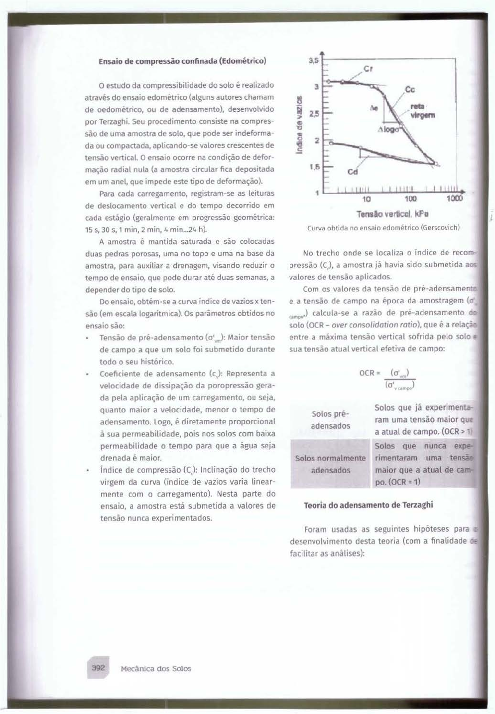 <p>Ensaio de compressão confinada (Edométrico)</p><p>O estudo da compressibilidade do solo é realizado</p><p>através do ensa1o edométnco (alguns autores chamam</p><p>de oedométrico, ou de adensamento), desenvolvido</p><p>por Terzagh1. Seu procedimento consiste na compres</p><p>são de uma amostra de solo, que pode ser indeforma</p><p>da ou compactada, aplicando-se valores crescentes de</p><p>tensão vertical. O ensa1o ocorre na condição de defor</p><p>mação radial nula (a amostra Circular fica depositada</p><p>em um anel, que 1m pede este tipo de deformação).</p><p>Para cada carregamento, registram-se as leituras</p><p>de deslocamento vert1cal e do tempo decorrido em</p><p>cada estágio (geralmente em progressão geométrica:</p><p>15 s, 30 s, 1 min, 2 min, 4 min ... 24 h).</p><p>A amostra é mantida saturada e são colocadas</p><p>duas pedras porosas, uma no topo e uma na base da</p><p>amostra, para auxiliar a drenagem, visando reduzir o</p><p>tempo de ensaio, que pode durar até duas semanas, a</p><p>depender do tipo de solo.</p><p>Do ensaio, obtém-se a curva índice de vazios x ten</p><p>sao (em escala logarítmica). Os parâmetros obtidos no</p><p>ensaio são:</p><p>Tensão de pré-adensamento (o",,.,): Maior tensão</p><p>de campo a que um solo foi submetido durante</p><p>todo o seu histórico.</p><p>Coeficiente de adensamento (c ) : Representa a</p><p>velocidade de dissipação da poropressão gera</p><p>da pela aplicação de um carregamento, ou seja,</p><p>quanto maior a velocidade, menor o tempo de</p><p>adensamento. Logo, é diretamente proporcional</p><p>á sua permeabilidade, pois nos solos com baixa</p><p>permeabilidade o tempo para que a água seja</p><p>drenada é maior.</p><p>lndice de compressão (C,): Inclinação do trecho</p><p>virgem da curva (índice de vazios varia linear</p><p>mente com o carregamento). Nesta parte do</p><p>ensaio, a amostra está submetida a valores de</p><p>tensão nunca experimentados.</p><p>392 Mecânica dos Solos</p><p>10 100</p><p>Tenllo ~•rtlcel kPe</p><p>Curva obtida no ensaio edometrico (Gerscovich)</p><p>No trecho onde se localiza o 1ndice de reco,...</p><p>pressão (C,), a amostra já havia sido submetida ac:</p><p>valores de tensão aplicados.</p><p>Com os valores da tensão de pré-adensamer'</p><p>e a tensão de campo na época da amostragem (C"</p><p>, .... ...> calcula-se a razão de pré-adensamento ..</p><p>solo (OCR- over consolidation ratio), que é a relaçz</p><p>entre a maxima tensão vert1cal sofrida pelo solo</p><p>sua tensão atual vertical efetiva de campo:</p><p>OCR= (o'_)</p><p>(o· ... _></p><p>Solos pré</p><p>adensados</p><p>Solos normalmente</p><p>adensados</p><p>Solos que já experimenta</p><p>ram uma tensão maior qw</p><p>a atual de campo. (OCR></p><p>rimentaram uma tensã::</p><p>maior que a atual de ca</p><p>po. (OCR= 1)</p><p>Teoria do adensamento de Terzaghi</p><p>Foram usadas as seguintes hipóteses para</p><p>desenvolvimento desta teoria (com a finalidade _</p><p>facilitar as análises):</p>