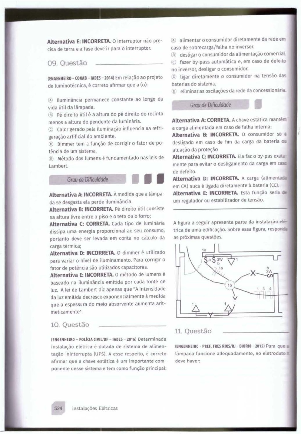 <p>Alternativa E: INCORRETA. O interruptor não pre- A alimentar o consumidor diretamente da rede em</p><p>cisa de terra e a fase deve ir para o mterruptor. caso de sobrecarga/falha no mversor.</p><p>09. Questão</p><p>(ENGENHEIRO - CONAB -IADES- 2014) Em relação ao projeto</p><p>de luminotécnica, é correto afirmar que a (o):</p><p>A lluminãncia permanece constante ao longo da</p><p>vida útil da lâmpada.</p><p>1B Pé direito útil é a altura do pé direito do recinto</p><p>menos a altura do pendente da luminária.</p><p>rc Calor gerado pela iluminação influencia na refri</p><p>geração artificial do ambiente.</p><p>(o) Dimmer tem a função de corrigir o fator de po</p><p>tência de um sistema.</p><p>e Método dos lumens é fundamentado nas leis de</p><p>Lambert.</p><p>Grau de Dificuldade 11 1</p><p>Alternativa A:. INCORRETA. À medida que a lâmpa</p><p>da se desgasta ela perde iluminãncia.</p><p>Alternativa B: INCORRETA. Pé direito útil consiste</p><p>na altura livre entre o piso e o teto ou o forro;</p><p>Alternativa C: CORRETA. Cada tipo de luminária</p><p>disstpa uma energia proporctonal ao seu consumo,</p><p>portanto deve ser levada em conta no cálculo da</p><p>carga térmica;</p><p>Alternativa D: INCORRETA. o dimmer é utilizado</p><p>para variar o nível de iluminamento. Para corrigir o</p><p>fator de potência são utilizados capacitares.</p><p>Alternativa E: INCORRETA. o método de lumens é</p><p>baseado na iluminãncta emitida por cada fonte de</p><p>luz. A lei de lambert diz apenas que "A intensidade</p><p>da luz emitida decresce exponencialmente à medida</p><p>que a espessura do meio absorvente aumenta arit</p><p>meticamente".</p><p>10 Questão</p><p>(ENGENHEIRO - POLICIA CIVIUDF - IADES - 2016) Determinada</p><p>mstalação elétrica é dotada de sistema de alimen</p><p>tação ininterrupta (UPS). A esse respeito, é correto</p><p>afirmar que a chave estática é um importante com</p><p>ponente desse sistema e tem como função principal:</p><p>524 Instalações Elétricas</p><p>s desligar o consumidor da alimentação comercia</p><p>c fazer by-pass automático e, em caso de defeito</p><p>no inversor, desligar o consumidor.</p><p>o ligar dtretamente o consumtdor na tensão das</p><p>batenas do sistema.</p><p>e eliminar as oscilações da rede da concessionária..</p><p>I Grau de Dificuldade</p><p>'-----</p><p>Alternativa A:. CORRETA. A chave estática mantê ..</p><p>a carga alimentada em caso de falha interna;</p><p>Alternativa B: INCORRETA. o consumidor só</p><p>desligado em caso de fim da carga da bateria c..</p><p>atuação da proteção</p><p>Alternativa C: INCORRETA. Ela faz o by-pas exa</p><p>mente para evitar o desligamento da carga em a::;:</p><p>de defeito.</p><p>Alternativa D: INCORRETA. A carga (alime~</p><p>em CA) nuca e hgada diretamente à bateria (CC</p><p>Alternativa E: INCORRETA. Esta função seri~</p><p>um regulador ou estabilizador de tensão.</p><p>A figura a seguir apresenta parte da instalação</p><p>trica de uma edificação. Sobre essa figura, respo</p><p>as próxtmas questões.</p><p>11 Questão</p><p>(ENGENHEIRO · PREF. TRES RIOSIRJ • BIORIO • 201S) Para que</p><p>lâmpada funcione adequadamente, no eletroduto</p><p>deve haver:</p>