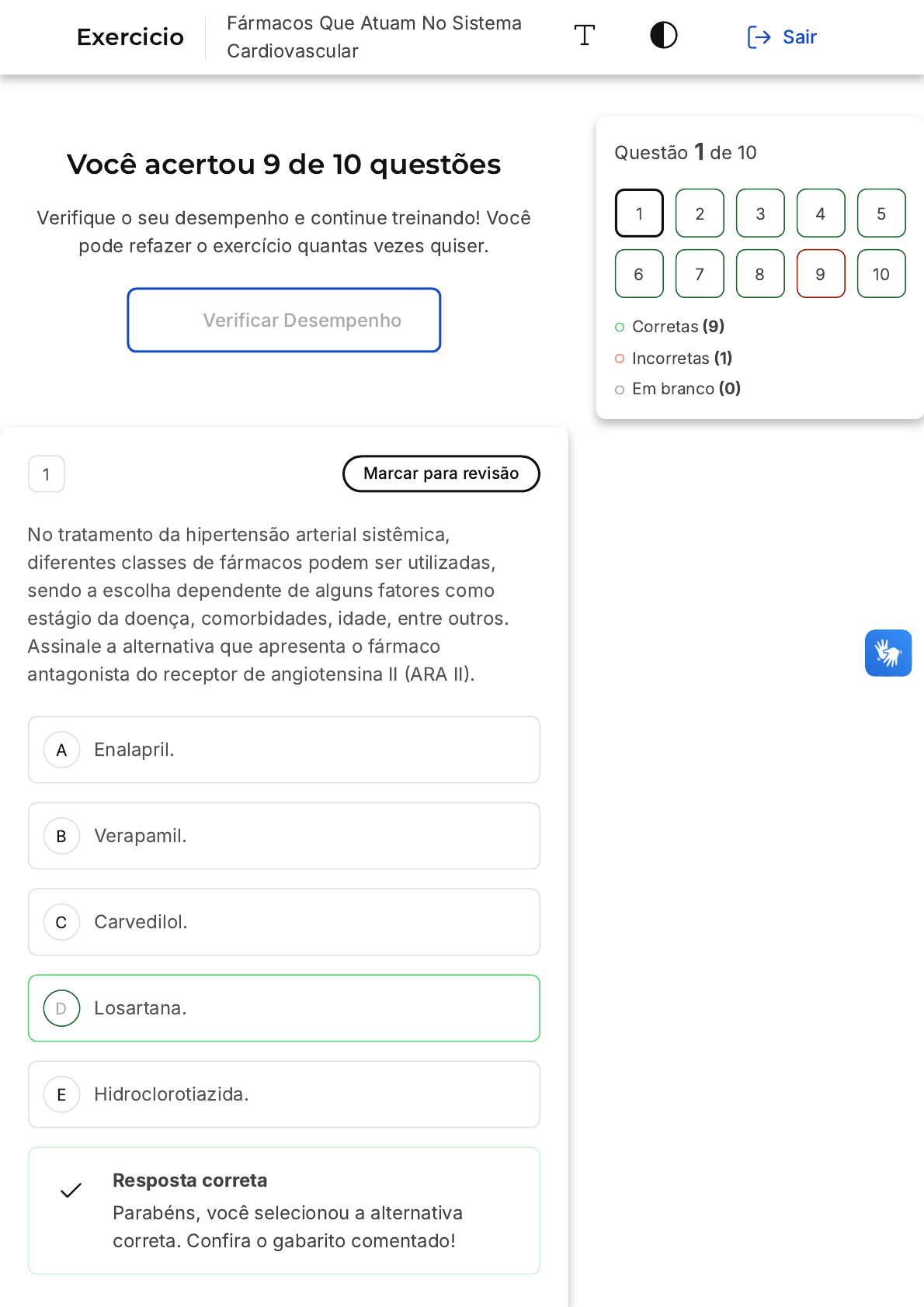 <p>Você acertou 9 de 10 questões</p><p>Verifique o seu desempenho e continue treinando! Você</p><p>pode refazer o exercício quantas vezes quiser.</p><p>Verificar Desempenho</p><p>A</p><p>B</p><p>C</p><p>D</p><p>E</p><p>1 Marcar para revisão</p><p>No tratamento da hipertensão arterial sistêmica,</p><p>diferentes classes de fármacos podem ser utilizadas,</p><p>sendo a escolha dependente de alguns fatores como</p><p>estágio da doença, comorbidades, idade, entre outros.</p><p>Assinale a alternativa que apresenta o fármaco</p><p>antagonista do receptor de angiotensina II �ARA II�.</p><p>Enalapril.</p><p>Verapamil.</p><p>Carvedilol.</p><p>Losartana.</p><p>Hidroclorotiazida.</p><p>Resposta correta</p><p>Parabéns, você selecionou a alternativa</p><p>correta. Confira o gabarito comentado!</p><p>Questão 1 de 10</p><p>Corretas �9�</p><p>Incorretas �1�</p><p>Em branco �0�</p><p>1 2 3 4 5</p><p>6 7 8 9 10</p><p>Exercicio</p><p>Fármacos Que Atuam No Sistema</p><p>Cardiovascular</p><p>Sair</p><p>A</p><p>B</p><p>C</p><p>Gabarito Comentado</p><p>A Losartana é um fármaco que atua como</p><p>antagonista dos receptores AT1 da Angiotensina II</p><p>�Ang II�. Este grupo de medicamentos, que também</p><p>inclui a candesartana, valsartana e olmesartana, são</p><p>agentes anti-hipertensivos orais que contrapõem os</p><p>efeitos da AngII sobre os receptores AT1 presentes</p><p>na musculatura vascular periférica. Isso resulta em</p><p>vasodilatação arterial e venosa, um efeito</p><p>semelhante ao dos inibidores da enzima conversora</p><p>de angiotensina (iECA). Uma vantagem desses</p><p>fármacos é que eles não aumentam os níveis de</p><p>bradicinina, que são responsáveis pelos efeitos de</p><p>tosse seca e broncoespasmo. Além de reduzir a</p><p>pressão arterial, esses medicamentos podem</p><p>diminuir a proliferação da camada íntima vascular.</p><p>2 Marcar para revisão</p><p>Em pacientes com doença cardiovascular, o tratamento</p><p>medicamentoso deve iniciar-se imediatamente. Em</p><p>relação aos Antagonistas do sistema simpático, é</p><p>CORRETO afirmar que:</p><p>Atuam por inibição da enzima conversora de</p><p>angiotensina I em II �IECA) ou bloqueio dos</p><p>receptores de angiotensina II �BRA�.</p><p>Agonistas alfa-adrenérgicos centrais inibem</p><p>centros simpáticos no sistema nervoso, mas</p><p>também podem inibir a transmissão adrenérgica</p><p>periférica.</p><p>Reduzem diretamente a resistência vascular</p><p>periférica.</p><p>D</p><p>E</p><p>Exercem ação anti-hipertensiva por meio da</p><p>excreção urinária de sódio.</p><p>A retirada desse fármaco pode ser imediata, não</p><p>tendo efeito.</p><p>Resposta correta</p><p>Parabéns, você selecionou a alternativa</p><p>correta. Confira o gabarito comentado!</p><p>Gabarito Comentado</p><p>Os simpaticolíticos de ação central, como a α-</p><p>metildopa, clonidina e guanabenzo, reduzem a</p><p>pressão arterial ao ativar os receptores α2�</p><p>adrenérgicos centrais e imidazolínicos (rilmenidina e</p><p>moxonidina) centrais. Isso resulta na redução da</p><p>atividade simpática eferente do Sistema Nervoso</p><p>Central �SNC�, levando à diminuição da Resistência</p><p>Vascular Sistêmica �RVS) e do Débito Cardíaco �DC�.</p><p>É importante ressaltar que a suspensão dessas</p><p>drogas deve ser feita de maneira gradual para evitar</p><p>o efeito rebote e o aumento rápido da pressão</p><p>arterial.</p><p>3 Marcar para revisão</p><p>O captopril e o enalapril são fármacos utilizados como</p><p>anti-hipertensivos, bem tolerados, mas apresentam</p><p>efeitos adversos característicos dessa classe de</p><p>fármacos. Assinale a alternativa que corresponde ao</p><p>mecanismo de ação e seus efeitos adversos desses</p><p>fármacos:</p><p>A</p><p>B</p><p>C</p><p>D</p><p>E</p><p>Inibição de receptores beta-adrenérgicos e</p><p>bradicardia</p><p>Inibição dos receptores alfa-adrenérgicos e</p><p>taquicardia reflexa</p><p>Inibição da formação de angiotensina II e tosse</p><p>seca</p><p>Aumento da degradação de bradicinina e tosse</p><p>seca</p><p>Bloqueio dos canais de cálcio dependente de</p><p>voltagem e hipertricose</p><p>Resposta correta</p><p>Parabéns, você selecionou a alternativa</p><p>correta. Confira o gabarito comentado!</p><p>Gabarito Comentado</p><p>O captopril e o enalapril são inibidores da enzima</p><p>conversora de angiotensina �ECA�, que é responsável</p><p>pela formação de angiotensina II, um potente</p><p>vasoconstritor. Ao inibir a formação de angiotensina</p><p>II, esses fármacos reduzem a pressão arterial. Um</p><p>dos efeitos adversos mais comuns desses</p><p>medicamentos é a tosse seca, que ocorre devido ao</p><p>aumento da bradicinina, um peptídeo que causa</p><p>tosse quando se acumula nos pulmões. Portanto, a</p><p>alternativa correta é: "Inibição da formação de</p><p>angiotensina II e tosse seca".</p><p>4 Marcar para revisão</p><p>Considerando os medicamentos utilizados no tratamento</p><p>da hipertensão, de acordo com os mecanismos de ação</p><p>desses medicamentos, podemos considerar algumas</p><p>A</p><p>B</p><p>C</p><p>D</p><p>E</p><p>características. Sobre esse contexto, analise as</p><p>assertivas e assinale a alternativa que aponta as corretas:</p><p>I. Diltiazem e verapamil são antihipertensivos</p><p>antagonistas do cálcio.</p><p>II. O alisquireno age inibindo a enzima conversora de</p><p>angiotensina II.</p><p>III. A espironolactona é um exemplo de medicamento que</p><p>age inibindo a renina.</p><p>IV. A furosemida é um diurético de alça muito utilizado no</p><p>tratamento da hipertensão.</p><p>Apenas I e II.</p><p>Apenas I e III.</p><p>Apenas II e III.</p><p>Apenas I e IV.</p><p>Apenas II e IV.</p><p>Resposta correta</p><p>Parabéns, você selecionou a alternativa</p><p>correta. Confira o gabarito comentado!</p><p>Gabarito Comentado</p><p>O alisquireno é um inibidor direto