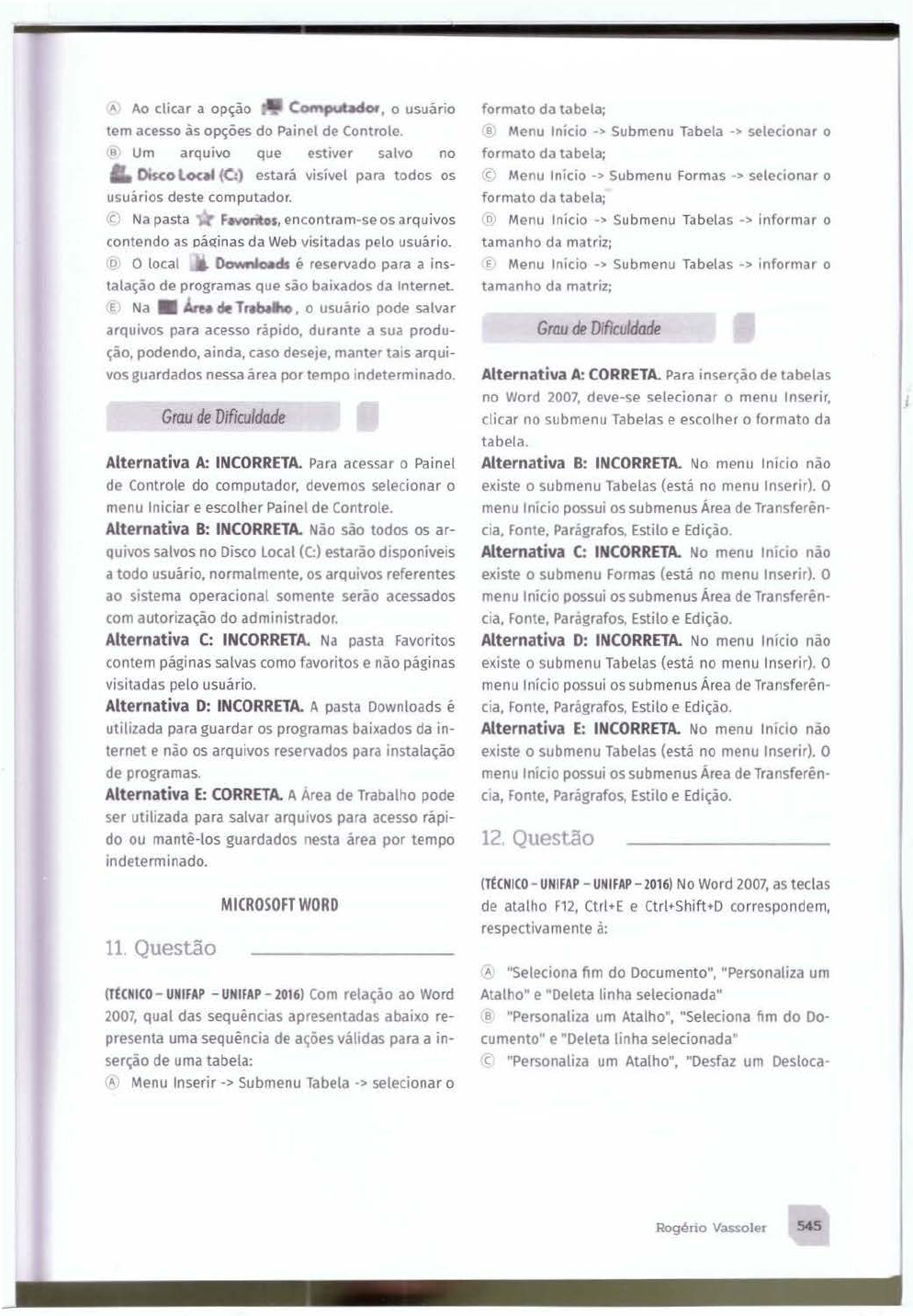 <p>A Ao clicar a opção Co-n~, o usuário</p><p>tem acesso às opções do Painel de Controle.</p><p>a Um arquivo que estiver salvo no</p><p>I. Disco l~ (C:) estará visível para todos os</p><p>usuários deste computador.</p><p>'C Na pasta F.wntos, encontram-se os arquivos</p><p>contendo as páginas da Web visitadas pelo usuário.</p><p>o O local Oownlo.tds é reservado para a ins-</p><p>talação de programas que são baixados da Internet.</p><p>E Na • Are. de lfl , o usuário pode salvar</p><p>arquivos para acesso rápido, durante a sua produ</p><p>ção, podendo, ainda, caso deseje, manter tais arqui</p><p>vos guardados nessa área por tempo indetermtnado.</p><p>Grau de Dificuldade</p><p>Alternativa A:. INCORRETA. Para acessar o Painel</p><p>de Controle do computador, devemos selecionar o</p><p>menu Iniciar e escolher Painel de Controle.</p><p>Alternativa 8: INCORRETA. Não são todos os ar</p><p>qUivos salvos no Disco Local (C:) estarão disponíveis</p><p>a todo usuário, normalmente, os arqu1vos referentes</p><p>ao sistema operacional somente serão acessados</p><p>com autorização do administrador.</p><p>Alternativa C: INCORRETA. Na pasta Favoritos</p><p>contem páginas salvas como favoritos e não páginas</p><p>visitadas pelo usuário.</p><p>Alternativa D: INCORRETA. A pasta Downloads é</p><p>utilizada para guardar os programas baixados da in</p><p>ternet e não os arquivos reservados para instalação</p><p>de programas.</p><p>Alternativa E: CORRETA. A Area de Trabalho pode</p><p>ser utilizada para salvar arquivos para acesso rápi</p><p>do ou mantê-los guardados nesta área por tempo</p><p>indeterminado.</p><p>MICROSOFT WORD</p><p>11 Questão</p><p>(TtCNICO- UNIFAP - UNIFAP- 2016) Com relação ao Word</p><p>2007, qual das sequências apresentadas abaixo re</p><p>presenta uma sequênc1a de ações válidas para a in</p><p>serção de uma tabela:</p><p>" Menu Inserir -> Submenu Tabela -> selecionar o</p><p>formato da tabela;</p><p>8 Menu lmcio -> Submenu Tabela -> selecionar o</p><p>formato da tabela;</p><p>c Menu 1níc1o -> Submenu Formas -> selec1onar o</p><p>formato da tabela;</p><p>o• Menu Início -> Submenu Tabelas -> informar o</p><p>tamanho da matriz;</p><p>e Menu Inicio -> Submenu Tabelas -> informar o</p><p>tamanho da matriz;</p><p>Grau de Dificuldade</p><p>Alternat iva A:. CORRETA. Para inserção de tabelas</p><p>no Word 2007, deve-se selecionar o menu Inserir,</p><p>clicar no submenu Tabelas e escolher o formato da</p><p>tabela.</p><p>Alternativa 8 : INCORRETA. No menu Início não</p><p>existe o submenu Tabelas (está no menu Inserir). O</p><p>menu Início possui os submenus Área de Transferên</p><p>Cia, Fonte, Parágrafos, Estilo e Edição.</p><p>Alternativa C: INCORRETA. No menu Inicio não</p><p>existe o submenu Formas (está no menu Inserir). O</p><p>menu Início possui os submenus Área de Transferên</p><p>cia, Fonte, Parágrafos, Estilo e Edição.</p><p>Alternat iva D: INCORRETA. No menu Inicio não</p><p>existe o submenu Tabelas (está no menu Inserir). O</p><p>menu Início possui os submenus Área de Transferên</p><p>cia, Fonte, Parágrafos, Estilo e Edição.</p><p>Alternat iva E: INCORRETA. No menu Início não</p><p>existe o submenu Tabelas (está no menu Inserir). O</p><p>menu 1n1cio possui os submenus Área de Transferên</p><p>cia, Fonte, Parágrafos, Estilo e Edição.</p><p>12 Questão</p><p>(TtCNICO- UNIFAP - UNIFAP- 2016) No Word 2007, as teclas</p><p>de atalho F12, Ctri+E e Ctri+Shift+D correspondem,</p><p>respectivamente à:</p><p>A "Seleciona fim do Documento", "Personaliza um</p><p>Atalho" e "Deleta linha selecionada"</p><p>8 "Personaliza um Atalho", "Seleciona fim do Do</p><p>cumento" e "Deleta linha selecionada"</p><p>c "Personaliza um Atalho", "Desfaz um Desloca-</p><p>Rogério Vassoler 545</p>