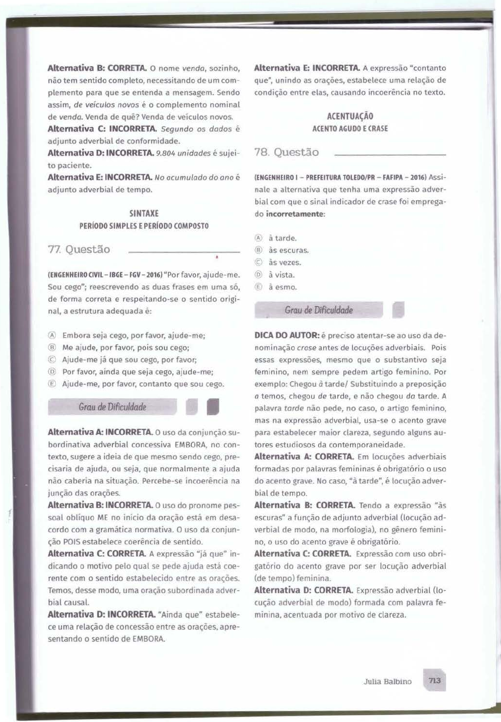 <p>Alternativa B: CORRETA. O nome vendo, sozinho, Alternativa E: INCORRETA. A expressão "contanto</p><p>não tem sentido completo, necessitando de um com- que", unindo as orações, estabelece uma relação de</p><p>plemento para que se entenda a mensagem. Sendo condição entre elas, causando incoerência no texto.</p><p>assim, de veículos novos é o complemento nominal</p><p>de vendo. Venda de quê? Venda de veículos novos. ACENTUAÇÃO</p><p>Alternativa C: INCORRETA. Segundo os dados é ACENTO AGUDO E CRA SE</p><p>adjunto adverbial de conformidade.</p><p>Alternativa O: INCORRETA. 9.804 unidades é sujei- 78. Questão</p><p>to paciente.</p><p>Alternativa E: INCORRETA. No acumulado do ano é (ENGENHEIRO I - PREFEITURA TOLEDO/PR - FAFIPA - 2016) Assi-</p><p>adjunto adverbial de tempo. nale a alternativa que tenha uma expressão adver</p><p>bial com que o sinal indicador de crase foi emprega-</p><p>SINTAXE</p><p>PERfOOO SIMPLES E PERfODO COMPOSTO</p><p>77. Questão</p><p>(ENGENHEIRO CIVIL - IBGE - FGV-2016) "Por favor, ajude-me.</p><p>Sou cego"; reescrevendo as duas frases em uma só,</p><p>de forma correta e respeitando-se o sentido origi</p><p>nal, a estrutura adequada é:</p><p>A Embora seja cego, por favor, ajude-me;</p><p>a) Me ajude, por favor, pois sou cego;</p><p>'é Ajude-me já que sou cego, por favor;</p><p>~o) Por favor, ainda que seja cego, ajude-me;</p><p>e Ajude-me, por favor, contanto que sou cego.</p><p>Grau de Dificuldade I</p><p>Alternativa A:. INCORRETA. O uso da conjunção su</p><p>bordinativa adverbial concessiva EMBORA, no con</p><p>texto, sugere a ideia de que mesmo sendo cego, pre</p><p>ctsaria de ajuda, ou seja, que normalmente a ajuda</p><p>não caberia na situação. Percebe-se incoerência na</p><p>junção das orações.</p><p>Alternativa B: INCORRETA. O uso do pronome pes</p><p>soal oblíquo ME no início da oração está em desa</p><p>cordo com a gramática normativa. O uso da conjun</p><p>ção POIS estabelece coerência de sentido.</p><p>Alternativa C: CORRETA. A expressão "já que· in</p><p>dicando o motivo pelo qual se pede ajuda está coe</p><p>rente com o sentido estabelecido entre as oraçoes.</p><p>Temos, desse modo, uma oração subordinada adver</p><p>bial causal.</p><p>Alternativa O: INCORRETA. "Ainda que· estabele</p><p>ce uma relação de concessão entre as orações, apre</p><p>sentando o sentido de EMBORA.</p><p>do incorretamente:</p><p>A à tarde.</p><p>s' às escuras.</p><p>c às vezes.</p><p>O• à vista.</p><p>t à esmo.</p><p>Grau de DifiCuldade</p><p>DICA DO AUTOR: é preciso atentar-se ao uso da de</p><p>nominação crase antes de locuções adverbiais. Pois</p><p>essas expressões, mesmo que o substantivo seja</p><p>feminino, nem sempre pedem artigo feminino. Por</p><p>exemplo: Chegou à tarde/ Substituindo a preposição</p><p>a temos, chegou de tarde, e não chegou do tarde. A</p><p>palavra tarde não pede, no caso, o artigo feminino,</p><p>mas na expressão adverbial, usa-se o acento grave</p><p>para estabelecer maior clareza, segundo alguns au</p><p>tores estudiosos da contemporaneidade.</p><p>Alternativa A:. CORRETA. Em locuções adverbiais</p><p>formadas por palavras femininas é obrigatório o uso</p><p>do acento grave. No caso, "à tarde", é locução adver</p><p>bial de tempo.</p><p>Alternativa B: CORRETA. Tendo a expressão "às</p><p>escuras· a função de adjunto adverbial {locução ad</p><p>verbtal de modo, na morfologia), no gênero femini</p><p>no, o uso do acento grave é obrigatório.</p><p>Alternativa C: CORRETA. Expressão com uso obri</p><p>gatório do acento grave por ser locução adverbial</p><p>{de tempo) feminina</p><p>Alternativa 0: CORRETA. Expressão adverbial {lo</p><p>cução adverbial de modo) formada com palavra fe</p><p>minina, acentuada por motivo de clareza.</p><p>Julia Balbmo 713</p>