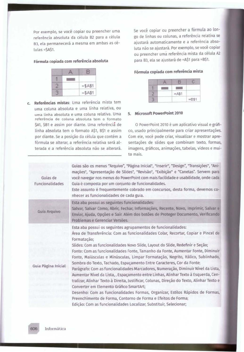 <p>-----------------------~~</p><p>Por exemplo, se você copiar ou preencher uma</p><p>referência absoluta da célula B2 para a célula</p><p>B3, ela permanecerá a mesma em ambas as cé·</p><p>lulas =$A$1.</p><p>se você copiar ou preencher a fórmula ao lon</p><p>go de linhas ou colunas, a referência relativa se</p><p>ajustará automaticamente e a referência abso·</p><p>luta não se ajustará. Por exemplo, se você copiar</p><p>ou preencher uma referência mista da célula A1</p><p>para B3, ela se ajustará de =A$1 para =B$1. Fórmula copiada com referência absoluta</p><p>=$A$1</p><p>=$A$1</p><p>Fórmula copiada com referência mista</p><p>c. Referências mistas: Uma referência mista tem</p><p>uma coluna absoluta e uma linha relativa, ou</p><p>uma linha absoluta e uma coluna relativa Uma S. Microsoft PowerPoint 2010</p><p>referéncia de coluna absoluta tem o formato</p><p>$A1, $B1 e assim por diante. Uma referênciá de O PowerPoint 2010 é um aplicativo visual e gráfi</p><p>tinha absoluta tem o formato A$1, B$1 e assim co, usado pnnCipalmente para criar apresentações.</p><p>por diante. Se a pos1ção da célula que contém a Com ele, você pode criar, visualizar e mostrar apre·</p><p>fórmula se alterar, a referência relativa será ai· sentações de slides que combmam texto, formas.</p><p>terada e a referência absoluta não se alterará imagens, gráficos, ammações, tabelas, vídeos e mu</p><p>to mais.</p><p>Guias de</p><p>Funcionalidades</p><p>Guia Arqu1vo</p><p>Guia Página Inicial</p><p>606 Informática</p><p>Guias são os menus "Arquivo·, "Página Inicial", "Inserir'', "Design", "Transições", "Ani·</p><p>mações•, "Apresentação de Slides•, "Revisão", "Exibição" e ·canetas". Servem pap</p><p>você navegar nos menus do PowerPoint com mais facilidade e usabilidade, onde cada</p><p>Guia é composta por um conjunto de funcionalidades.</p><p>Este assunto é frequentemente cobrado em concursos, desta forma, devemos co</p><p>nhecer as funcionalidades de cada guia.</p><p>Est:l aba poss, 1s s•·:, lint( 1 n,</p>