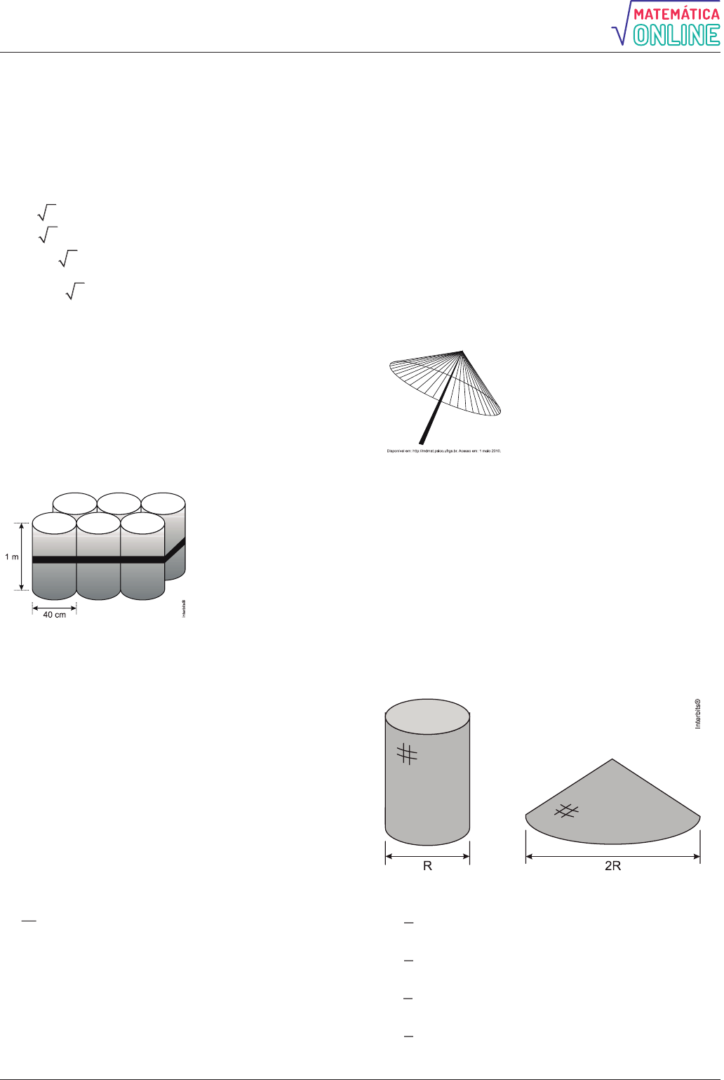 <p>Alisson Marques - online</p><p>2</p><p>Suponha que você seja o operador da máquina que</p><p>produzirá os tubos maiores em que serão colocados,</p><p>sem ajustes ou folgas, quatro tubos cilíndricos</p><p>internos. Se o raio da base de cada um dos cilindros</p><p>menores for igual a 6 cm, a máquina por você operada</p><p>deverá ser ajustada para produzir tubos maiores, com</p><p>raio da base igual a</p><p>a) 12 cm</p><p>b) 12 2cm</p><p>c) 24 2cm</p><p>d) 6 1 2 cm</p><p>e) 12 1 2 cm</p><p>5. (Enem 2ª aplicação 2010) O administrador de uma</p><p>cidade, implantando uma política de reutilização de</p><p>materiais descartados, aproveitou milhares de</p><p>tambores cilíndricos dispensados por empresas da</p><p>região e montou kits com seis tambores para o</p><p>abastecimento de água em casas de famílias de baixa</p><p>renda, conforme a figura seguinte. Além disso, cada</p><p>família envolvida com o programa irá pagar somente</p><p>R$ 2,50 por metro cúbico utilizado.</p><p>Uma família que utilizar 12 vezes a capacidade total</p><p>do kit em um mês pagará a quantia de</p><p>(considere 3 )</p><p>a) R$ 86,40.</p><p>b) R$ 21,60.</p><p>c) R$ 8,64.</p><p>d) R$ 7,20.</p><p>e) R$ 1,80.</p><p>6. (Unemat 2010) Para projetar um reservatório</p><p>cilíndrico de volume 81 m3, dispõe-se de uma área</p><p>circular de 6 m de diâmetro. Considerando = 3,14,</p><p>a altura deverá ser de:</p><p>a) 6 m</p><p>b) 9 m</p><p>c) 12 m</p><p>d) 81 m</p><p>6</p><p></p><p>e) 3 m</p><p>7. (Enem 2ª aplicação 2010) Uma empresa de</p><p>refrigerantes, que funciona sem interrupções, produz</p><p>um volume constante de 1 800 000 cm3 de líquido por</p><p>dia. A máquina de encher garrafas apresentou um</p><p>defeito durante 24 horas. O inspetor de produção</p><p>percebeu que o líquido chegou apenas à altura de 12</p><p>cm dos 20 cm previstos em cada garrafa. A parte</p><p>inferior da garrafa em que foi depositado o líquido tem</p><p>forma cilíndrica com raio da base de 3 cm. Por</p><p>questões de higiene, o líquido já engarrafado não será</p><p>reutilizado.</p><p>Utilizando 3 , no período em que a máquina</p><p>apresentou defeito, aproximadamente quantas</p><p>garrafas foram utilizadas?</p><p>a) 555</p><p>b) 5555</p><p>c) 1333</p><p>d) 13333</p><p>e) 133333</p><p>8. (Enem 2011) A figura seguinte mostra um modelo</p><p>de sombrinha muito usado em países orientais.</p><p>Esta figura é uma representação de uma superfície de</p><p>revolução chamada de</p><p>a) pirâmide.</p><p>b) semiesfera.</p><p>c) cilindro.</p><p>d) tronco de cone.</p><p>e) cone.</p><p>9. (Unicamp 2011) Depois de encher de areia um</p><p>molde cilíndrico, uma criança virou-o sobre uma</p><p>superfície horizontal. Após a retirada do molde, a areia</p><p>escorreu, formando um cone cuja base tinha raio igual</p><p>ao dobro do raio da base do cilindro.</p><p>A altura do cone formado pela areia era igual a</p><p>a) 3</p><p>4</p><p>da altura do cilindro.</p><p>b) 1</p><p>2</p><p>da altura do cilindro.</p><p>c) 2</p><p>3</p><p>da altura do cilindro.</p><p>d) 1</p><p>3</p><p>da altura do cilindro.</p>