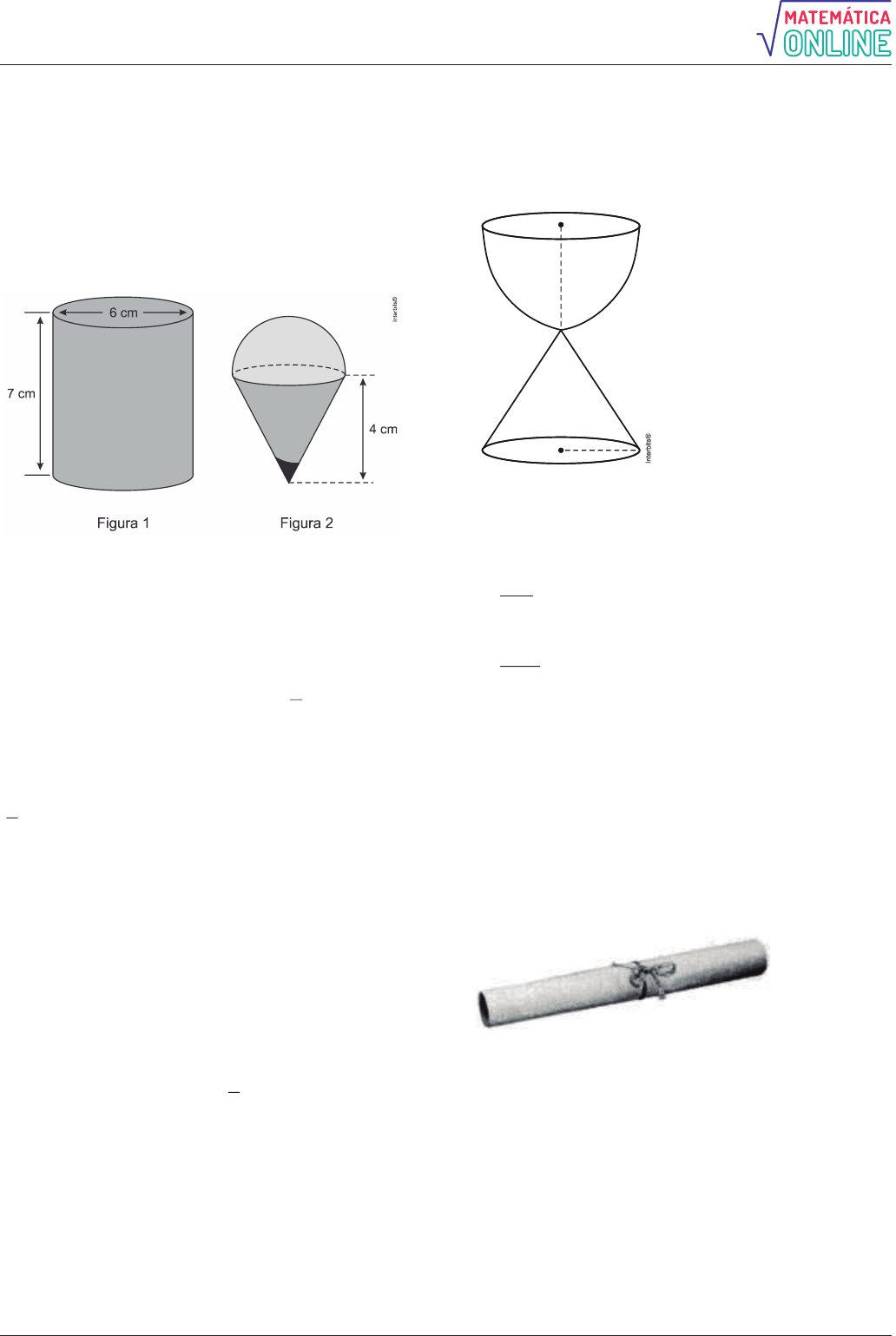 <p>Alisson Marques - online</p><p>5</p><p>22. (Enem PPL 2014) Para fazer um pião, brinquedo</p><p>muito apreciado pelas crianças, um artesão utilizará o</p><p>torno mecânico para trabalhar num pedaço de</p><p>madeira em formato de cilindro reto, cujas medidas do</p><p>diâmetro e da altura estão ilustradas na Figura 1. A</p><p>parte de cima desse pião será uma semiesfera, e a</p><p>parte de baixo, um cone com altura 4 cm, conforme</p><p>Figura 2. O vértice do cone deverá coincidir com o</p><p>centro da base do cilindro.</p><p>O artesão deseja fazer um pião com a maior altura</p><p>que esse pedaço de madeira possa proporcionar e de</p><p>modo a minimizar a quantidade de madeira a ser</p><p>descartada.</p><p>Dados:</p><p>O volume de uma esfera de raio r é 34 r ;</p><p>3</p><p> </p><p>O volume do cilindro de altura h e área da base S é</p><p>S h;</p><p>O volume do cone de altura h e área da base S é</p><p>1 S h;</p><p>3</p><p> </p><p>Por simplicidade, aproxime para 3.</p><p>A quantidade de madeira descartada, em centímetros</p><p>cúbicos, é</p><p>a) 45. b) 48. c) 72. d) 90. e) 99.</p><p>23. (Unifor 2014) Um depósito cheio de combustível</p><p>tem a forma de um cone circular reto. O combustível</p><p>deve ser transportado por um único caminhão no qual</p><p>o tanque transportador tem a forma de um cilindro</p><p>circular reto, cujo raio da base mede metade do raio</p><p>da base do depósito e altura 1</p><p>3</p><p>da altura do depósito.</p><p>Quantas viagens o caminhão deverá fazer para</p><p>esvaziar completamente o depósito, se para cada</p><p>viagem a capacidade do tanque é preenchida?</p><p>a) 2</p><p>b) 3</p><p>c) 4</p><p>d) 5</p><p>e) 6</p><p>24. (Cefet MG 2014) Um artesão resolveu fabricar</p><p>uma ampulheta de volume total V constituída de uma</p><p>semiesfera de raio 4 cm e de um cone reto, com raio</p><p>e altura 4 cm, comunicando-se pelo vértice do cone,</p><p>de acordo com a figura abaixo.</p><p>Para seu funcionamento, o artesão depositará na</p><p>ampulheta areia que corresponda a 25% de V.</p><p>Portanto o volume de areia, em cm3, é</p><p>a) 16 .</p><p>b) 64 .</p><p>3</p><p>c) 32 .</p><p>d) 128 .</p><p>3</p><p>e) 64 .</p><p>25. (Enem 2014) Uma empresa que organiza eventos</p><p>de formatura confecciona canudos de diplomas a</p><p>partir de folhas de papel quadradas. Para que todos</p><p>os canudos fiquem idênticos, cada folha é enrolada</p><p>em torno de um cilindro de madeira de diâmetro d em</p><p>centímetros, sem folga, dando-se 5 voltas completas</p><p>em torno de tal cilindro. Ao final, amarra-se um cordão</p><p>no meio do diploma, bem ajustado, para que não</p><p>ocorra o desenrolamento, como ilustrado na figura.</p><p>Em seguida, retira-se o cilindro de madeira do meio</p><p>do papel enrolado, finalizando a confecção do</p><p>diploma. Considere que a espessura da folha de papel</p><p>original seja desprezível.</p><p>Qual é a medida, em centímetros, do lado da folha de</p><p>papel usado na confecção do diploma?</p><p>a) d</p><p>b) 2 d</p><p>c) 4 d</p><p>d) 5 d</p><p>e) 10 d</p>