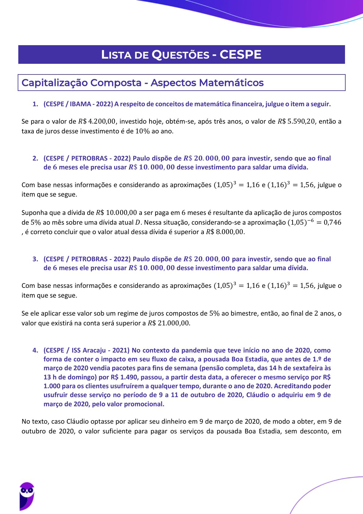 <p>1</p><p>LISTA DE QUESTÕES - CESPE</p><p>Capitalização Composta - Aspectos Matemáticos</p><p>1. (CESPE / IBAMA - 2022) A respeito de conceitos de matemática financeira, julgue o item a seguir.</p><p>Se para o valor de 𝑅$ 4.200,00, investido hoje, obtém-se, após três anos, o valor de 𝑅$ 5.590,20, então a</p><p>taxa de juros desse investimento é de 10% ao ano.</p><p>2. (CESPE / PETROBRAS - 2022) Paulo dispõe de 𝑹$ 𝟐𝟎. 𝟎𝟎𝟎, 𝟎𝟎 para investir, sendo que ao final</p><p>de 𝟔 meses ele precisa usar 𝑹$ 𝟏𝟎. 𝟎𝟎𝟎, 𝟎𝟎 desse investimento para saldar uma dívida.</p><p>Com base nessas informações e considerando as aproximações (1,05)3 = 1,16 e (1,16)3 = 1,56, julgue o</p><p>item que se segue.</p><p>Suponha que a dívida de 𝑅$ 10.000,00 a ser paga em 6 meses é resultante da aplicação de juros compostos</p><p>de 5% ao mês sobre uma dívida atual 𝐷. Nessa situação, considerando-se a aproximação (1,05)−6 = 0,746</p><p>, é correto concluir que o valor atual dessa dívida é superior a 𝑅$ 8.000,00.</p><p>3. (CESPE / PETROBRAS - 2022) Paulo dispõe de 𝑹$ 𝟐𝟎. 𝟎𝟎𝟎, 𝟎𝟎 para investir, sendo que ao final</p><p>de 𝟔 meses ele precisa usar 𝑹$ 𝟏𝟎. 𝟎𝟎𝟎, 𝟎𝟎 desse investimento para saldar uma dívida.</p><p>Com base nessas informações e considerando as aproximações (1,05)3 = 1,16 e (1,16)3 = 1,56, julgue o</p><p>item que se segue.</p><p>Se ele aplicar esse valor sob um regime de juros compostos de 5% ao bimestre, então, ao final de 2 anos, o</p><p>valor que existirá na conta será superior a 𝑅$ 21.000,00.</p><p>4. (CESPE / ISS Aracaju - 2021) No contexto da pandemia que teve início no ano de 2020, como</p><p>forma de conter o impacto em seu fluxo de caixa, a pousada Boa Estadia, que antes de 1.º de</p><p>março de 2020 vendia pacotes para fins de semana (pensão completa, das 14 h de sextafeira às</p><p>13 h de domingo) por R$ 1.490, passou, a partir desta data, a oferecer o mesmo serviço por R$</p><p>1.000 para os clientes usufruírem a qualquer tempo, durante o ano de 2020. Acreditando poder</p><p>usufruir desse serviço no período de 9 a 11 de outubro de 2020, Cláudio o adquiriu em 9 de</p><p>março de 2020, pelo valor promocional.</p><p>No texto, caso Cláudio optasse por aplicar seu dinheiro em 9 de março de 2020, de modo a obter, em 9 de</p><p>outubro de 2020, o valor suficiente para pagar os serviços da pousada Boa Estadia, sem desconto, em</p><p>Equipe Exatas Estratégia Concursos</p><p>Aula 07</p><p>PETROBRAS (Cargos Área Técnica) Matemática - 2023 (Pós-Edital)</p><p>www.estrategiaconcursos.com.br</p><p>102</p><p>116</p>