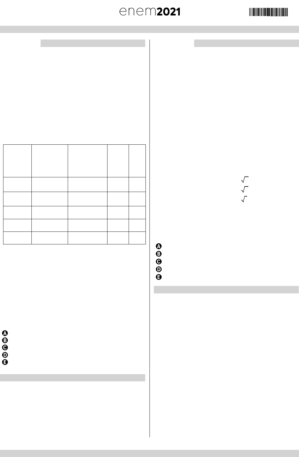 <p>///////////////////////////////////////////////////////////////////////////////////////////////////////////////////////////////////////////////////////////////////////////</p><p>///////////////////////////////////////////////////////////////////////////////////////////////////////////////////////////////////////////////////////////////////////////</p><p>I8020 – Help Educacional | Caderno de questões – Página 3</p><p>Questão 7 ////////////////////////////////////////////////////////////</p><p>A cor de uma estrela tem relação com a temperatura</p><p>em sua superfície. Estrelas não muito quentes (cerca</p><p>de 3 000 K) nos parecem avermelhadas. Já as</p><p>estrelas amarelas, como o Sol, possuem</p><p>temperatura em torno dos 6 000 K; as mais quentes</p><p>são brancas ou azuis porque sua temperatura fica</p><p>acima dos 10.000 K.</p><p>A tabela apresenta uma classificação espectral e</p><p>outros dados para as estrelas dessas classes.</p><p>Estrelas da Sequência Principal</p><p>Classe</p><p>Espect</p><p>ral</p><p>Temperat</p><p>ura</p><p>Luminosid</p><p>ade</p><p>Mas</p><p>sa</p><p>Rai</p><p>o</p><p>O5 40.000 55 10 40 18</p><p>B0 28.000 42 10 18 7</p><p>A0 9.900 80 3 2.5</p><p>G2 5.770 1 1 1</p><p>M0 3.480 0,06 0,5 0,6</p><p>Temperatura em Kelvin</p><p>Luminosa, massa e raio, tomando o Sol como</p><p>unidade.</p><p>Disponível em: http://www.zenite.nu. Acesso em: 1</p><p>maio 2010 (adaptado).</p><p>Se tomarmos uma estrela que tenha temperatura 5</p><p>vezes maior que a temperatura do Sol, qual será a</p><p>ordem de grandeza de sua luminosidade?</p><p>20 000 vezes a luminosidade do Sol.</p><p>28 000 vezes a luminosidade do Sol.</p><p>28 850 vezes a luminosidade do Sol.</p><p>30 000 vezes a luminosidade do Sol.</p><p>50 000 vezes a luminosidade do Sol.</p><p>///////////////////////////////////////////////////////////////////////////////////</p><p>Questão 8 ////////////////////////////////////////////////////////////</p><p>Criptografia é a prática de codificar e decodificar</p><p>dados. Quando os dados são criptografados, é</p><p>aplicado um algoritmo para codificá-los de modo que</p><p>eles não tenham mais o formato original e, portanto,</p><p>não possam ser lidos. Os dados só podem ser</p><p>decodificados no formato original com o uso de uma</p><p>chave de descriptografia específica.</p><p>Disponível em:>. Acesso em 05/08/2019.</p><p>Um código simples de criptografia consiste em</p><p>calcular a raiz quadrada dos algarismos formadores</p><p>de um número e dispor os 2 primeiros algarismos</p><p>das raízes de forma ordenada e sequencial. Por</p><p>exemplo:</p><p>444991 202020303010,= pois:</p><p>4 2,0</p><p>9 3,0</p><p>1 1,0</p><p> =</p><p></p><p>=</p><p></p><p>=</p><p>Abaixo, são descritas cinco senhas criptografadas.</p><p>Assinale a única cuja construção está de acordo com</p><p>a regra apresentada no texto acima.</p><p>345672 172021242710=</p><p>125677 101424232626=</p><p>456899 202224283030=</p><p>876901 302624300010=</p><p>149087 102030002827=</p><p>///////////////////////////////////////////////////////////////////////////////////</p>