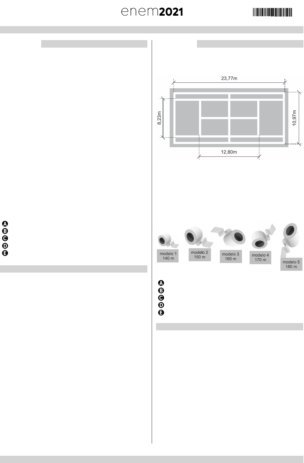 <p>///////////////////////////////////////////////////////////////////////////////////////////////////////////////////////////////////////////////////////////////////////////</p><p>///////////////////////////////////////////////////////////////////////////////////////////////////////////////////////////////////////////////////////////////////////////</p><p>I8020 – Help Educacional | Caderno de questões – Página 3</p><p>Questão 8 ////////////////////////////////////////////////////////////</p><p>Os números de identificação utilizados no cotidiano</p><p>(de contas bancárias, de CPF, de Carteira de</p><p>Identidade etc) usualmente possuem um dígito de</p><p>verificação, normalmente representado após o hífen,</p><p>como em −17326 9. Esse dígito adicional tem a</p><p>finalidade de evitar erros no preenchimento ou</p><p>digitação de documentos. Um dos métodos usados</p><p>para gerar esse dígito utiliza os seguintes passos:</p><p>1. multiplica-se o último algarismo do número por</p><p>1, o penúltimo por 2, o antepenúltimo por 1, e</p><p>assim por diante, sempre alternando</p><p>multiplicações por 1 e por 2.</p><p>2. soma-se 1 a cada um dos resultados dessas</p><p>multiplicações que for maior do que ou igual a</p><p>10.</p><p>3. somam-se os resultados obtidos.</p><p>4. calcula-se o resto da divisão dessa soma por</p><p>10, obtendo-se assim o dígito verificador.</p><p>O dígito de verificação fornecido pelo processo</p><p>acima para o número 24685 é</p><p>1.</p><p>2.</p><p>4.</p><p>6.</p><p>8.</p><p>///////////////////////////////////////////////////////////////////////////////////</p><p>Questão 9 ////////////////////////////////////////////////////////////</p><p>Uma quadra de tênis apresenta as seguintes</p><p>medidas:</p><p>Para fazer as linhas de marcação (faixas brancas)</p><p>da quadra, foi usada uma fita branca que adere ao</p><p>chão. Essa fita, com 5 cm de largura, é vendida em</p><p>rolos de diferentes metragens, conforme as figuras</p><p>(meramente ilustrativas). Como houve o mínimo de</p><p>sobra, que modelo de fita foi utilizado?</p><p>modelo 1</p><p>modelo 2</p><p>modelo 3</p><p>modelo 4</p><p>modelo 5</p><p>///////////////////////////////////////////////////////////////////////////////////</p>