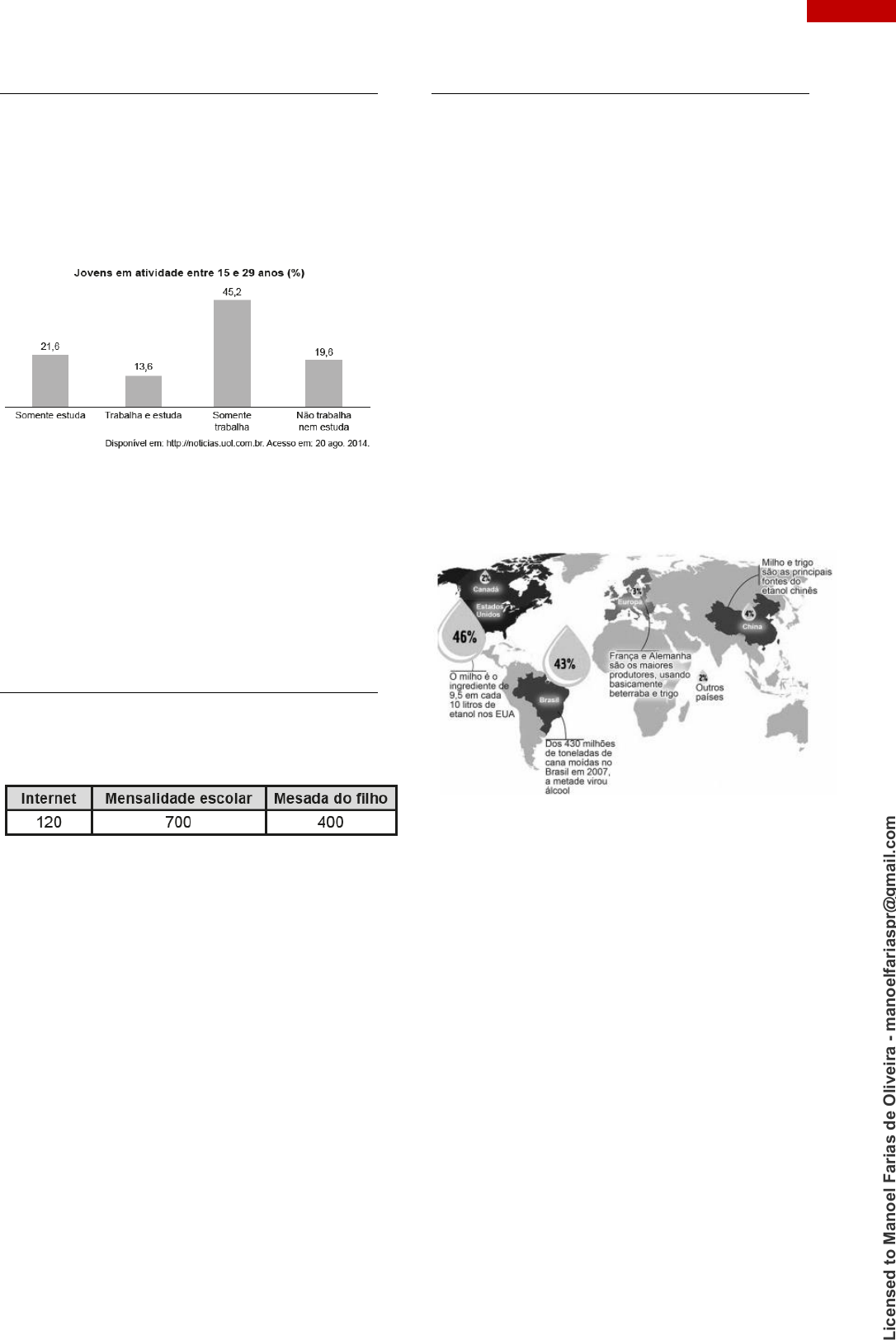 <p>261 PORCENTAGEM</p><p>QUESTÃO 7 (ENEM 2020)</p><p>A Pesquisa Nacional por Amostra de</p><p>Domicílios (Pnad) é uma pesquisa feita anualmente</p><p>pelo IBGE, exceto nos anos em que há Censo. Em</p><p>um ano, foram entrevistados 363 mil jovens para</p><p>fazer um levantamento sobre suas atividades</p><p>profissionais e/ou acadêmicas. Os resultados da</p><p>pesquisa estão indicados no gráfico.</p><p>De acordo com as informações dadas, o</p><p>número de jovens entrevistados que trabalha é</p><p>A) 114 708.</p><p>B) 164 076.</p><p>C) 213 444.</p><p>D) 284 592.</p><p>E) 291 582.</p><p>QUESTÃO 8 (ENEM 2020)</p><p>O quadro representa os gastos mensais,</p><p>em real, de uma família com internet, mensalidade</p><p>escolar e mesada do filho.</p><p>No início do ano, a internet e a mensalidade</p><p>escolar tiveram acréscimos, respectivamente, de</p><p>20% e 10%. Necessitando manter o valor da</p><p>despesa mensal total com os itens citados, a família</p><p>reduzirá a mesada do filho.</p><p>Qual será a porcentagem da redução da mesada?</p><p>A) 15,0</p><p>B) 23,5</p><p>C) 30,0</p><p>D) 70,0</p><p>E) 76,5</p><p>QUESTÃO 9 (ENEM 2020 DIGITAL)</p><p>Com a crise dos alimentos em 2008,</p><p>governantes e empresários de várias partes do</p><p>mundo relacionaram a expansão dos</p><p>biocombustíveis com a alta do preço da comida.</p><p>Em 2006, a produção mundial de etanol foi de 40</p><p>bilhões de litros e a de biodiesel, de 6,5 bilhões. Os</p><p>EUA defendem seu etanol de milho ao afirmar que</p><p>só 3% da inflação dos cereais é causada pelos</p><p>biocombustíveis. Para a Organização das Nações</p><p>Unidas (ONU), os biocombustíveis respondem por</p><p>10% da alta do preço da comida e, para o Banco</p><p>Mundial, por 75%. Ao lado dessa polêmica, cresce</p><p>o consenso de que biocombustível não é sempre</p><p>igual. O impacto sobre o preço dos alimentos é bem</p><p>diferente quando se considera o álcool combustível</p><p>brasileiro, feito da cana; o etanol norte-americano,</p><p>fabricado com milho; e o biodiesel europeu, feito de</p><p>grãos como o trigo, por exemplo. Nessa disputa, o</p><p>Brasil está bem posicionado. O mapa seguinte</p><p>mostra a distribuição percentual de etanol fabricado</p><p>no mundo, em 2007.</p><p>Disponível em: planetasustentavel.abril.com.br. Acesso em: 29 mar.</p><p>2009</p><p>De acordo com o texto e o mapa de percentuais de</p><p>fabricação de etanol fabricado no mundo, podemos</p><p>concluir que a quantidade de etanol feito de milho,</p><p>nos Estados Unidos, representa</p><p>A) 16,25% da produção mundial.</p><p>B) 43,70% da produção mundial.</p><p>C) 46,00% da produção mundial.</p><p>D) 75,00% da produção mundial.</p><p>E) 95,00% da produção mundial.</p><p>L</p><p>ic</p><p>en</p><p>se</p><p>d</p><p>t</p><p>o</p><p>M</p><p>an</p><p>o</p><p>el</p><p>F</p><p>ar</p><p>ia</p><p>s</p><p>d</p><p>e</p><p>O</p><p>liv</p><p>ei</p><p>ra</p><p>-</p><p>m</p><p>an</p><p>o</p><p>el</p><p>fa</p><p>ri</p><p>as</p><p>p</p><p>r@</p><p>g</p><p>m</p><p>ai</p><p>l.c</p><p>o</p><p>m</p>