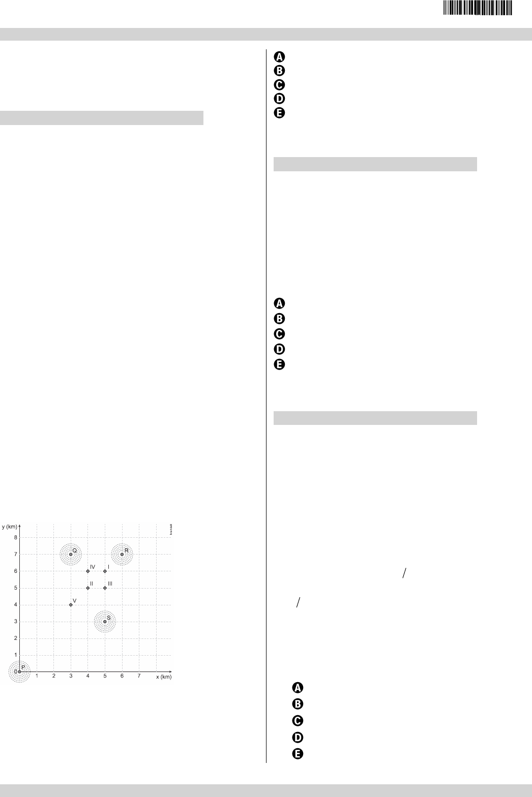 <p>enem2021</p><p>///////////////////////////////////////////////////////////////////////////////////////////////////////////////////////////////////////////////////////////////////////////</p><p>///////////////////////////////////////////////////////////////////////////////////////////////////////////////////////////////////////////////////////////////////////////</p><p>I8020 – Help Educacional | Caderno de questões – Página 1</p><p>MATEMÁTICA E SUAS TECNOLOGIAS</p><p>Questões de 1 a 15</p><p>Questão 1</p><p>////////////////////////////////////////////////////////////</p><p>Um aplicativo de relacionamentos funciona da</p><p>seguinte forma: o usuário cria um perfil com</p><p>foto e informações pessoais, indica as</p><p>características dos usuários com quem deseja</p><p>estabelecer contato e determina um raio de</p><p>abrangência a partir da sua localização. O</p><p>aplicativo identifica as pessoas que se</p><p>encaixam no perfil desejado e que estão a uma</p><p>distância do usuário menor ou igual ao raio de</p><p>abrangência. Caso dois usuários tenham perfis</p><p>compatíveis e estejam numa região de</p><p>abrangência comum a ambos, o aplicativo</p><p>promove o contato entre os usuários, o que é</p><p>chamado de match.</p><p>O usuário P define um raio de abrangência</p><p>com medida de 3 km e busca ampliar a</p><p>possibilidade de obter um match se deslocando</p><p>para a região central da cidade, que concentra</p><p>um maior número de usuários. O gráfico ilustra</p><p>alguns bares que o usuário P costuma</p><p>frequentar para ativar o aplicativo, indicados</p><p>por I, II, III, IV e V. Sabe-se que os usuários</p><p>Q, R e S, cujas posições estão descritas pelo</p><p>gráfico, são compatíveis com o usuário P, e</p><p>que estes definiram raios de abrangência</p><p>respectivamente iguais a 3 km, 2 km e 5 km.</p><p>Com base no gráfico e nas afirmações</p><p>anteriores, em qual bar o usuário P teria a</p><p>possibilidade de um match com os usuários</p><p>Q, R e S, simultaneamente?</p><p>I</p><p>II</p><p>III</p><p>IV</p><p>V</p><p>Questão 2</p><p>////////////////////////////////////////////////////////////</p><p>Foi utilizado o plano cartesiano para a</p><p>representação de um pavimento de lojas. A loja</p><p>A está localizada no ponto A(1; 2). No ponto</p><p>médio entre a loja A e a loja B está o sanitário</p><p>S, localizado no ponto S(5;10).</p><p>Determine as coordenadas do ponto de</p><p>localização da loja B.</p><p>( 3; 6)− −</p><p>( 6; 3)− −</p><p>(3; 6)</p><p>(9;18)</p><p>(18; 9)</p><p>Questão 3</p><p>////////////////////////////////////////////////////////////</p><p>Observou-se que todas as formigas de um</p><p>formigueiro trabalham de maneira ordeira e</p><p>organizada. Foi feito um experimento com duas</p><p>formigas e os resultados obtidos foram</p><p>esboçados em um plano cartesiano no qual os</p><p>eixos estão graduados em quilômetros. As</p><p>duas formigas partiram juntas do ponto O,</p><p>origem do plano cartesiana xOy. Uma delas</p><p>caminhou horizontalmente para o lado direito, a</p><p>uma velocidade de 4 km h. A outra caminhou</p><p>verticalmente para cima, à velocidade de</p><p>3 km h.</p><p>Após 2 horas de movimento, quais as</p><p>coordenadas cartesianas das posições de cada</p><p>formiga?</p><p>(8; 0) e (0; 6).</p><p>(4; 0) e (0; 6).</p><p>(4; 0) e (0; 3).</p><p>(0; 8) e (6; 0).</p><p>(0; 4) e (3; 0).</p>