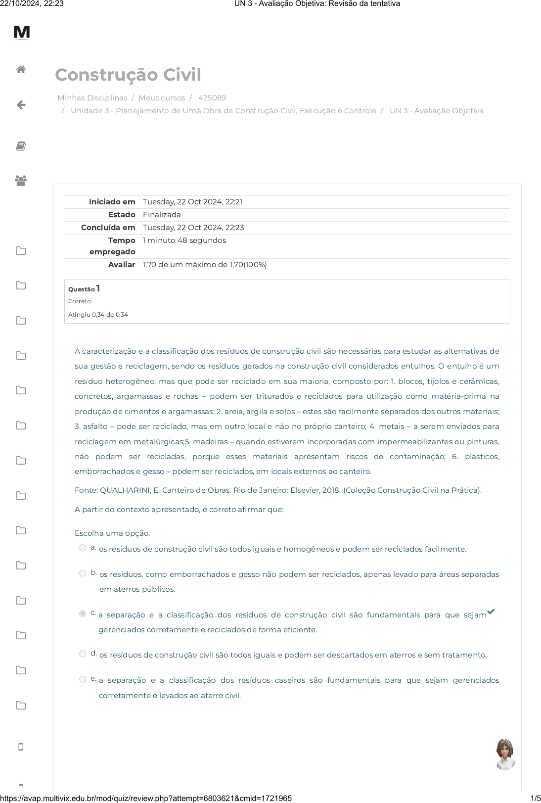 <p>Minhas Disciplinas / Meus cursos / 425089</p><p>/ Unidade 3 - Planejamento de Uma Obra de Construção Civil, Execução e Controle / UN 3 - Avaliação Objetiva</p><p>Construção Civil</p><p>Iniciado em Tuesday, 22 Oct 2024, 22:21</p><p>Estado Finalizada</p><p>Concluída em Tuesday, 22 Oct 2024, 22:23</p><p>Tempo</p><p>empregado</p><p>1 minuto 48 segundos</p><p>Avaliar 1,70 de um máximo de 1,70(100%)</p><p>Questão 1</p><p>Correto</p><p>Atingiu 0,34 de 0,34</p><p>A caracterização e a classi�cação dos resíduos de construção civil são necessárias para estudar as alternativas de</p><p>sua gestão e reciclagem, sendo os resíduos gerados na construção civil considerados entulhos. O entulho é um</p><p>resíduo heterogêneo, mas que pode ser reciclado em sua maioria, composto por: 1. blocos, tijolos e cerâmicas,</p><p>concretos, argamassas e rochas – podem ser triturados e reciclados para utilização como matéria-prima na</p><p>produção de cimentos e argamassas; 2. areia, argila e solos – estes são facilmente separados dos outros materiais;</p><p>3. asfalto – pode ser reciclado, mas em outro local e não no próprio canteiro; 4. metais – a serem enviados para</p><p>reciclagem em metalúrgicas;5. madeiras – quando estiverem incorporadas com impermeabilizantes ou pinturas,</p><p>não podem ser recicladas, porque esses materiais apresentam riscos de contaminação; 6. plásticos,</p><p>emborrachados e gesso – podem ser reciclados, em locais externos ao canteiro.</p><p>Fonte: QUALHARINI, E. Canteiro de Obras. Rio de Janeiro: Elsevier, 2018. (Coleção Construção Civil na Prática).</p><p>A partir do contexto apresentado, é correto a�rmar que:</p><p>Escolha uma opção:</p><p>a. os resíduos de construção civil são todos iguais e homogêneos e podem ser reciclados facilmente.</p><p>b. os resíduos, como emborrachados e gesso não podem ser reciclados, apenas levado para áreas separadas</p><p>em aterros públicos.</p><p>c. a separação e a classi�cação dos resíduos de construção civil são fundamentais para que sejam</p><p>gerenciados corretamente e reciclados de forma e�ciente.</p><p></p><p>d. os resíduos de construção civil são todos iguais e podem ser descartados em aterros e sem tratamento.</p><p>e. a separação e a classi�cação dos resíduos caseiros são fundamentais para que sejam gerenciados</p><p>corretamente e levados ao aterro civil.</p><p></p><p></p><p></p><p></p><p></p><p></p><p></p><p></p><p></p><p></p><p></p><p></p><p></p><p></p><p></p><p></p><p></p><p></p><p></p><p></p><p>22/10/2024, 22:23 UN 3 - Avaliação Objetiva: Revisão da tentativa</p><p>https://avap.multivix.edu.br/mod/quiz/review.php?attempt=6803621&cmid=1721965 1/5</p><p>https://avap.multivix.edu.br/my/</p><p>https://avap.multivix.edu.br/course/view.php?id=29714</p><p>https://avap.multivix.edu.br/course/view.php?id=29714§ion=4</p><p>https://avap.multivix.edu.br/mod/quiz/view.php?id=1721965</p><p>https://avap.multivix.edu.br/my/</p><p>https://avap.multivix.edu.br/course/view.php?id=29714</p><p>https://avap.multivix.edu.br/user/index.php?id=29714</p><p>https://avap.multivix.edu.br/course/view.php?id=29714§ion=1</p><p>https://avap.multivix.edu.br/course/view.php?id=29714§ion=2</p><p>https://avap.multivix.edu.br/course/view.php?id=29714§ion=3</p><p>https://avap.multivix.edu.br/course/view.php?id=29714§ion=4</p><p>https://avap.multivix.edu.br/course/view.php?id=29714§ion=5</p><p>https://avap.multivix.edu.br/course/view.php?id=29714§ion=6</p><p>https://avap.multivix.edu.br/course/view.php?id=29714§ion=7</p><p>https://avap.multivix.edu.br/course/view.php?id=29714§ion=8</p><p>https://avap.multivix.edu.br/course/view.php?id=29714§ion=9</p><p>https://avap.multivix.edu.br/course/view.php?id=29714§ion=10</p><p>https://avap.multivix.edu.br/course/view.php?id=29714§ion=11</p><p>https://avap.multivix.edu.br/course/view.php?id=29714§ion=12</p><p>https://avap.multivix.edu.br/course/view.php?id=29714§ion=13</p><p>https://avap.multivix.edu.br/course/view.php?id=29714§ion=14</p><p>https://avap.multivix.edu.br/hooks/portal/</p><p>https://avap.multivix.edu.br/mod/page/view.php?id=1252%2F%22%20target%3D%22_blank</p><p>https://avap.multivix.edu.br/</p><p>https://avap.multivix.edu.br/</p><p>https://avap.multivix.edu.br/</p><p>https://avap.multivix.edu.br/</p><p>https://avap.multivix.edu.br/</p><p>https://avap.multivix.edu.br/</p><p>Questão 2</p><p>Correto</p><p>Atingiu 0,34 de 0,34</p><p>Fonte: BRASIL. Ministério da Agricultura e Pecuária. Instituo Nacional de Meteorologia. Comparativo de chuvas</p><p>em novembro 2020 e 2021 no Brasil. Brasília, DF: 10 dez. 2021. Disponível em:</p><p>https://portal.inmet.gov.br/noticias/comparativo-de-chuvas-em-novembro-2020-e-2021-no-brasil. Acesso em: 31</p><p>mar. 2023.</p><p>Observando o grá�co acima, relativo ao clima (porcentagem de chuvas) nas regiões do Brasil, é possível a�rmar</p><p>que:</p><p>I. no total, 2021 foi um ano mais castigado pelas chuvas que 2020.</p><p>II. a Região Nordeste, em 2020, foi prejudicada nas obras e, em 2021, �cou preocupante o setor pelo excesso de</p><p>chuvas.</p><p>III. a Região Sul, em 2021, entrou em estado preocupante, com chuvas �cando muito acima da previsão de 0%.</p><p>IV. a Região Centro-Oeste teve a maior variação entre os anos, chegando a 84%.</p><p>Selecione a alternativa correta.</p><p>Escolha uma opção:</p><p>a. I, II e III estão corretas.</p><p>b. I, II e IV estão corretas. </p><p>c. I, II, III e IV estão corretas.</p><p>d. Apenas I e II estão corretas.</p><p>e. I, III e IV estão corretas.</p><p></p><p></p><p></p><p></p><p></p><p></p><p></p><p></p><p></p><p></p><p></p><p></p><p></p><p></p><p></p><p></p><p></p><p></p><p></p><p></p><p>22/10/2024, 22:23 UN 3 - Avaliação Objetiva: Revisão da tentativa</p><p>https://avap.multivix.edu.br/mod/quiz/review.php?attempt=6803621&cmid=1721965 2/5</p><p>https://portal.inmet.gov.br/noticias/comparativo-de-chuvas-em