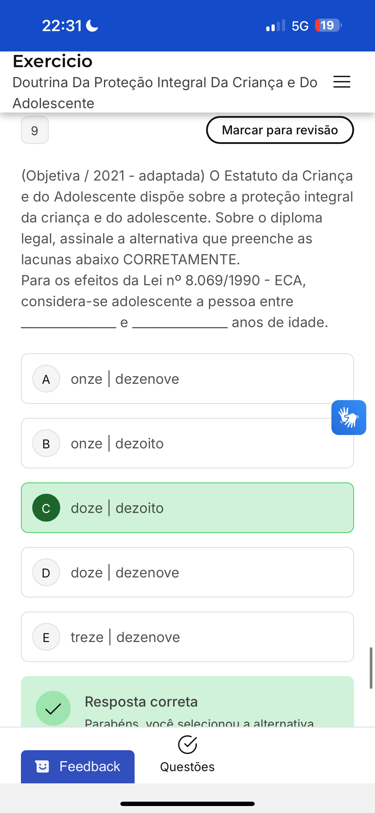22:31 C 5G 19 Exercicio Doutrina Da Proteção Integral Da Criança e Do Adolescente 9 Marcar para revisão (Objetiva / 2021 - adaptada) O Estatuto da Criança e do Adolescente dispõe sobre a proteção integral da criança e do adolescente. Sobre o diploma legal, assinale a alternativa que preenche as lacunas abaixo CORRETAMENTE. Para os efeitos da Lei n° 8.069/1990 - ECA, considera-se adolescente a pessoa entre e anos de idade. A onze dezenove B onze dezoito C doze dezoito D doze dezenove E treze dezenove Resposta correta você a alternativa i Feedback Questões