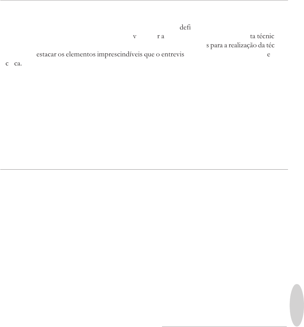 <p>237</p><p>Evidência, Araxá, v. 7, n. 7, p. 237-250, 2011</p><p>A utilização da técnica da entrevista</p><p>em trabalhos científicos</p><p>Prof. Álvaro Francisco de Britto Júnior</p><p>Prof. Nazir Feres Júnior</p><p>Resumo: A entrevista é uma das técnicas mais utilizadas, atualmente, em trabalhos científicos. Ela</p><p>permite ao pesquisador extrair uma quantidade muito grande de dados e informações que possibilitam</p><p>um trabalho bastante rico. Este trabalho tem como objetivos a definição da técnica da entrevista, sob</p><p>a luz de autores de obras que a contemplam; evidenciar a importância da utilização desta técnica em</p><p>trabalhos científicos; estabelecer quais são os passos e pontos importantes para a realização da técnica;</p><p>bem como destacar os elementos imprescindíveis que o entrevistador deve desenvolver frente a essa</p><p>técnica. O interesse por este tema surgiu pela percepção de que, cada vez mais, a entrevista vem sendo</p><p>utilizada como ferramenta na realização de trabalhos científicos, mas nem sempre com a qualidade e</p><p>rigidez de critérios satisfatórios para o enriquecimento de uma pesquisa científica. A metodologia</p><p>utilizada será a pesquisa bibliográfica, balizada na revisão da literatura com o suporte de autores que</p><p>tratam do tema. Pretendemos esclarecer a necessidade de uma correta utilização desta técnica para a</p><p>obtenção de resultados mais qualitativos, assim como os passos e técnicas necessários para a sua</p><p>utilização. Esta proposta de investigação, que trata da pesquisa em educação, foi elaborada para facilitar</p><p>o trabalho de iniciação científica dos alunos dos cursos de graduação e pós-graduação. Ela apresentará</p><p>os significados da técnica da entrevista e revelará as peculiaridades dessa abordagem de pesquisa</p><p>educacional.</p><p>Palavras-chave: entrevista, trabalhos científicos, técnica.</p><p>1. Introdução</p><p>Este artigo foi produzido a partir da percepção de que, cada vez mais, a entrevista</p><p>vem sendo utilizada em trabalhos científicos, mas nem sempre com a qualidade e rigidez</p><p>de critérios satisfatórios para o enriquecimento de uma pesquisa.</p><p>Trataremos, portanto, a definição da técnica da entrevista, sob a luz de autores de</p><p>obras que a contemplam, para evidenciar a importância da utilização desta técnica em</p><p>trabalhos científicos, para estabelecer quais são os passos e pontos importantes para a</p><p>realização da técnica, bem como para destacar os elementos imprescindíveis que o</p><p>entrevistador deve desenvolver frente a mesma técnica.</p><p>238</p><p>Evidência, Araxá, v. 7, n. 7, p. 237-250, 2011</p><p>Pretendemos esclarecer a necessidade de uma correta utilização da entrevista para</p><p>a obtenção de resultados mais qualitativos, assim como apontar os passos e as técnicas</p><p>necessárias para a sua utilização. Esta proposta de investigação, que trata da pesquisa em</p><p>educação, foi elaborada para facilitar o trabalho de iniciação científica dos alunos dos</p><p>cursos de graduação e pós-graduação. Ela apresentará os significados da técnica da entrevista</p><p>e revelará as peculiaridades dessa abordagem de pesquisa educacional.</p><p>2. A técnica da entrevista</p><p>Para entender a técnica da entrevista e sua utilização em um trabalho de pesquisa é</p><p>fundamental conceituar e entender primeiramente o que é pesquisa.</p><p>Rosa e Arnoldi (2006) e Luna (1988, p.71) referem-se à pesquisa como “uma</p><p>atividade de investigação capaz de oferecer e, portanto, produzir um conhecimento novo</p><p>a respeito de uma área ou de um fenômeno, sistematizando-o em relação ao que já se</p><p>sabe”.</p><p>Gil (1999, p. 45), conceitua pesquisa como:</p><p>... procedimento racional e sistemático que tem como objetivo proporcionar</p><p>respostas aos problemas que são propostos. (...) A pesquisa é desenvolvida</p><p>mediante o concurso dos conhecimentos disponíveis e a utilização cuidadosa de</p><p>métodos, técnicas e outros procedimento científicos (...) ao longo de um processo</p><p>que envolve inúmeras fases, desde a adequada formulação do problema até a</p><p>satisfatória apresentação dos resultados.</p><p>Pesquisa é, portanto, o caminho para se chegar à ciência, ao conhecimento. É na</p><p>pesquisa que utilizaremos diferentes instrumentos para se chegar a uma resposta mais precisa.</p><p>Conforme Ribeiro (2008), o instrumento que o pesquisador utilizará para atingir resultados</p><p>ideais será estipulado por ele mesmo.</p><p>As técnicas de pesquisa começaram a se desenvolver a partir do final do século</p><p>XIX quando alguns antropólogos, como o norteamericano Lewis Henry Morgan (1818-</p><p>1881); o alemão, Franz Boas (1858-1942) e o polonês Bronislaw Malinowski (1884-1942)</p><p>realizaram diversos estudos sobre as sociedades tradicionais.</p><p>No início do século XX, em 1910, surge, nos Estados Unidos, mais precisamente</p><p>na Universidade de Chicago, o departamento de Sociologia e Antropologia que acabou</p><p>tornando-se o principal centro de estudos de pesquisas sociológicas da época.</p><p>239</p><p>Evidência, Araxá, v. 7, n. 7, p. 237-250, 2011</p><p>O ponto de partida de uma investigação científica deve basear-se em um</p><p>levantamento de dados. Para esse levantamento é necessário, num primeiro momento, que</p><p>se faça uma pesquisa bibliográfica. No segundo momento, o pesquisador deve realizar</p><p>uma observação dos fatos ou fenômenos para que ele obtenha maiores informações e,</p><p>em um terceiro momento da pesquisa, o objetivo do pesquisador é conseguir informações</p><p>ou coletar dados que não seriam possíveis somente através da pesquisa bibliográfica e da</p><p>observação. A entrevista é uma das técnicas mais utilizadas por pesquisadores para a coleta</p><p>de dad