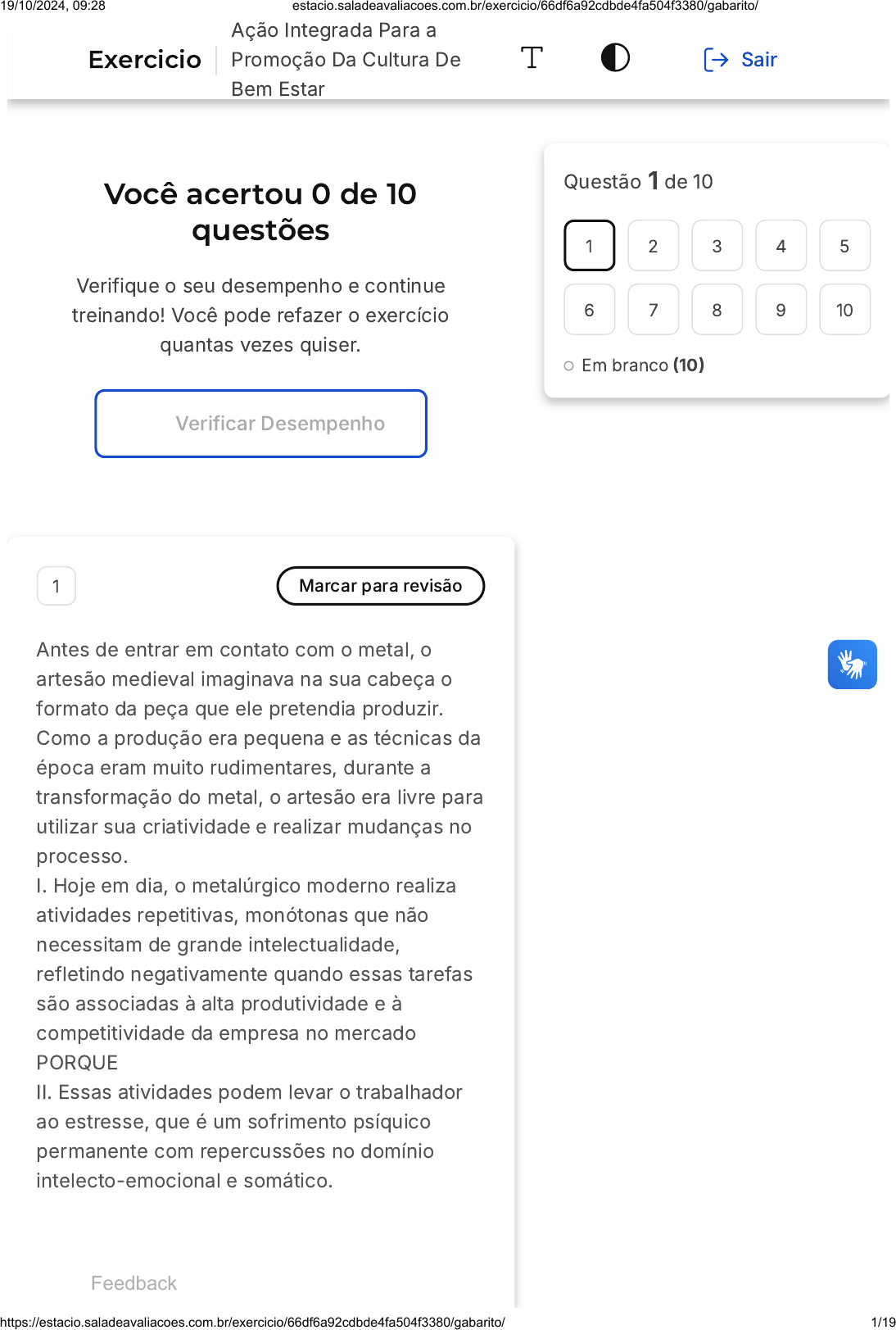 <p>Você acertou 0 de 10</p><p>questões</p><p>Verifique o seu desempenho e continue</p><p>treinando! Você pode refazer o exercício</p><p>quantas vezes quiser.</p><p>Verificar Desempenho</p><p>1 Marcar para revisão</p><p>Antes de entrar em contato com o metal, o</p><p>artesão medieval imaginava na sua cabeça o</p><p>formato da peça que ele pretendia produzir.</p><p>Como a produção era pequena e as técnicas da</p><p>época eram muito rudimentares, durante a</p><p>transformação do metal, o artesão era livre para</p><p>utilizar sua criatividade e realizar mudanças no</p><p>processo.</p><p>I. Hoje em dia, o metalúrgico moderno realiza</p><p>atividades repetitivas, monótonas que não</p><p>necessitam de grande intelectualidade,</p><p>refletindo negativamente quando essas tarefas</p><p>são associadas à alta produtividade e à</p><p>competitividade da empresa no mercado</p><p>PORQUE</p><p>II. Essas atividades podem levar o trabalhador</p><p>ao estresse, que é um sofrimento psíquico</p><p>permanente com repercussões no domínio</p><p>intelecto-emocional e somático.</p><p>Questão 1 de 10</p><p>Em branco �10�</p><p>1 2 3 4 5</p><p>6 7 8 9 10</p><p>Feedback</p><p>Exercicio</p><p>Ação Integrada Para a</p><p>Promoção Da Cultura De</p><p>Bem Estar</p><p>Sair</p><p>19/10/2024, 09:28 estacio.saladeavaliacoes.com.br/exercicio/66df6a92cdbde4fa504f3380/gabarito/</p><p>https://estacio.saladeavaliacoes.com.br/exercicio/66df6a92cdbde4fa504f3380/gabarito/ 1/19</p><p>A</p><p>B</p><p>C</p><p>D</p><p>E</p><p>Assinale a alternativa que apresenta a relação</p><p>correta entre as asserções I e II.</p><p>As asserções I e II são verdadeiras, e a</p><p>asserção II é uma justificativa da I.</p><p>As asserções I e II são verdadeiras,</p><p>mas a asserção II não é uma</p><p>justificativa da I.</p><p>A asserção I é falsa, mas a asserção II</p><p>é verdadeira.</p><p>A asserção II é falsa, mas a asserção I</p><p>é verdadeira.</p><p>As asserções I e II são falsas.</p><p>Questão não respondida</p><p>Opa! A alternativa correta é a letra</p><p>A. Confira o gabarito comentado!</p><p>Gabarito Comentado</p><p>A asserção I descreve a situação do</p><p>metalúrgico moderno, que realiza</p><p>atividades repetitivas e monótonas, que</p><p>não exigem grande intelectualidade. Isso</p><p>pode refletir negativamente quando essas</p><p>tarefas são associadas à alta produtividade</p><p>e à competitividade da empresa no</p><p>mercado. A asserção II, por sua vez,</p><p>justifica essa negatividade, explicando que</p><p>essas atividades podem levar o trabalhador</p><p>ao estresse, um sofrimento psíquico</p><p>permanente com repercussões no domínio</p><p>intelecto-emocional e somático. Portanto,</p><p>ambas as asserções são verdadeiras e a</p><p>19/10/2024, 09:28 estacio.saladeavaliacoes.com.br/exercicio/66df6a92cdbde4fa504f3380/gabarito/</p><p>https://estacio.saladeavaliacoes.com.br/exercicio/66df6a92cdbde4fa504f3380/gabarito/ 2/19</p><p>A</p><p>B</p><p>C</p><p>asserção II é uma justificativa da I, o que</p><p>torna a alternativa A a resposta correta.</p><p>2 Marcar para revisão</p><p>Desde as construções das pirâmides do Egito</p><p>existem estudos e descrições sobre doenças</p><p>relacionadas ao ambiente laboral. Entretanto,</p><p>embora estudada há séculos, a Medicina do</p><p>Trabalho não tinha relevância. No entanto,</p><p>I. A publicação do livro ''De Morbis Artificum</p><p>Diatriba'' �As Doenças dos Trabalhadores), em</p><p>1700, contendo doenças adquiridas pelos</p><p>trabalhadores relacionadas a 54 profissões, foi</p><p>de fato um avanço nesse campo da Medicina</p><p>PORQUE</p><p>II. Com essa publicação, de Bernardo</p><p>Ramazzini, considerado o Pai da Medicina do</p><p>Trabalho, ficou evidente que as doenças dos</p><p>trabalhadores eram advindas do ambiente</p><p>laboral. Isso fez com que a Medicina do</p><p>Trabalho passasse a ter enorme relevância</p><p>naquela época.</p><p>Assinale a alternativa que apresenta a relação</p><p>correta entre as asserções I e II.</p><p>As asserções I e II são verdadeiras, e a</p><p>asserção II é uma justificativa da I</p><p>As asserções I e II são verdadeiras,</p><p>mas a asserção II não é uma</p><p>justificativa da I</p><p>A asserção II é falsa, mas a asserção I</p><p>é verdadeira</p><p>19/10/2024, 09:28 estacio.saladeavaliacoes.com.br/exercicio/66df6a92cdbde4fa504f3380/gabarito/</p><p>https://estacio.saladeavaliacoes.com.br/exercicio/66df6a92cdbde4fa504f3380/gabarito/ 3/19</p><p>D</p><p>E</p><p>A asserção I é falsa, mas a asserção II</p><p>é verdadeira</p><p>As asserções I e II são falsas</p><p>Questão não respondida</p><p>Opa! A alternativa correta é a letra</p><p>C. Confira o gabarito comentado!</p><p>Gabarito Comentado</p><p>A asserção I é verdadeira, pois a</p><p>publicação do livro "De Morbis Artificum</p><p>Diatriba" por Bernardo Ramazzini, em 1700,</p><p>representou um avanço significativo no</p><p>campo da Medicina do Trabalho, ao</p><p>relacionar doenças adquiridas pelos</p><p>trabalhadores a 54 profissões diferentes.</p><p>No entanto, a asserção II é falsa. Apesar da</p><p>importância da obra de Ramazzini, a</p><p>Medicina do Trabalho não ganhou</p><p>relevância naquela época. Isso só ocorreu</p><p>durante a Revolução Industrial Inglesa, no</p><p>século XVIII, quando ficou evidente que as</p><p>doenças dos trabalhadores eram</p><p>contraídas no ambiente laboral. Na época</p><p>de Ramazzini, a maioria dos trabalhadores</p><p>era composta por escravos e indivíduos de</p><p>baixo nível social, o que fez com que a</p><p>Medicina do Trabalho não tivesse a</p><p>relevância esperada.</p><p>3 Marcar para revisão</p><p>A Psicologia Organizacional do Trabalho tem</p><p>como função melhorar a qualidade de vida</p><p>presente na relação entre os indivíduos com a</p><p>19/10/2024, 09:28 estacio.saladeavaliacoes.com.br/exercicio/6