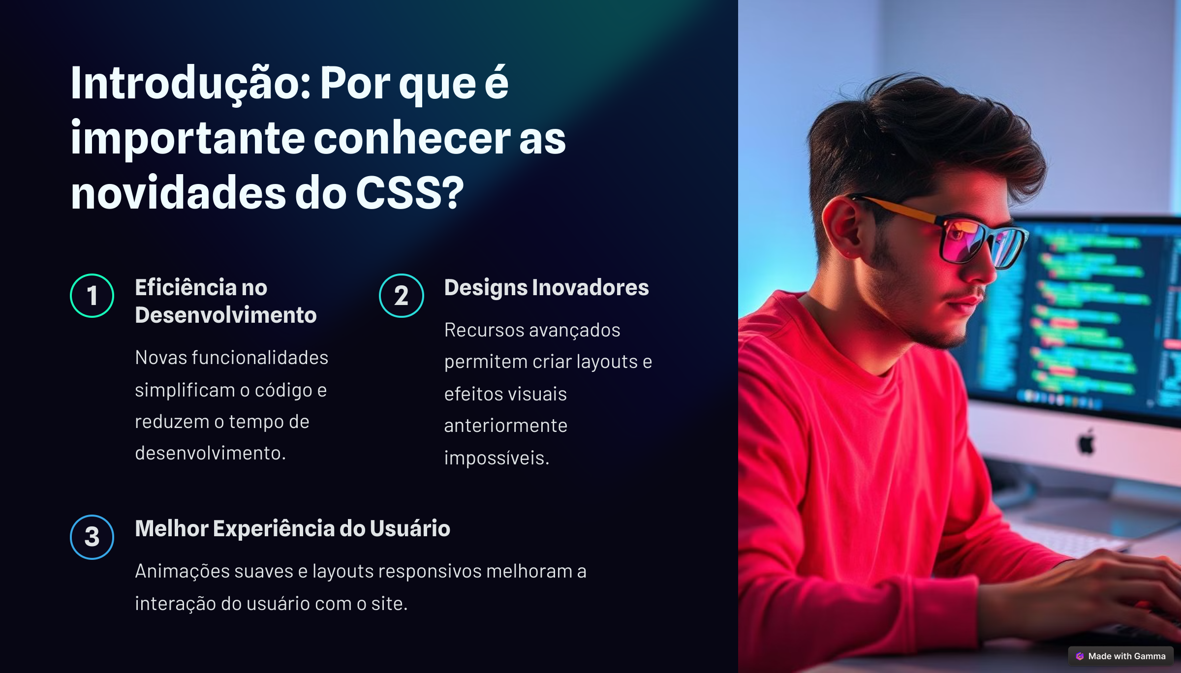 Introdução: Por que é importante conhecer as novidades do CSS? 1 Eficiência no 2 Designs Inovadores Desenvolvimento Recursos avançados Novas funcionalidades permitem criar layouts e simplificam código e efeitos visuais reduzem tempo de anteriormente desenvolvimento. impossíveis. 3 Melhor Experiência do Usuário Animações suaves e layouts responsivos melhoram a interação do usuário com O site.