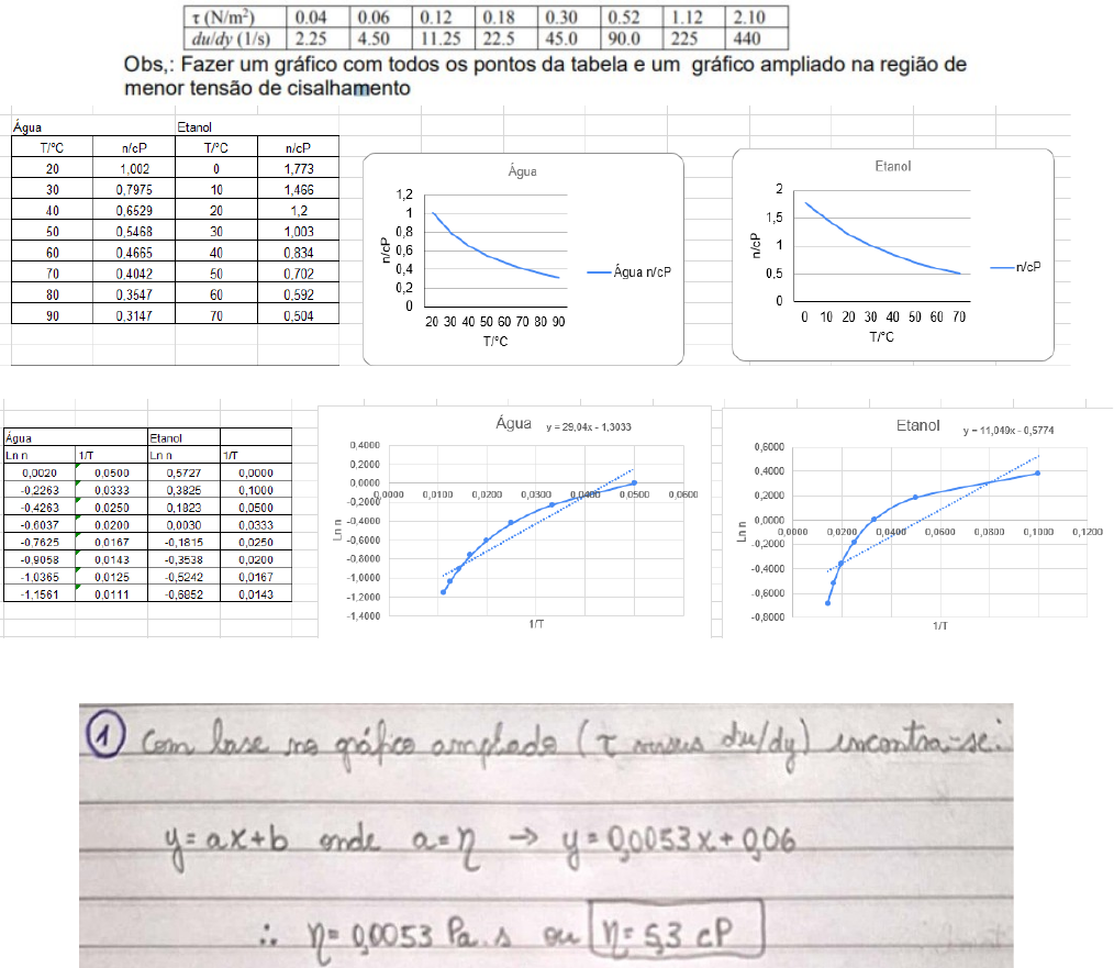 <p>Físico-química II Lista de exercícios 5B – Viscosidade de líquidos</p><p>1. A viscosidade do sangue pode ser determinada a partir de medidas de tensão de cisalhamento () e de gradiente de cisalhamento (du/dy) em um viscosímetro. Baseado nos dados abaixo, verifique se o sangue é um fluido newtoniano ou não newtoniano. Faça um gráfico de tensão de cisalhamento em função de gradiente de cisalhamento e determine a viscosidade aparente do sangue em um gradiente de cisalhamento de 15,0 s -1 .</p><p>3.A partir de valores da viscosidade de água e etanol em função da temperatura, (a) verifique se a viscosidade está de acordo com a equação de Guzmann Carrancio. Encontre graficamente o valor da energia de ativação para iniciar o fluxo das moléculas. Comparando os valores de viscosidade das duas substâncias em uma mesma temperatura, qual delas tem maior viscosidade? É esperada esta ordem de viscosidade para as substâncias. Explicar a resposta.</p><p>4.Um óleo lubrificante pesado tem a viscosidade de 6,6 P a 200C e densidade 0,97 g/mL.Qual a velocidade terminal da queda vertical de uma pequena esfera metálica (densidade 7,85 g/cm3 ) através do óleo ?O raio da esfera é de 0,12 cm. Dicas: i) verifique quais são as forças atuantes na esfera, ii) a velocidade terminal é constante.</p><p>5. A viscosidade de um fluido pode ser determinada usando um viscosímetro de uma esfera em queda. Uma esfera pesada move-se em queda lentamente através de um fluído. Determina-se a velocidade terminal (constante). Calcule a viscosidade de um óleo por este método, sabendo que a esfera tem diâmetro de 1,7 mm e densidade de 7,750 kg/m3 . O óleo tem densidade de 0,94 g/cm3 . A esfera cai em uma distância de 20 cm em 8,4 s</p><p>6. Prob. 30.14, Castellan, Physical Chemistry . Uma extremidade de um tubo capilar de 10 cm de comprimento é conectada horizontalmente à lateral de uma garrafa. A garrafa é cheia com água (densidade = 1,00 g/cm3 ; = 1,00 X 10-3 Pa.s) até uma profundidade de 25 cm acima do tubo capilar. A água escoa por gravidade através do tubo. Para coletar 200 cm3 de água requer 40,8 s. Qual é o diâmetro do tubo capilar? Suponha que a profundidade da água na garrafa não muda sensivelmente</p><p>7. Prob. 30.15, Castellan, Physical Chemistry. Um barril é cheio com azeite ( = 0,0840 Pa.s ; densidade = 0,918 g/cm3 ) até uma profundidade de 1 metro. O óleo flui por gravidade para uma garrafa através de um tubo preso na lateral no fundo barril. O diâmetro interno do tubo é de 13 mm; seu comprimento é de 20 cm. Quanto tempo é necessário para coletar um litro de óleo na garrafa?</p><p>9. A velocidade do fluxo de um líquido através de um tubo cilíndrico que tem um diâmetro interno de 0,12 cm e um comprimento de 26 cm é de 364 cm3 em 88 s. A queda de pressão entre as extremidades do tubo é de 57 torr. A densidade do líquido é de 0,98 g.cm-3 . Calcule a viscosidade do líquido. O fluxo é laminar ? Para verificar se o fluxo é laminar, utilizar o número Reynolds, dado por: 𝑅𝑒 = 𝜌𝑣𝐷/ é a densidade do fluido, v = velocidade do fluido, D = diâmetro do tubo, = viscosidade do fluido Re 4000 : fluxo turbulento 2100</p>