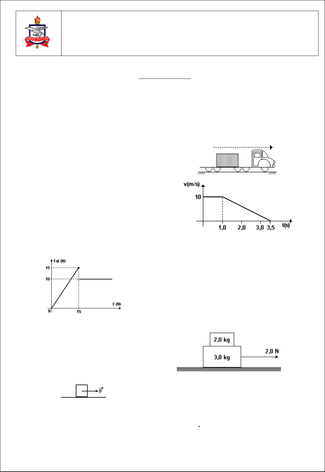 <p>Considere: g = 10 m/s2.</p><p>Lista de exercícios 6</p><p>1. Um bloco de massa 8 kg é puxado por uma força</p><p>horizontal de 20N. Sabendo que a força de atrito entre o bloco e a</p><p>superfície é de 2N, calcule a aceleração a que fica sujeito o bloco.</p><p>2. Um bloco de massa 10 kg movimenta-se numa mesa</p><p>horizontal sob a ação de uma força horizontal de 30 N. A força de</p><p>atrito entre o bloco e a mesa vale 20 N. Determine a aceleração do</p><p>corpo.</p><p>3. Um bloco de massa 2 kg é deslocado horizontalmente</p><p>por uma força F = 10 N, sobre um plano horizontal. A aceleração</p><p>do bloco é 0,5 m/s2. Calcule a força de atrito.</p><p>4. Um sólido de massa 5 kg é puxado sobre um plano</p><p>horizontal por uma força horizontal de 25 N. O coeficiente de atrito</p><p>entre o sólido e o plano é 0,2.</p><p>a) Qual a força de atrito?</p><p>b) Qual é a aceleração do corpo?</p><p>5. (Puc/SP alterada) Um bloco de borracha de massa 5,0</p><p>kg está em repouso sobre uma superfície plana e horizontal. O</p><p>gráfico representa como varia a força de atrito sobre o bloco</p><p>quando sobre ele atua uma força F de intensidade variável</p><p>paralela à superfície.</p><p>Determine:</p><p>a) o coeficiente de atrito estático entre a borracha e a superfície.</p><p>b) a aceleração adquirida pelo bloco quando a intensidade da</p><p>força F atinge 30N.</p><p>6. O bloco da figura, de massa 5,0 kg, move-se com velocidade</p><p>constante de 1,0 m/s, num plano horizontal, sob a ação da força �⃗�,</p><p>constante e horizontal.</p><p>Se o coeficiente de atrito entre o bloco e o plano vale 0,20,</p><p>determine:</p><p>a) a aceleração do bloco.</p><p>b) o módulo de �⃗�, em newtons.</p><p>7. (UFRJ) Um caminhão está se deslocando numa estrada</p><p>plana, retilínea e horizontal. Ele transporta uma caixa de 100 kg</p><p>apoiada sobre o piso horizontal de sua carroceria, como mostra a</p><p>figura.</p><p>Num dado instante, o motorista do caminhão pisa o freio. A figura</p><p>a seguir representa, em gráfico cartesiano, como a velocidade do</p><p>caminhão variam em função do tempo.</p><p>O coeficiente de atrito estático entre a caixa e o piso da carroceria</p><p>vale 0,30.</p><p>Verifique se, durante a freada, a caixa permanece em repouso em</p><p>relação ao caminhão ou desliza sobre o piso da carroceria.</p><p>Justifique sua resposta.</p><p>8. (Unesp 2004) Um bloco de massa 2,0 kg repousa sobre outro</p><p>de massa 3,0 kg, que pode deslizar sem atrito sobre uma</p><p>superfície plana e horizontal. Quando uma força de intensidade 2,0</p><p>N, agindo na direção horizontal, é aplicada ao bloco inferior, como</p><p>mostra a figura, o conjunto passa a se movimentar sem que o</p><p>bloco superior escorregue sobre o inferior.</p><p>Nessas condições, determine</p><p>a) a aceleração do conjunto.</p><p>b) a intensidade da força de atrito entre os dois blocos.</p><p>9. (UFPE/2010) Considere dois blocos empilhados, A e B, de</p><p>massas mA = 1,0 kg e mB = 2,0 kg. Com a aplicação de uma força</p><p>horizontal F sobre o bloco A, o conjunto move-se sem ocorrer</p><p>deslizamento entre os blocos. O coeficiente de atrito estático entre</p><p>UNIVERSIDADE FEDERAL DO PARÁ</p><p>CAMPUS: ______________________________ CURSO: _____________________</p><p>ALUNO:_____________________________________________________________</p><p>DISCIPLINA: FÍSICA 1</p><p>2</p><p>as superfícies dos blocos A e B é igual a 0,60, e não há atrito entre</p><p>o bloco B e a superfície horizontal. Determine o valor máximo do</p><p>módulo da força F , em newtons, para que não ocorra</p><p>deslizamento entre os blocos.</p><p>10. (Unesp 2006) Dois blocos, A e B, com A colocado sobre B,</p><p>estão em movimento sob ação de uma força horizontal de 4,5 N</p><p>aplicada sobre A, como ilustrado na figura.</p><p>Considere que não há atrito entre o bloco B e o solo e que as</p><p>massas são respectivamente mA = 1,8 kg e mB = 1,2 kg. Tomando</p><p>g = 10 m/s2, calcule</p><p>a) a aceleração dos blocos, se eles se locomovem juntos.</p><p>b) o valor mínimo do coeficiente de atrito estático para que o bloco</p><p>A não deslize sobre B.</p><p>11. (Ufrj 2007) Um sistema é constituído por um barco de 100</p><p>kg, uma pessoa de 58 kg e um pacote de 2,0 kg que ela carrega</p><p>consigo. O barco é puxado por uma corda de modo que a força</p><p>resultante sobre o sistema seja constante, horizontal e de módulo</p><p>240 newtons.</p><p>Supondo que não haja movimento relativo entre as partes do</p><p>sistema, calcule o módulo da força horizontal que a pessoa exerce</p><p>sobre o pacote.</p><p>12. (UFAL/2004) Um corpo, de massa 0,20 kg, é comprimido</p><p>contra uma parede vertical por meio de uma força horizontal F</p><p></p><p>de</p><p>intensidade 8,0 N e fica, nessas condições, prestes a escorregar</p><p>para baixo.</p><p>Calcule:</p><p>a) o coeficiente de atrito estático entre o corpo e a parede;</p><p>b) o valor da força de atrito se F</p><p></p><p>passar a ter intensidade</p><p>de 16 N.</p><p>13. Um bloco de massa m = 2,0 kg está sobre um plano</p><p>inclinado 37° em relação à horizontal, como mostra a figura:</p><p>(Dados: μe = 0,50 e μc = 0,40).</p><p>a) O bloco se desloca? Justifique.</p><p>b) Em caso afirmativo, qual o módulo da aceleração</p><p>do bloco?</p><p>14. Sob a ação da força �⃗� constante, o bloco representado na</p><p>figura abaixo sobe o plano inclinado.</p><p>Dados: m = 2,0 kg, massa do bloco; μc = 0,20, coeficiente de atrito</p><p>cinético entre o bloco e o plano.</p><p>Determine o módulo da força �⃗� supondo que o bloco tenha:</p><p>a) aceleração de módulo constante de 1,0 m/s2, no mesmo sentido</p><p>da força;</p><p>b) velocidade constante no sentido ascendente;</p><p>c) aceleração de módulo constante de 1,0 m/s2, no sentido oposto</p><p>à força.</p><p>15. Na situação esquematizada na fig