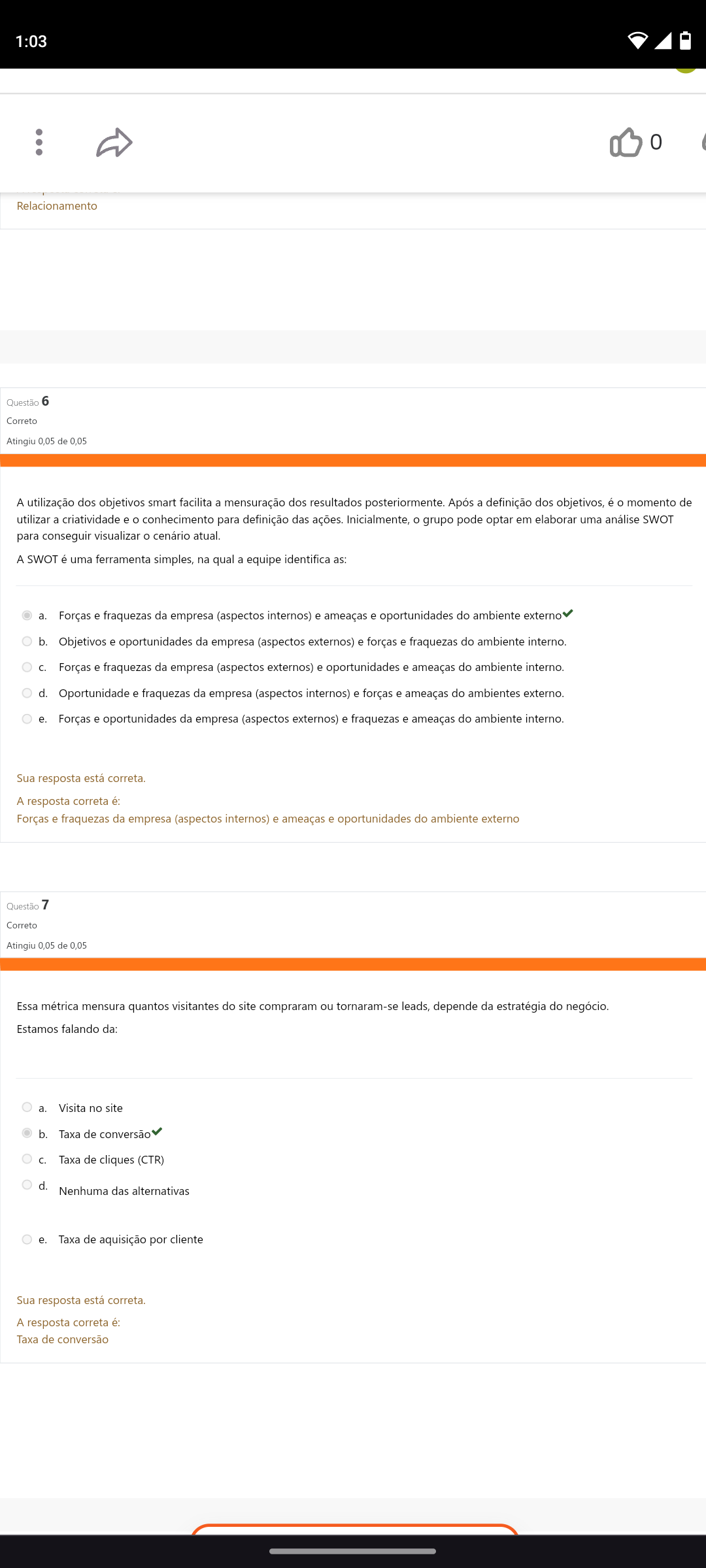 0 Relacionamento Questão 6 Correto Atingiu 0.05 de 0.05 A utilização dos objetivos smart facilita a mensuração dos resultados posteriormente. Após a definição dos objetivos, é o momento de utilizar a criatividade e conhecimento para definição das ações. Inicialmente, o grupo pode optar em elaborar uma análise SWOT para conseguir visualizar o cenário atual. A SWOT é uma ferramenta simples, na qual a equipe identifica a. Forças e fraquezas da empresa (aspectos internos) e ameaças e oportunidades do ambiente externo b. Objetivos e oportunidades da empresa (aspectos externos) e forças e fraquezas do ambiente interno. C. Forças e fraquezas da empresa (aspectos externos) e oportunidades e ameaças do ambiente interno. d. Oportunidade e fraquezas da empresa (aspectos internos) e forças e ameaças do ambientes externo. e. Forças e oportunidades da empresa (aspectos externos) e fraquezas e ameaças do ambiente interno. Sua resposta está correta. A resposta correta é: Forças e fraquezas da empresa (aspectos internos) e ameaças e oportunidades do ambiente externo Questão 7 Correto Atingiu de Essa métrica mensura quantos visitantes do site compraram ou tornaram-se leads, depende da estratégia do negócio. Estamos falando da: a. Visita no site b. Taxa de conversão Taxa de cliques (CTR) d. Nenhuma das alternativas Taxa de aquisição por cliente Sua resposta está correta. A resposta correta é: Taxa de conversão