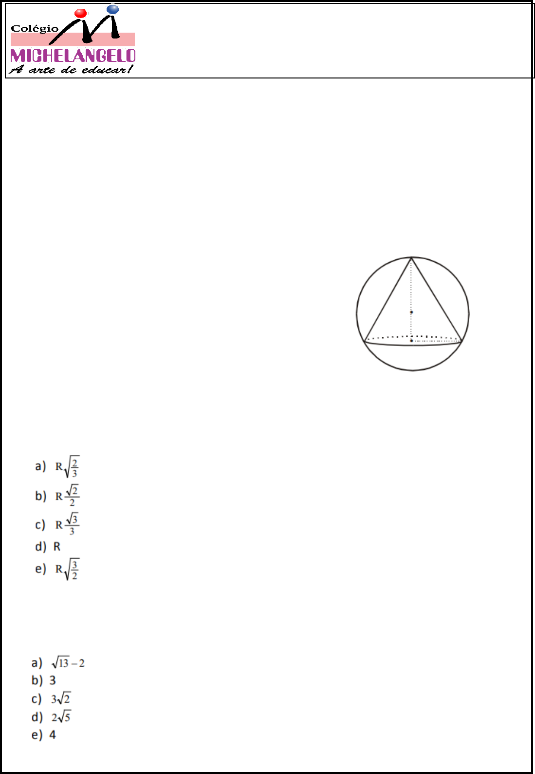 <p>Estudo da Esfera</p><p>1 Uma esfera tem raio 15cm. Calcule:</p><p>a) Seu volume</p><p>b) Sua área</p><p>c) A área da secção feita a 9cm do centro</p><p>2 Um cone circular reto, cujo raio da base é 3 cm, está inscrito em uma esfera de raio 5 cm, conforme</p><p>mostra a figura a seguir. O volume do cone corresponde a que porcentagem do volume da esfera. . .</p><p>a) 26,4%</p><p>b) 21,4%</p><p>c) 19,5%</p><p>d) 18,6%</p><p>e) 16,2%</p><p>Gab E</p><p>3 Um cubo de aresta m está inscrito em uma semi-esfera de raio R de tal modo que os vértices de uma</p><p>das faces pertencem ao plano equatorial da semi-esfera e as demais vértices pertencem à superfície da</p><p>semi-esfera. Então, m é igual a</p><p>Gab E</p><p>4 Um cilindro de raio r está inscrito em uma esfera de raio 5, como indica a figura ao lado. Obtenha o maior</p><p>valor de x, de modo que o volume desse cilindro seja igual a 72π.</p><p>Gab E</p><p>Aluno (a): ____________________________________________________________</p><p>Série: 3º ano EM Data 11/ 10 /2024</p><p>Disciplina: Matemática Professor (a): Márcio Henrique</p><p>5 Uma empresa que fabrica esferas de aço, de 6 cm de raio, utiliza caixas de madeira, na forma de um</p><p>cubo, para transportá-las. Sabendo que a capacidade da caixa é de 13.824 cm3 , então o número máximo</p><p>de esferas que podem ser transportadas em uma caixa é igual a</p><p>a) 4.</p><p>b) 8.</p><p>c) 16</p><p>d) 24.</p><p>e) 32.</p><p>Gab: B</p><p>6 Uma fábrica de chocolate produz uma caixa de bombons na forma de um paralelepípedo cujas dimensões</p><p>estão representadas na Figura 1 abaixo. Ao comemorar 100 anos de existência, a fábrica decide fazer duas</p><p>embalagens comemorativas em forma de esferas. A primeira esfera deverá ter a mesma área da antiga</p><p>caixa e a segunda esfera será feita de tal maneira que o seu raio seja o dobro do raio da primeira esfera.</p><p>Estas novas embalagens serão encaixotadas em caixas cúbicas, de modo que as esferas fiquem inscritas</p><p>nos cubos, como mostrado na Figura 2.</p><p>Nestas condições, qual o volume, em cm3 , da caixa cúbica que conterá a segunda esfera?</p><p>Gab E</p><p>7 Um troféu para um campeonato de futebol tem a forma de uma esfera de raio R = 10 cm cortada por um</p><p>plano situado a uma distância de 5 3 cm do centro da esfera, determinando uma circunferência de raio r</p><p>cm, e sobreposta a um cilindro circular reto de 20 cm de altura e raio r cm, como na figura (não em escala).</p><p>O volume do cilindro, em cm3 , é</p><p>Gab E</p><p>8 Um sorvete em uma casquinha é um sólido completamente cheio cuja parte externa tem a forma de um</p><p>cone circular reto invertido de altura H = 12 cm e raio R = 6 cm e uma semi-esfera sobreposta à base do</p><p>cone, conforme figura 1. Parte do sorvete é consumida por Lúcia, e o restante tem a forma de um cone</p><p>circular reto completamente cheio de altura h = 4 cm, conforme figura 2.</p><p>Supondo que não haja perda de volume além do que Lúcia consome, o volume consumido por Lúcia foi</p><p>de:</p><p>Gab B</p><p>9 A ideologia dominante também se manifesta por intermédio do acesso aos produtos do mercado,</p><p>sobretudo daqueles caracterizados por tecnologias de ponta. O “Cubo Magnético” é um brinquedo</p><p>constituído por 216 esferas iguais e imantadas. Supondo que esse brinquedo possa ser colocado</p><p>perfeitamente ajustado dentro de uma caixa, também no formato de um cubo, com aresta igual a 30 mm,</p><p>a razão entre o volume total das esferas que constituem o “Cubo Magnético” e o volume da caixa que lhe</p><p>serve de depósito é:</p><p>Gab A</p><p>10 Suponha que haja laranjas no formato de uma esfera com 6 cm de diâmetro e que a quantidade de suco</p><p>que se obtém ao espremer cada laranja é 2/3 de seu volume, sendo o volume dado em litros. Nessas</p><p>condições, se quiser obter 1 litro de suco de laranja, deve-se espremer no mínimo Use π = 3,14. a) 13</p><p>laranjas</p><p>b) 14 laranjas</p><p>c) 15 laranjas</p><p>d) 16 laranjas</p><p>Gab: B</p><p>11 Considere uma esfera de raio medindo R e um plano que a tangencia. Pode-se associar a ela um outro</p><p>sólido, obtido da seguinte maneira: • constrói-se um cilindro equilátero de raio R com uma das bases contida</p><p>no plano; • retira-se desse cilindro dois cones circulares, sendo que a base de cada um deles coincide com</p><p>uma das bases do cilindro e os vértices coincidem em V, no centro desse cilindro. O sólido que resta após</p><p>a retirada dos cones é chamado de anticlepsidra e tem o mesmo volume da esfera. Ambos os sólidos estão</p><p>representados na figura abaixo.</p><p>Uma anticlepsidra tem volume igual a π. O raio da esfera associada tem medida</p><p>Gab B</p><p>12 Um observador colocado no centro de uma esfera de raio 5 m vê o arco AB sob um ângulo α de 72º,</p><p>como mostra a figura. Isso significa que a área do fuso esférico determinado por α é</p><p>a) 20 π m2 .</p><p>b) 15 π m2 .</p><p>c) 10 π m2 .</p><p>d) 5 π m2 .</p><p>e) π m2 .</p><p>14 Temos sete esferas com o mesmo raio em um recipiente cilíndrico reto. Uma delas é tangente a seis</p><p>outras, seis esferas são tangentes à superfície lateral e todas são tangentes à base e à tampa desse</p><p>recipiente. Um corte transversal do cilindro passando pelo centro de todas as esferas é dado no desenho</p><p>abaixo. Se os raios das esferas medem 1m, qual o volume do cilindro menos o volume ocupado pelas</p><p>esferas?</p><p>Gab E</p><p>15 Duas esferas de raios 3m e 4m têm centro no eixo de um cone onde estão inscritas (conforme figura</p><p>abaixo). Sabendo-se que as esferas são tangentes entre si e também ao cone, a altura h do cone, em</p><p>metros, mede</p><p>Gab B</p>